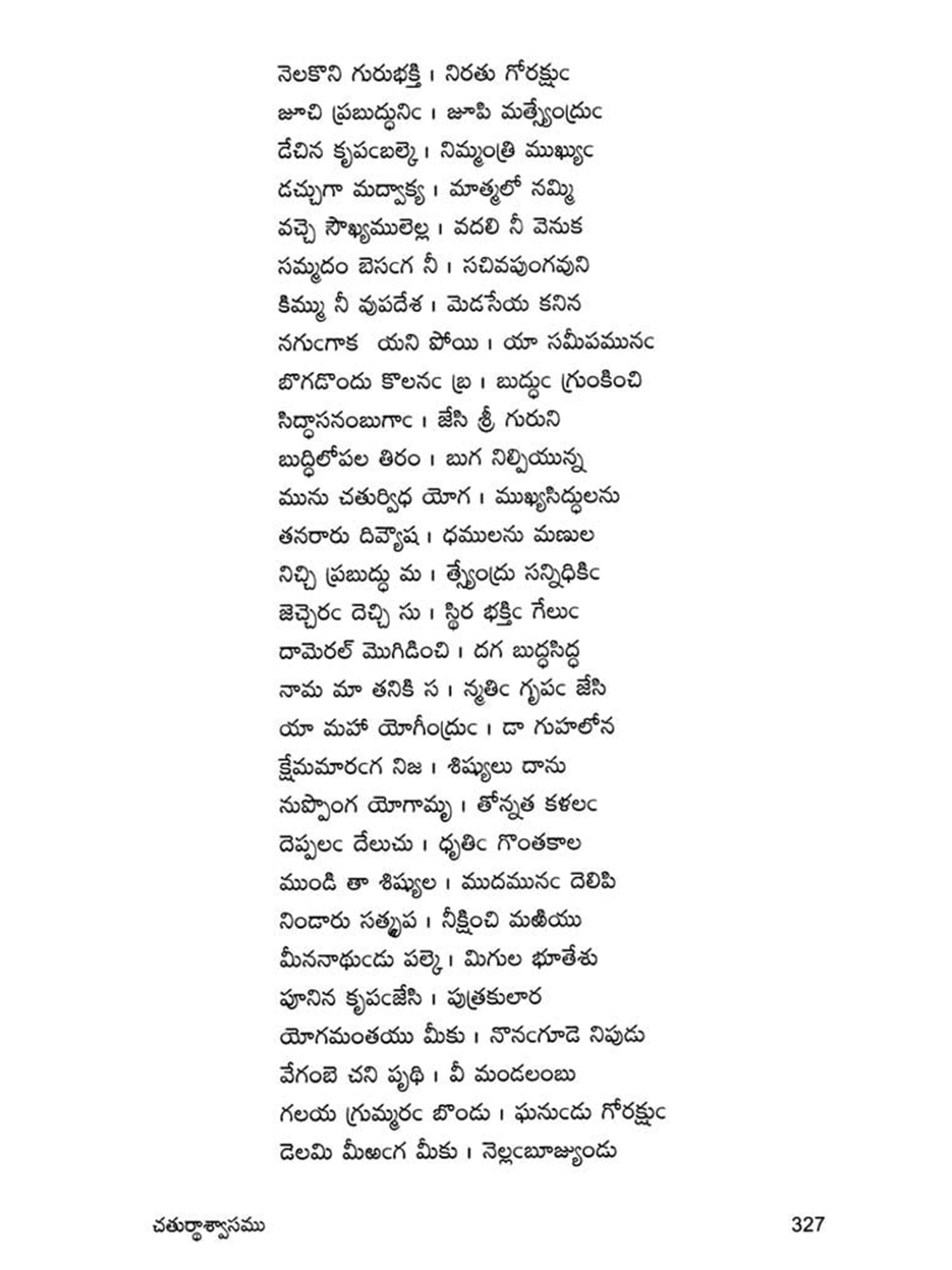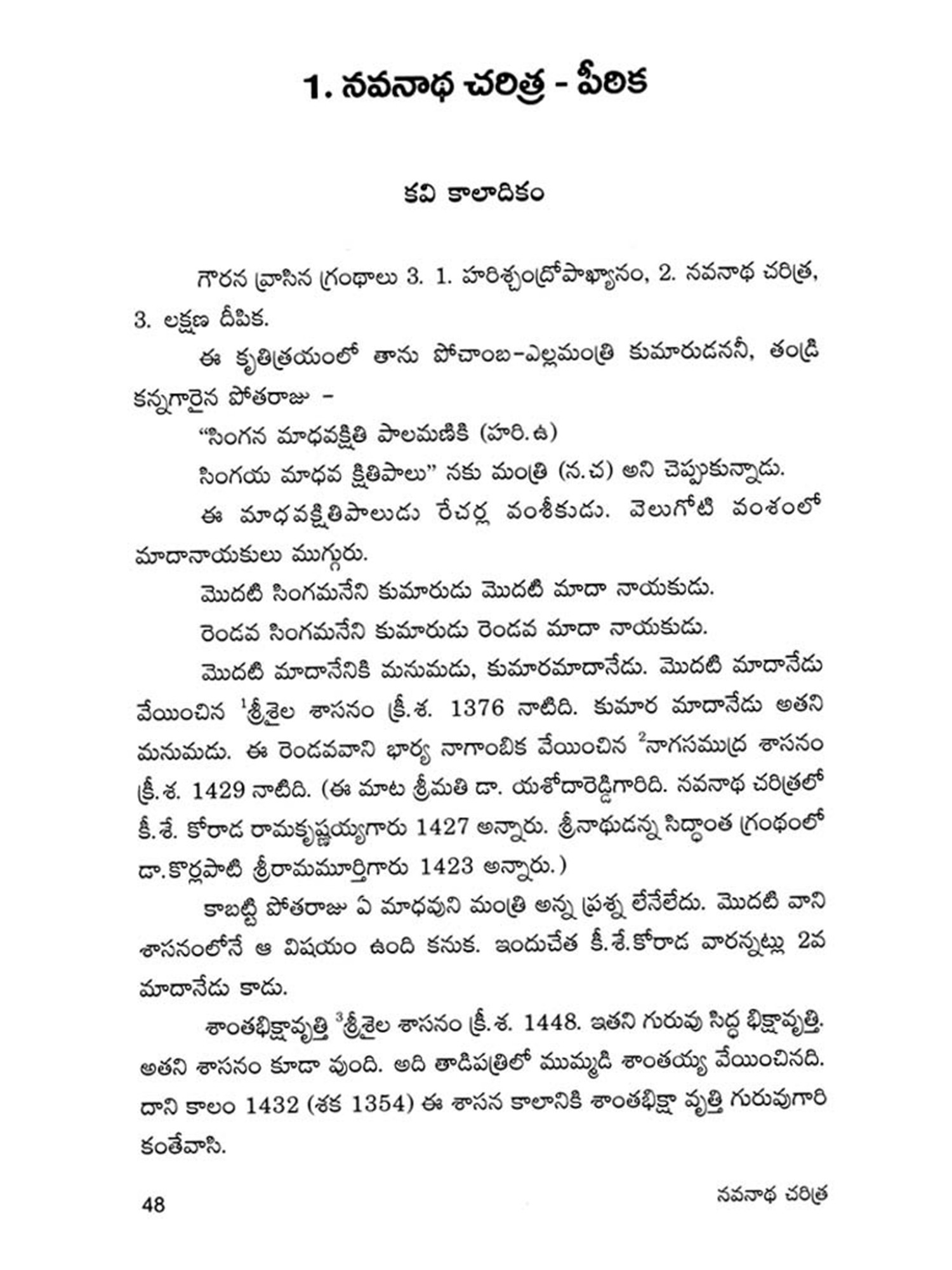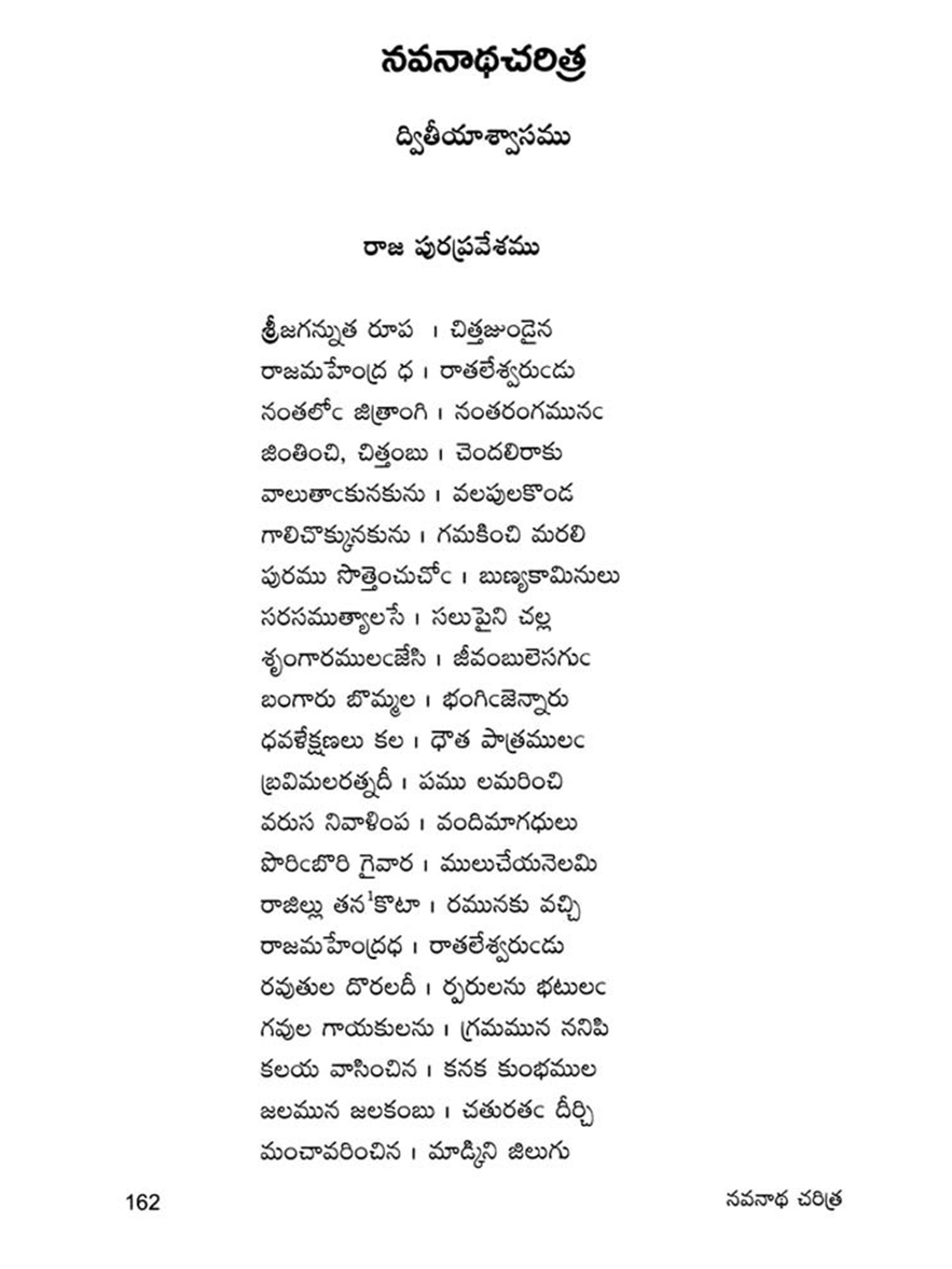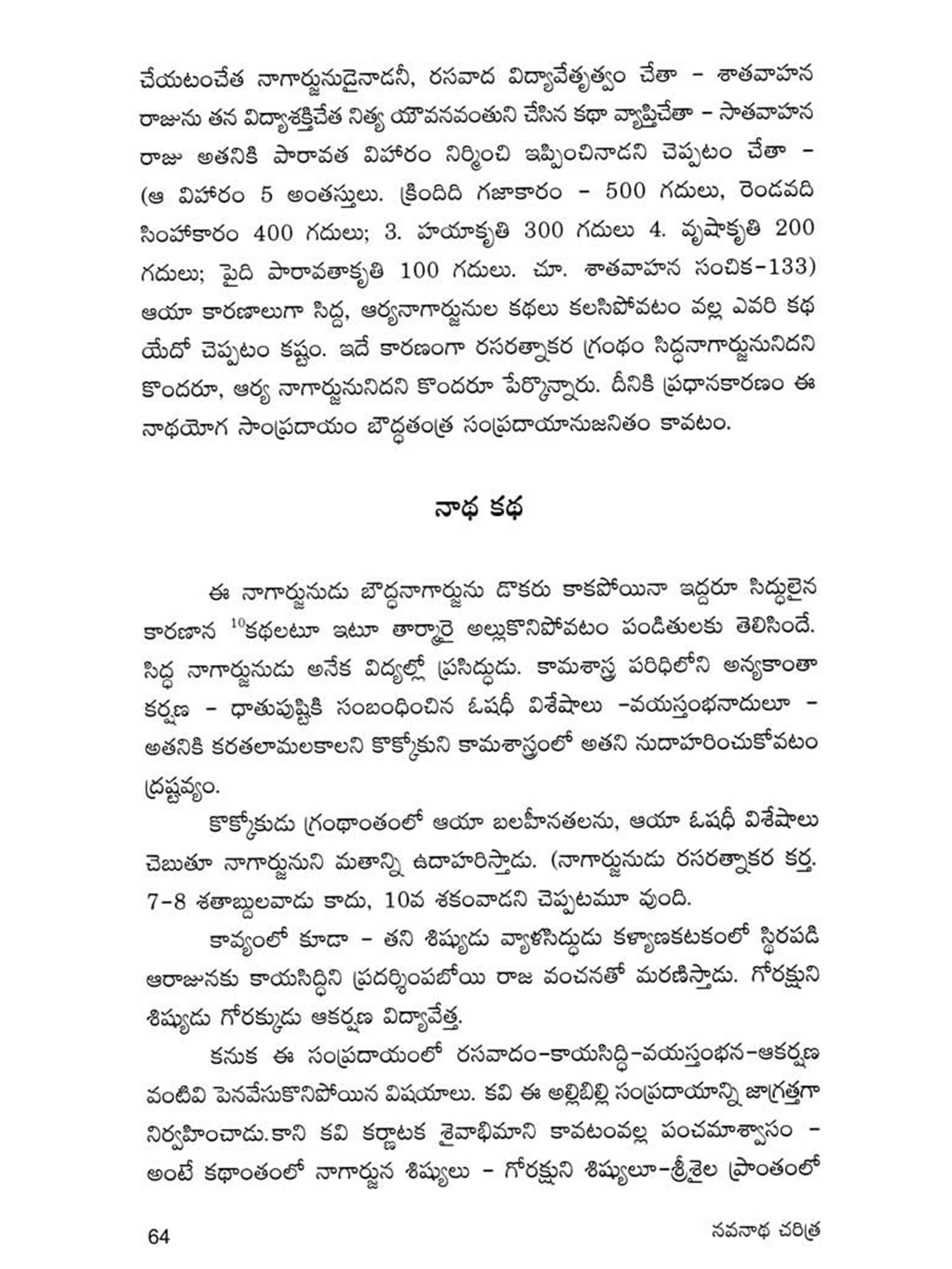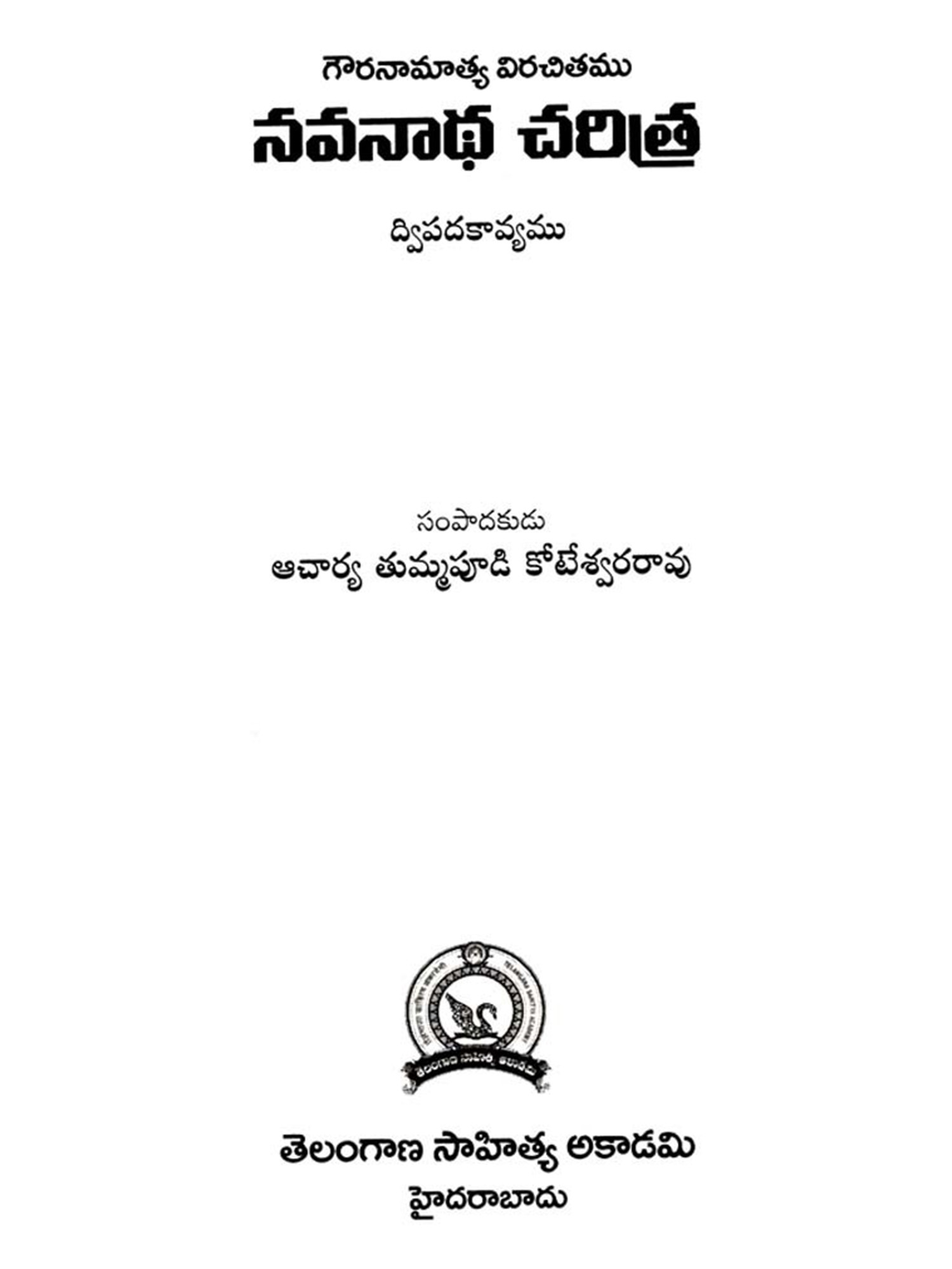 Navanadhacharitra is a classical poem in Dvipada metre composed by Gauranamatya who belonged to the middle of the fifteenth century. Poet Gaurana is already known to the Telugu world by his Harischandra Dvipada which is considered a work of high literary merit in the Telugu Literature of the middle period. Sankara Kavi of a latter age has followed this Dvipada Hari schandra of Gaurana in his rendering of the story of Harischandra into Champu form. This Navanadhacharitra, the only other Telugu work of the poet Gaurana, yet unpublished, is a Saivite work describing the adventures of Navanadhas, i.e., the nine Nadhas or Yogic Siddhas, the most important personage among them being the Meenanadha who is said to be the son of Siva and Parvati, sent to this world for the propagation of the Saivite religion and faith. It is significant that Gaurana, has like his great predecessor and Saivite poet Palkuriki Somanadha, adopted Dvipada metre for his poetic composition, while adding classical dignity to the poem according to the manner of his age. Though most of the important works of the period have taken the Champu form, works generally intended for popular apeal were still being written in the simple indigenous form of Dvipada. Palkuriki Somanadha has declared in the Introduction to his works that he undertook to write in what is called Janu-Telugu and Dvipada metre, because the Sanskritic style adopted by the Champu writers could not easily be understood by the general masses. That is why perhaps though Bharata and Ramayana were translated into Telugu in the Champu form by eminent hands, these were rendered again into the Dvipada form by later poets. Since the upper classes of the society were most influenced by Brahmanism, the appeal of the Saivites was generally made to the masses and so they have chosen the simple Dvipada form for their literary compositions. Even this story of Navanadhas has already been written in Champu form, (i.e., as a Padya Prabandha) by one Srigiri Kavi, and the poet Gaurana rendered it into a dvipada form as required by his patron, to popularise it among the masses.