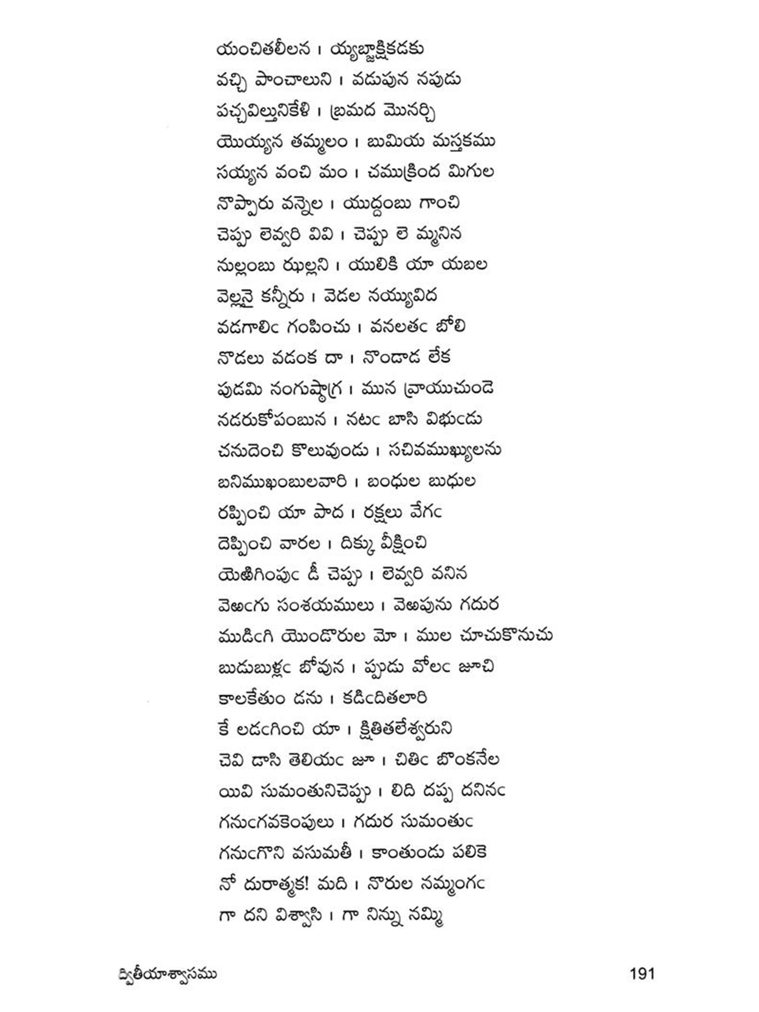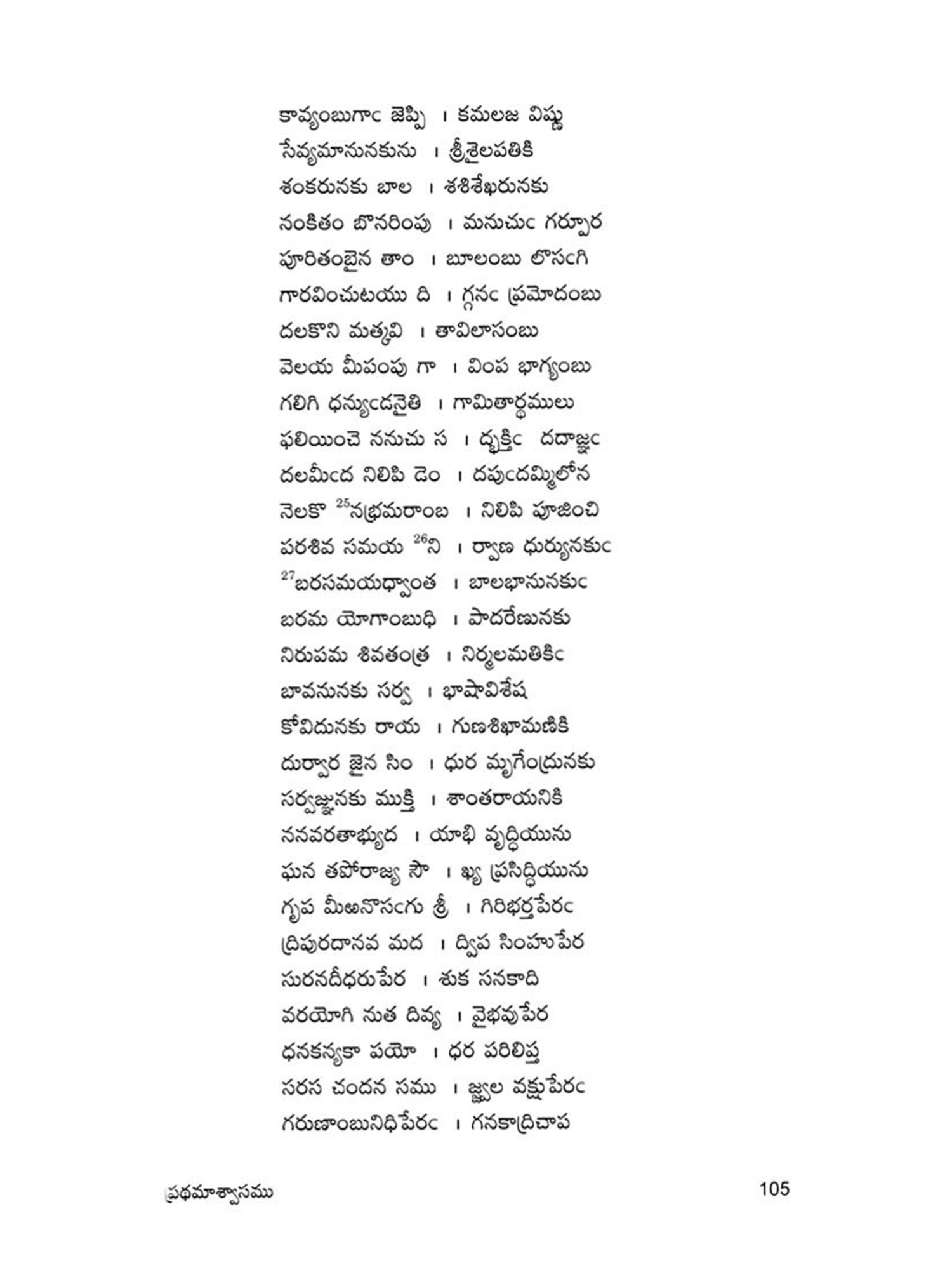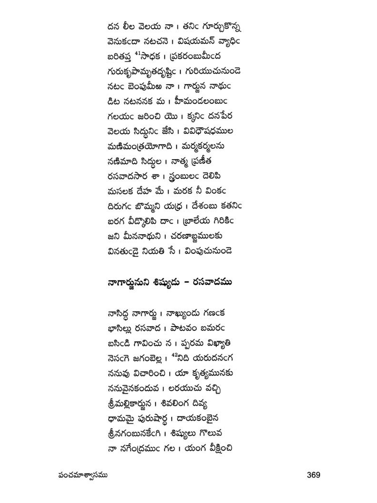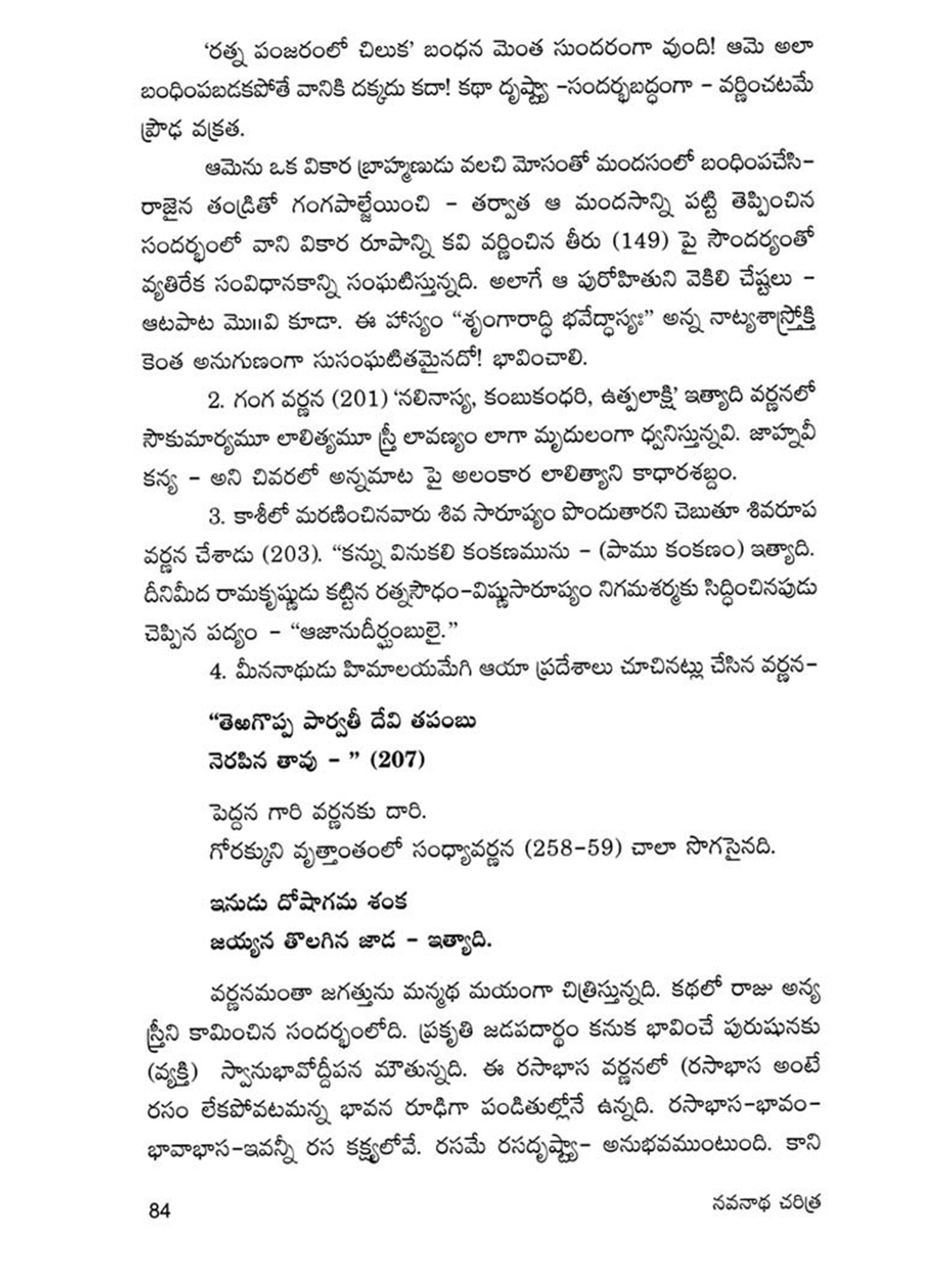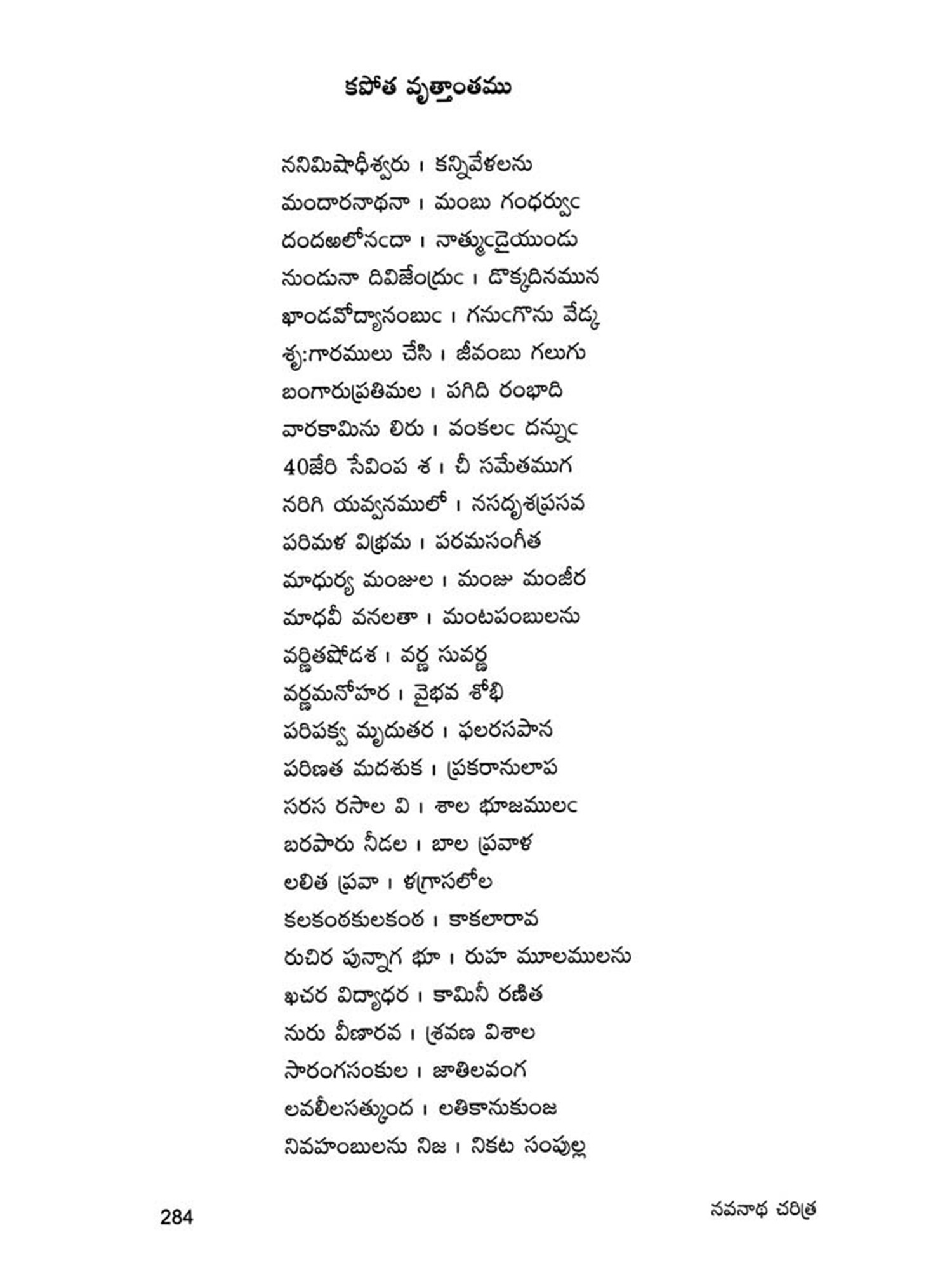 Navanadhacharitra is a classical poem in Dvipada metre composed by Gauranamatya who belonged to the middle of the fifteenth century. Poet Gaurana is already known to the Telugu world by his Harischandra Dvipada which is considered a work of high literary merit in the Telugu Literature of the middle period. Sankara Kavi of a latter age has followed this Dvipada Hari schandra of Gaurana in his rendering of the story of Harischandra into Champu form. This Navanadhacharitra, the only other Telugu work of the poet Gaurana, yet unpublished, is a Saivite work describing the adventures of Navanadhas, i.e., the nine Nadhas or Yogic Siddhas, the most important personage among them being the Meenanadha who is said to be the son of Siva and Parvati, sent to this world for the propagation of the Saivite religion and faith. It is significant that Gaurana, has like his great predecessor and Saivite poet Palkuriki Somanadha, adopted Dvipada metre for his poetic composition, while adding classical dignity to the poem according to the manner of his age. Though most of the important works of the period have taken the Champu form, works generally intended for popular apeal were still being written in the simple indigenous form of Dvipada. Palkuriki Somanadha has declared in the Introduction to his works that he undertook to write in what is called Janu-Telugu and Dvipada metre, because the Sanskritic style adopted by the Champu writers could not easily be understood by the general masses. That is why perhaps though Bharata and Ramayana were translated into Telugu in the Champu form by eminent hands, these were rendered again into the Dvipada form by later poets. Since the upper classes of the society were most influenced by Brahmanism, the appeal of the Saivites was generally made to the masses and so they have chosen the simple Dvipada form for their literary compositions. Even this story of Navanadhas has already been written in Champu form, (i.e., as a Padya Prabandha) by one Srigiri Kavi, and the poet Gaurana rendered it into a dvipada form as required by his patron, to popularise it among the masses.