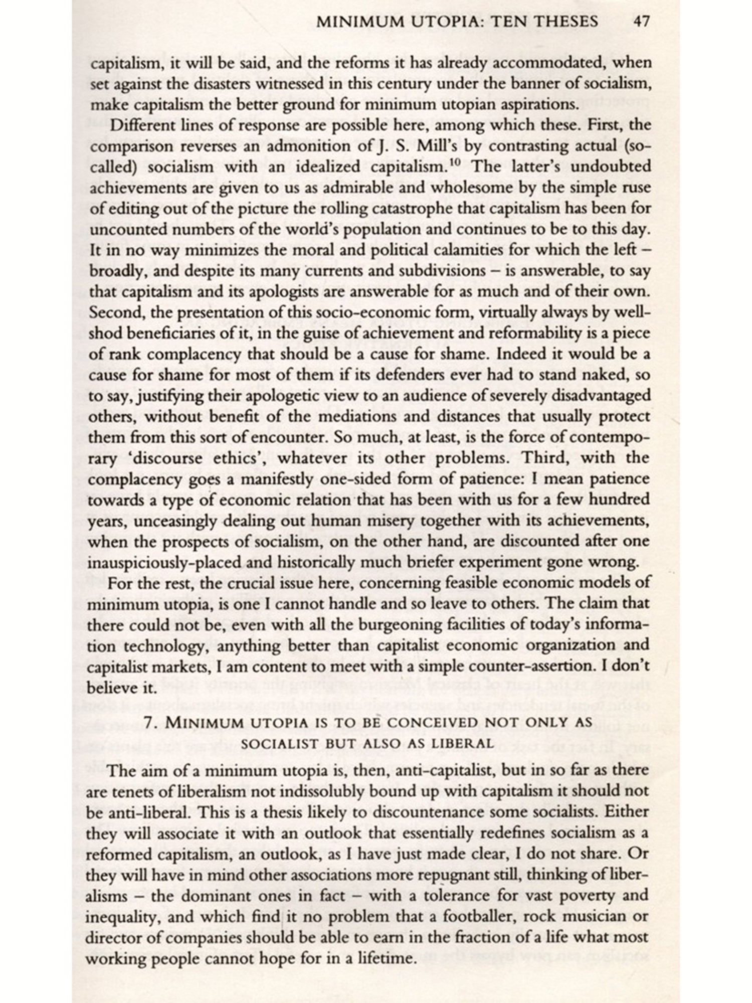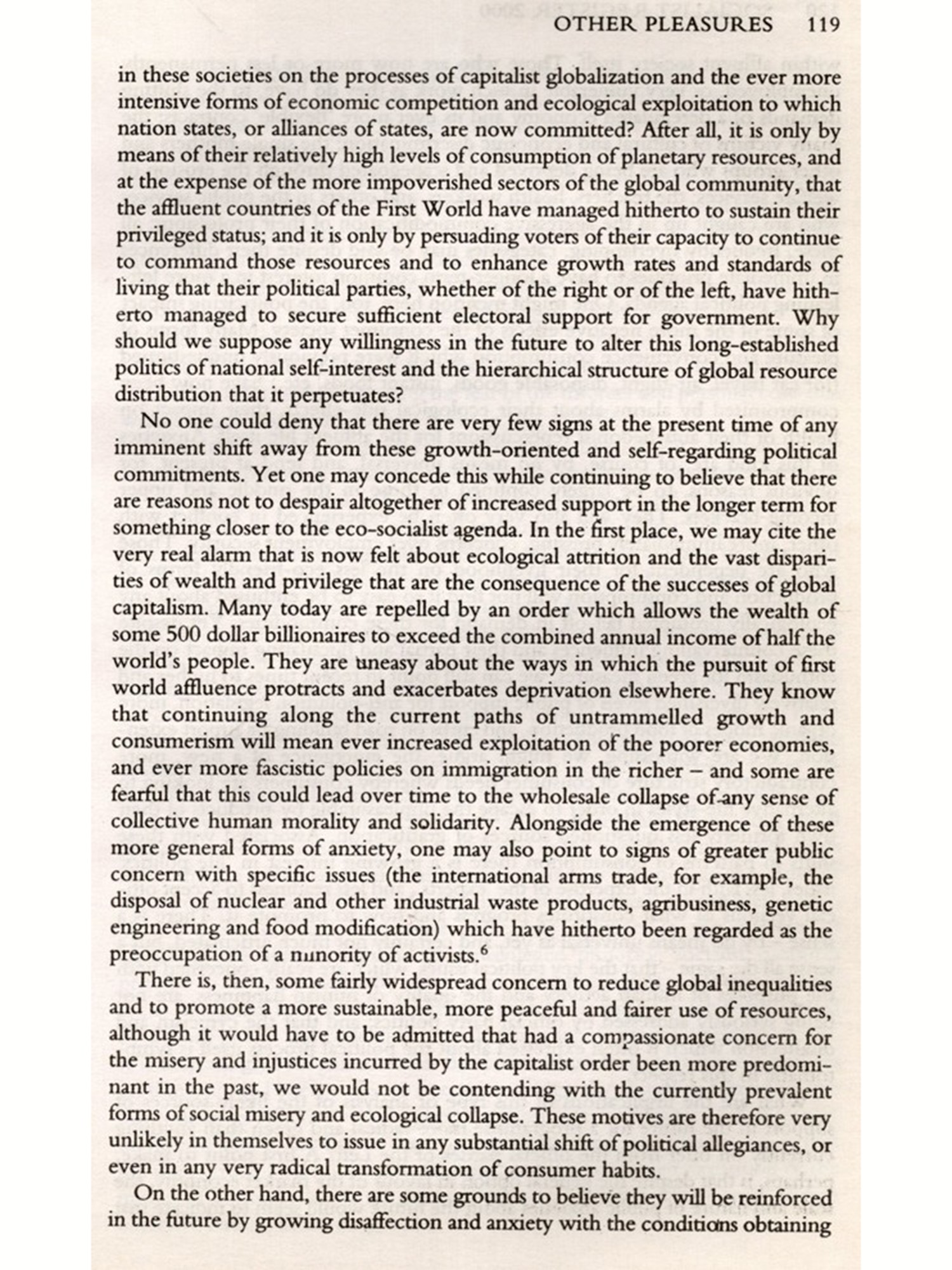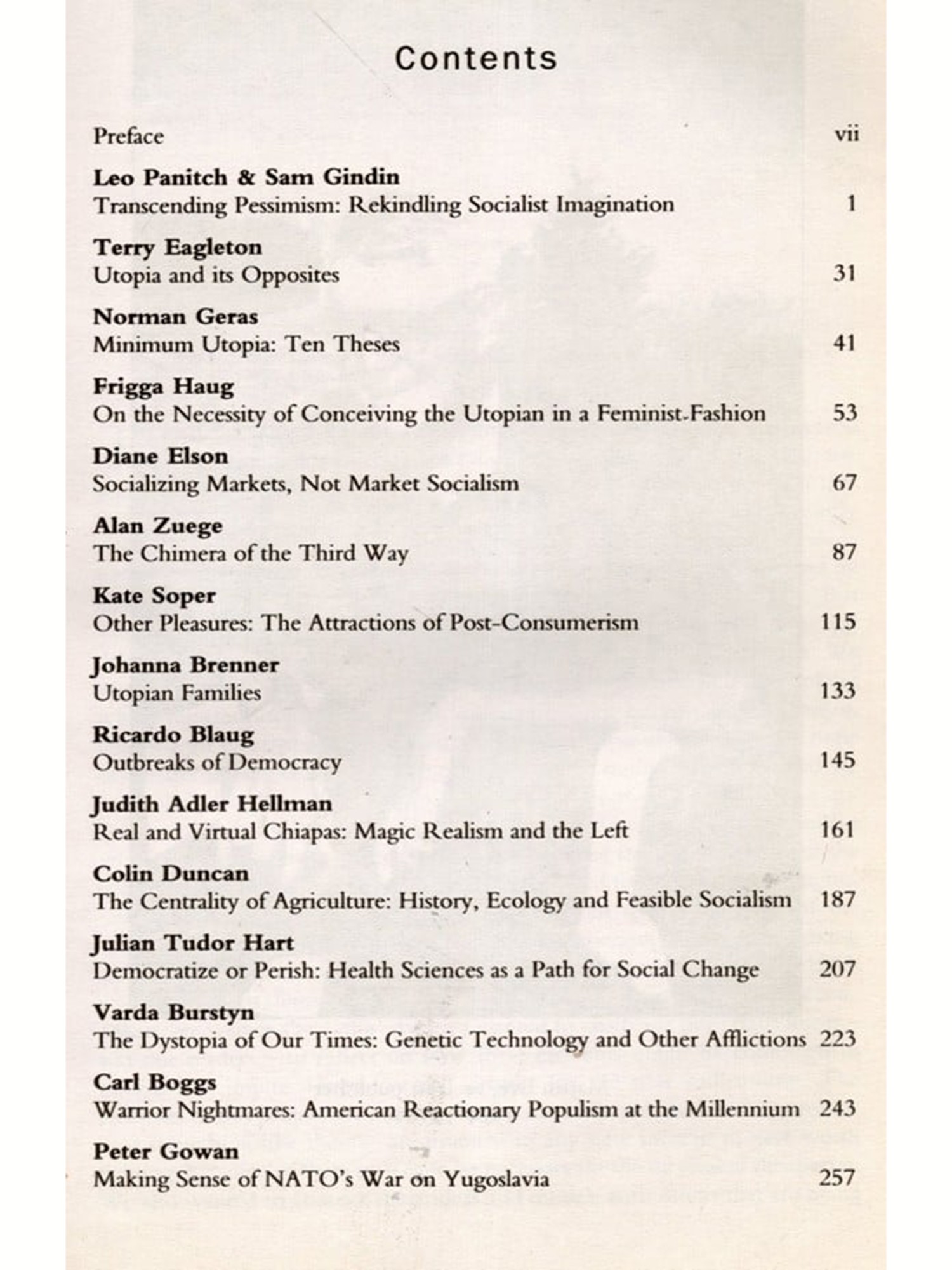 Our goals were relatively modest. We wanted to sample some of the elements of new socialist utopias that are already emerging from the rethinking and regrouping that has been taking place among progressives of many kinds -trade unionists, feminists, ecologists, scientists, philosophers, political economists, etc-since the 1980s. And we wanted to challenge our contributors -and our readers to reflect on how these elements might be combined to inform and inspire a new socialist project for the new millennium. The elements of this project are necessary in that the ideas and models they provide - or something like them are essential to any new socialist project worth fighting for some of them may even be necessary for the survival of the species. We also wanted to contrast these ideas and models with others that are being canvassed today and which are unnecessary, in the sense that on closer inspec tion they prove not to be utopias at all, but blind alleys. And re-imagining a humane socialist future is all the more required in light of the positively dystopian 'brave new worlds that the organic intellectuals of capitalism are promoting for the twenty-first century, such as those touted by the spin-doctors of the bio-engineering industry, on the one hand, and NATO on the other. Obviously we could not hope to be at all comprehensive, or even 'balanced" in our coverage (what exactly should be balanced with what?), but we could hope to help put the question of renewing the socialist goal back on the agenda. Above all, we hope this volume will contribute to loosening the grip that the narrow, alienated conception of 'reality' peddled by the neoliberals has had on too much left thinking in the past decade, and encourage people to refocus their imaginations and their political ambitions on the fundamental ideals that have inspired socialism throughout its history. It is time to refuse definitively the etiolated, increasingly hypocritical conception of democracy' which even social-democratic parties have come to accept and to insist on a far fuller and richer democracy than anything now available. It is time to reject the prevailing disparagement of everything collective as 'unrealistic' and to insist on the moral and practical rightness, as well as the necessity, of egalitarian social and economic relations. It is time to assert the attractions, as well as the necessity, of a society unhooked from subordination to 'growth based on production for profit, consumerism, sexism, militarism and the rest; and to spell out some of the conditions under which socialist goals can be realised above all the development of popular democratic capacities and the structures that nurture rather than stifle or trivialise them. And, taking even a slightly longer view, what could be more realistic than this?