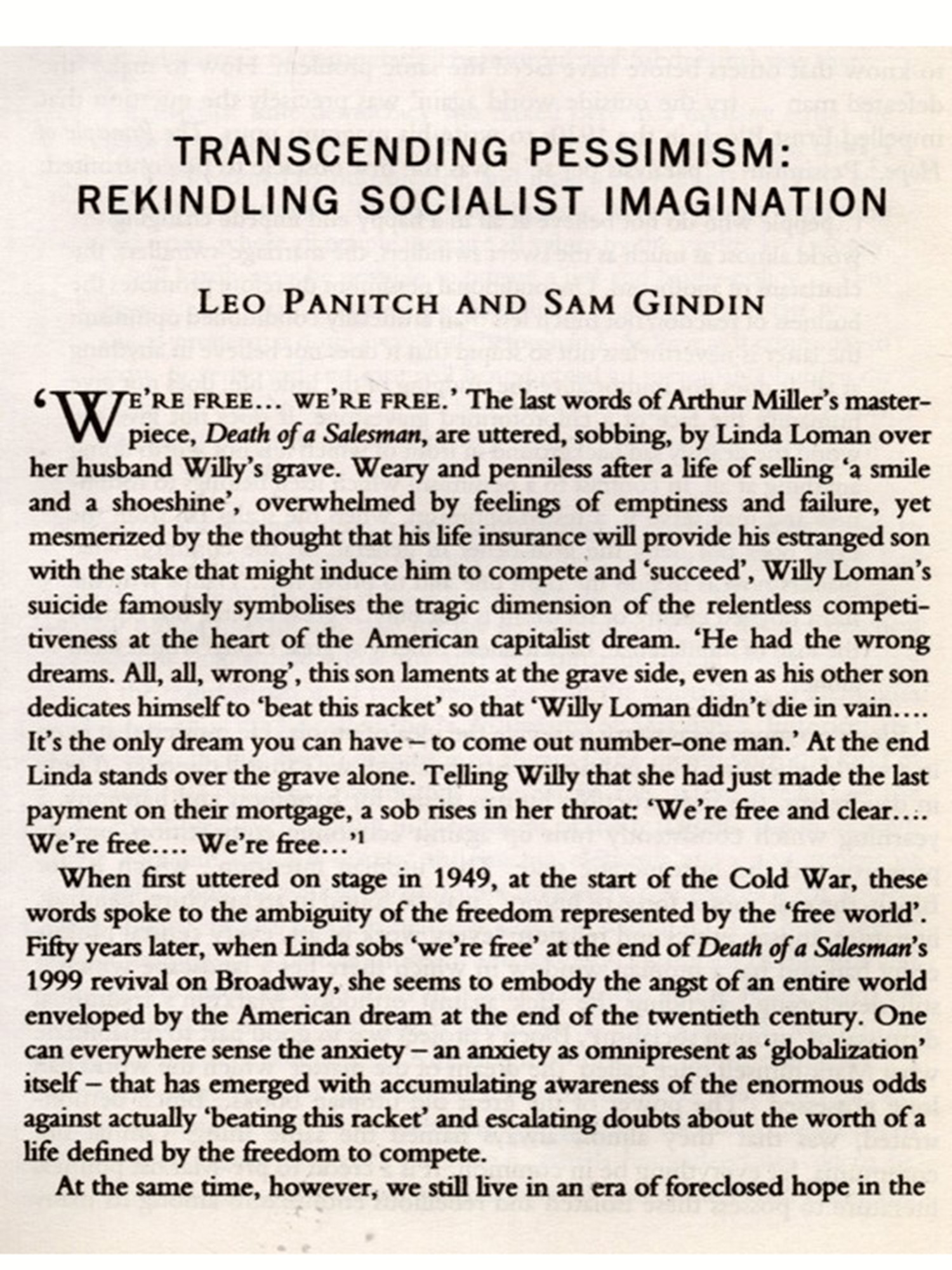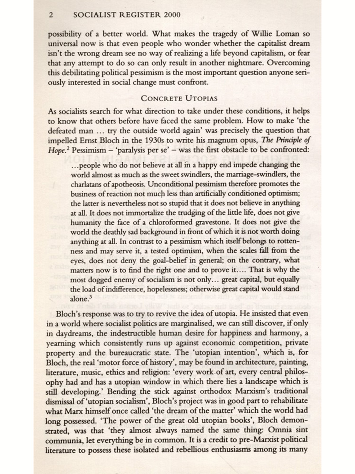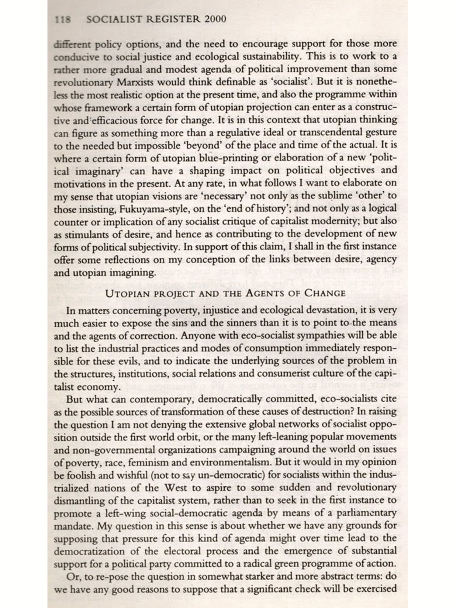 THE THEME OF THIS VOLUME of the Socialist Register was first conceived I in 1975 with the following general question in mind as we approach the end of the millennium, what in to succeed the first great socialist project that was conceived in Western Europe in the nineteenth century, and variously implemented and frustrated by communism and social democracy in the twentieth? We had no illusions that an answer to this question would be found by cudgelling the brains of however large a number of left-wing intellectuals. But we did think that the time had come to renew the left's vision and spirit and that the Register could hope to contribute something useful for this purpose. We wanted to break with the legacy of a certain orthodox kind of Marxist thinking which rejected utopian thought as 'unscientific just because it was utopian, ignoring the fact that sustained political struggle is impossible without the hope of a better society that we can, in principle and in outline, imagine. And we particularly felt that in face of the collapse of communism, as well as the rejection by 'third way' social democracy of any identification with the socialist project, there was now, especially in the context of the growing crisis of the neo-liberal restoration, an opening as well as a need for imaginative thought.