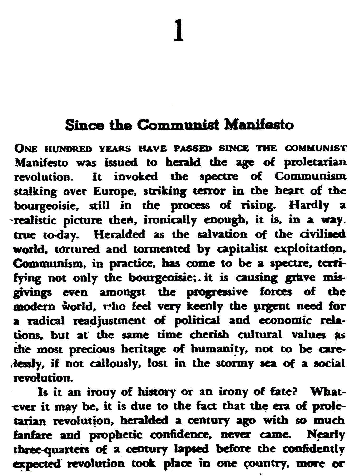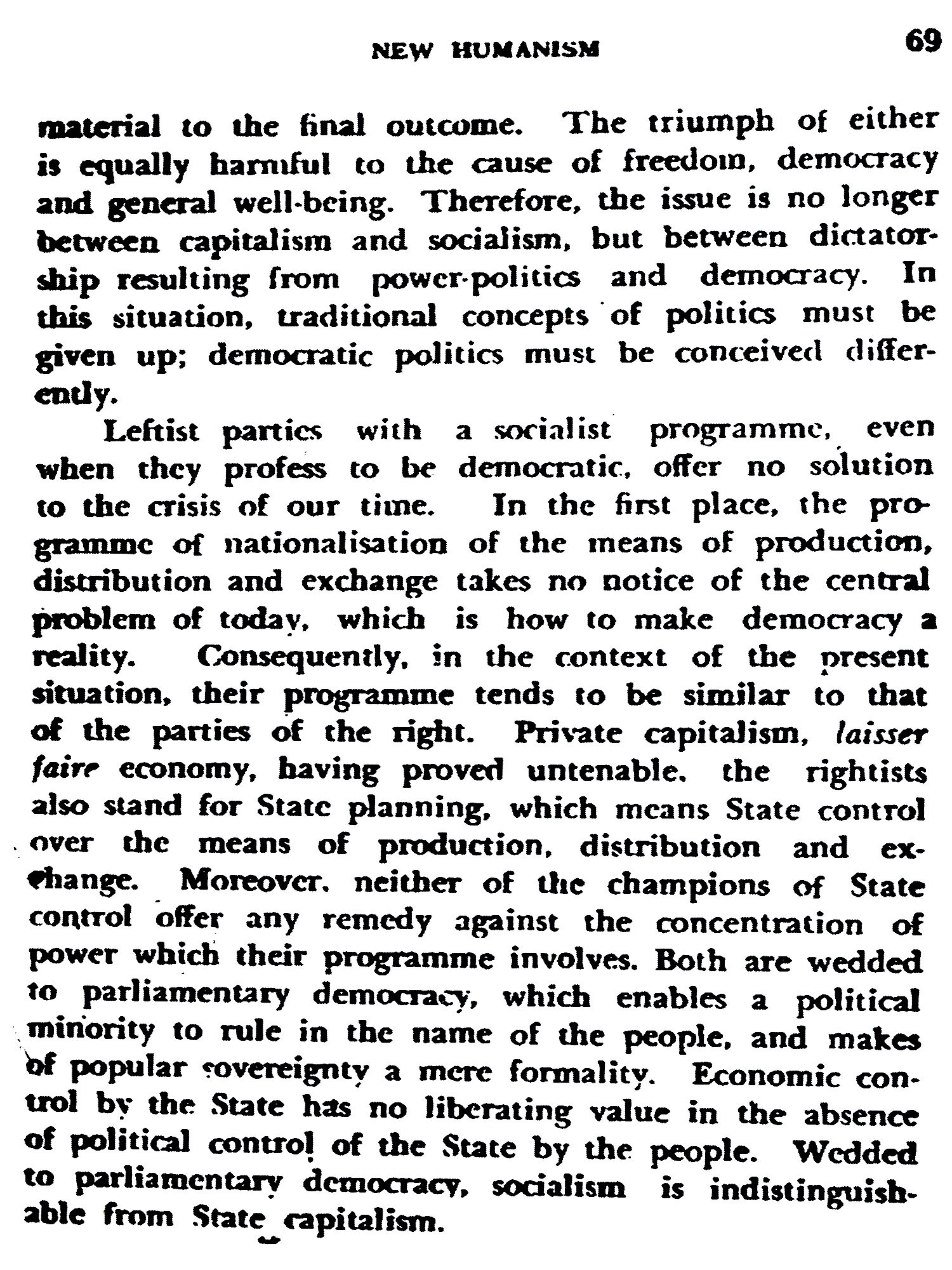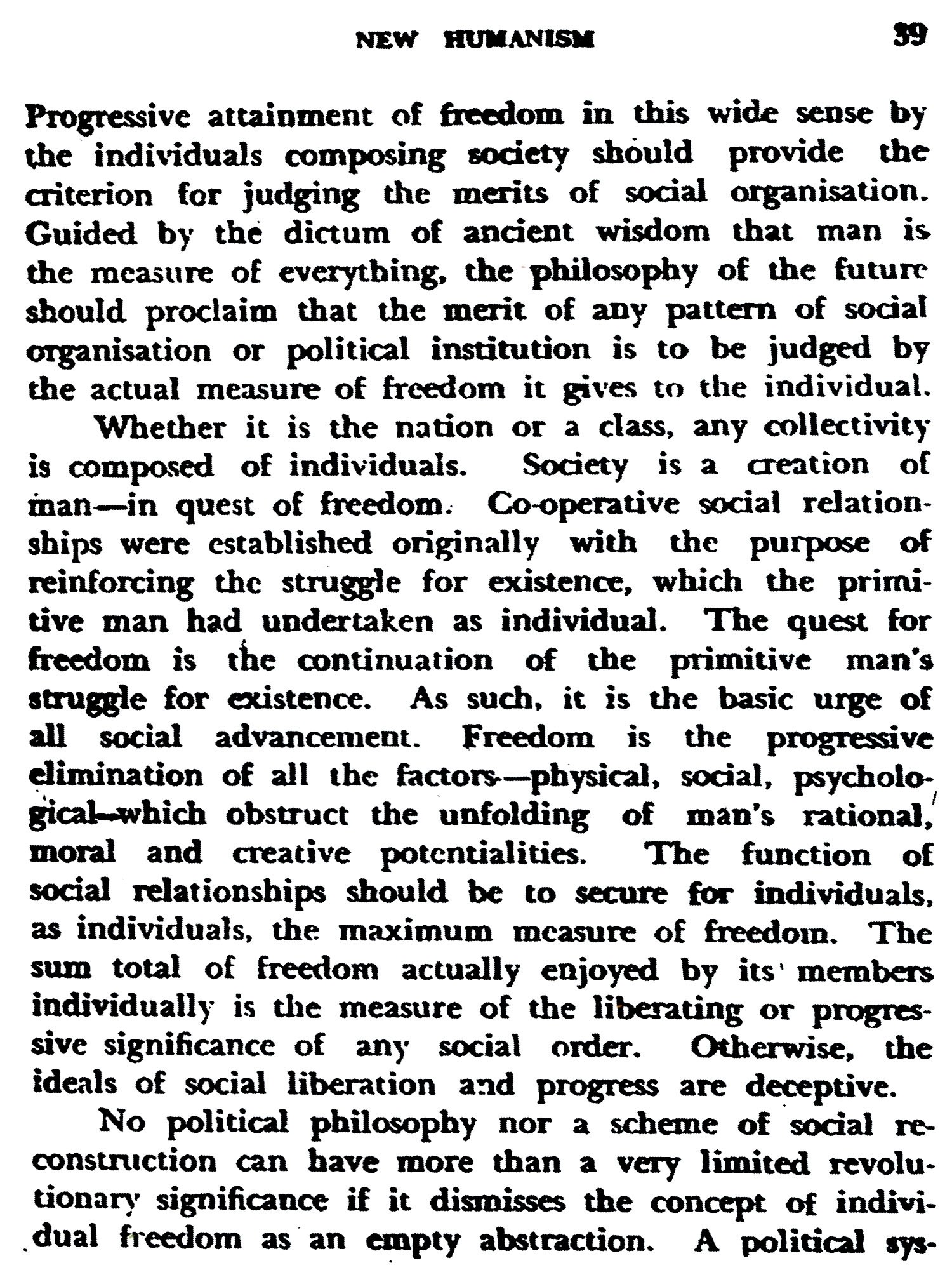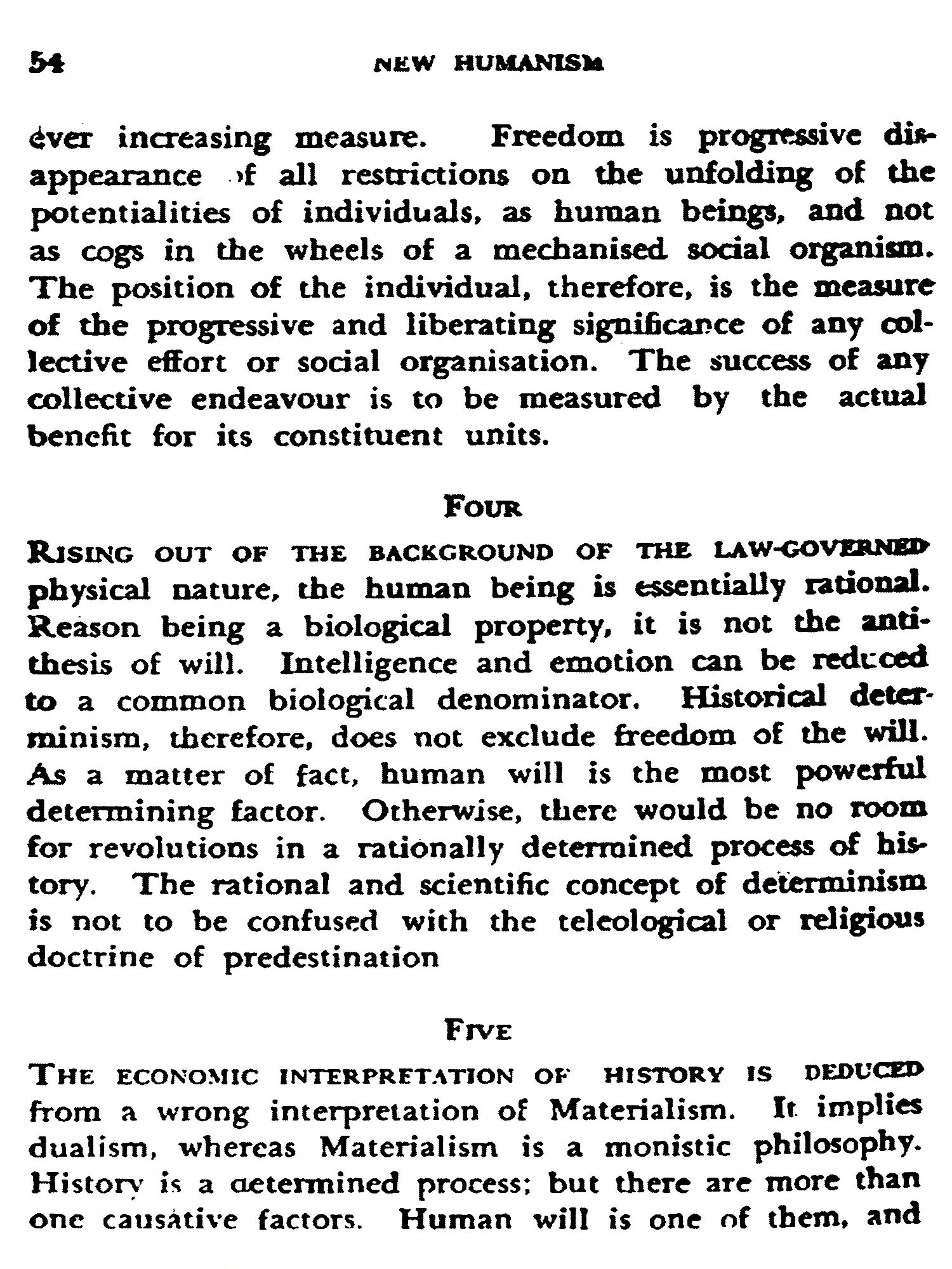 The Conference of the Radical Democratic Party of India. held in Bombay during the last week of December 1946, resolved to issue a manifesto incorporating the fundamental principles of New Humanism which it had been developing ever since its foundation six years ago. A statement of these principles in the form of Theses was adopted by the Conference. In pursuance of the resolution, a draft of the manifesto to be issued was submitted to the Central Political Council of the party which met on May 23rd to 25th, 1947, to discuss the document. The draft being an elaboration of the There’s adopted by the Party Conference, and also of a statement on the international situation issued previously, the Central Political Council of the party approved it on principle. But as author of the draft, I moved that formal endorsement by the Party and publication of the manifesto in its behalf should be deferred yet for some time. The motion was adopted with the proviso that meanwhile the draft should be published, so that it might be considered by progressive opinion throughout the world. It is, however, not a statement of my personal view. The original draft prepared by me has been considerably improved thanks to valuable suggestions from others. Philip Spratt, Sikander Choudhury and V. M. Tarkunde should be particularly mentioned.