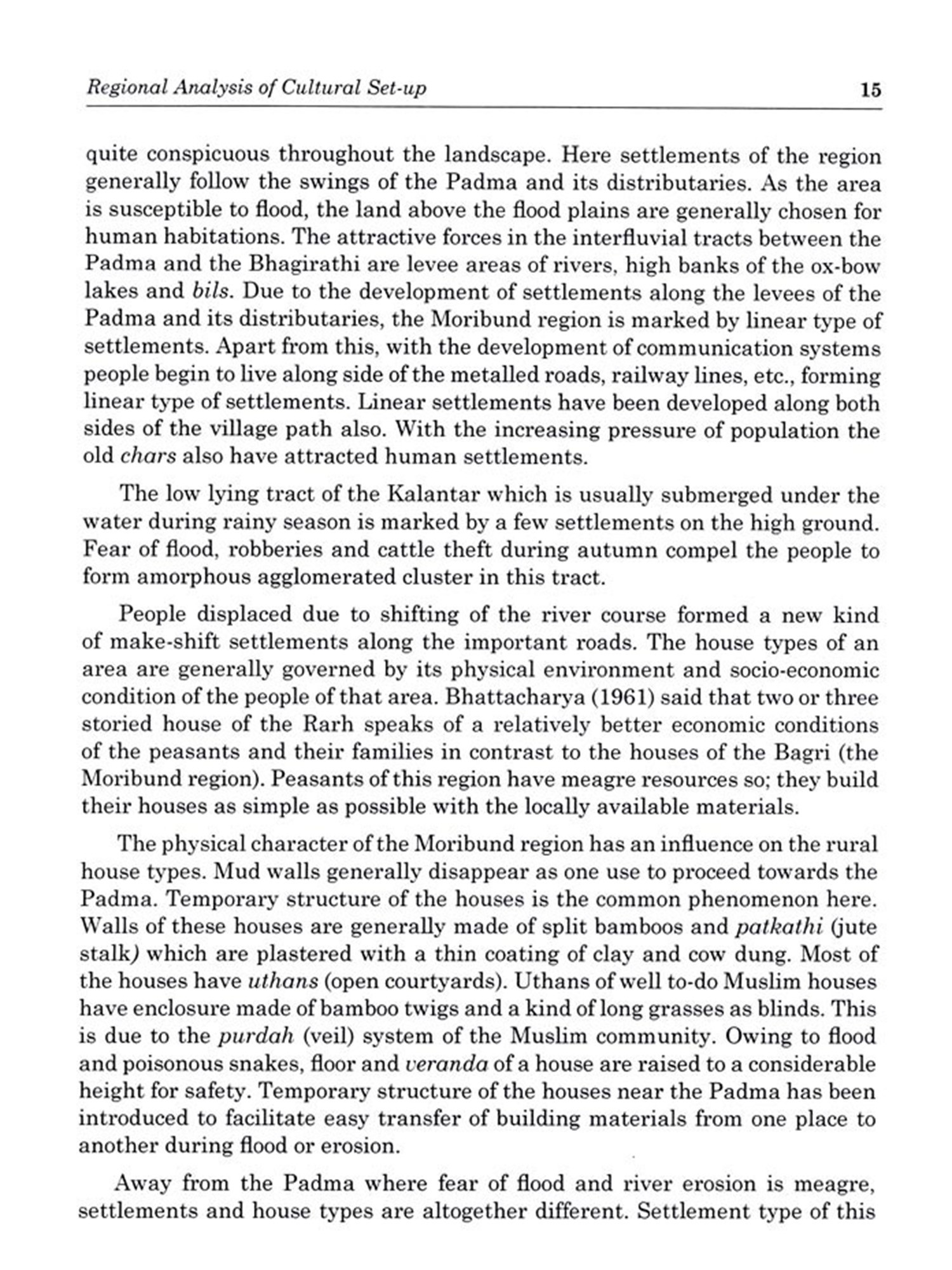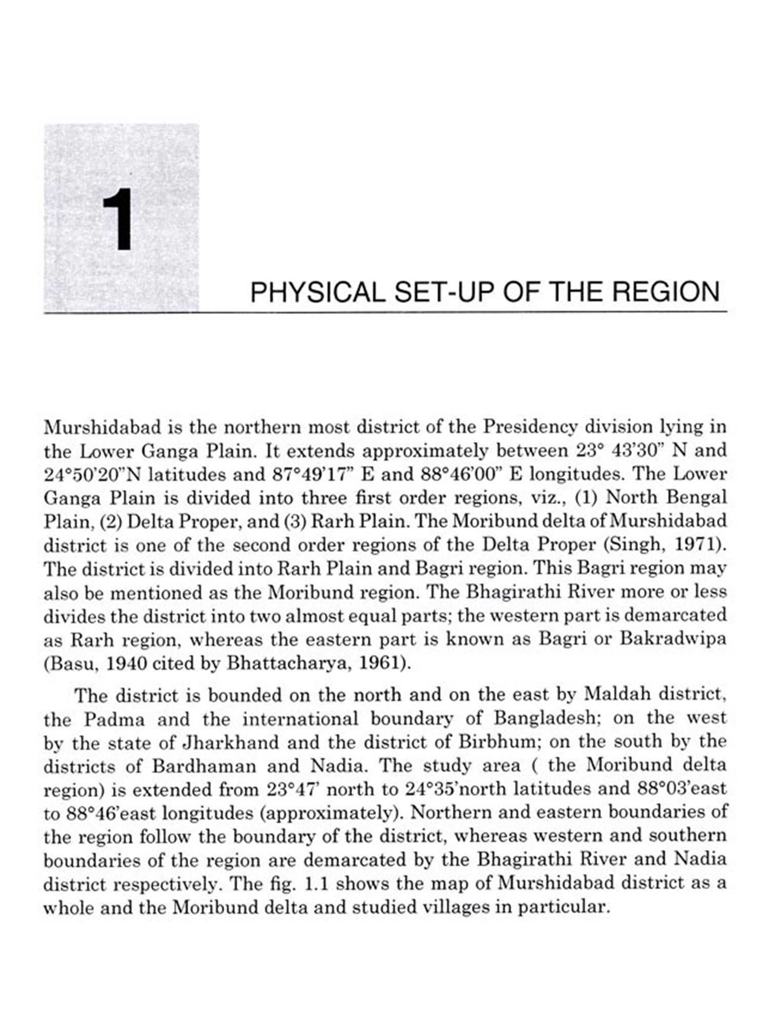Alluvial tracts of Bengal Delta are a subject of research for the past few decades. Bagchi (1944) has classified the Ganges Delta region into three sections, vix, moribund, mature and active parts of the delta. In the Moribund delta, rivers have ceased to be in the active stage and land building has been arrested. Here tributaries are highly silted and are marked by abundance of oxbow lakes. The Geographical extent of this Moribund delta covers the districts of Murshidabad (eastern part of the Bhagirathi river only), part of Nadia and 24 Parganas in West Bengal and Jessore, western part of Faridpur (Goalando subdivision) and small portion in the north of Khulna in Bangladesh. The study area is in Murshidabad district of West Bengal. The Moribund delta region, the oldest part of the delta, has been formed by silt from shifting of the Main River and major distributaries. The slope of the moribund zone is very gentle, causing quick silt deposition in river beds. This process decrense carrying capacity of the river channels and induces occasional floods. It also causes a gradual or sudden shifting of river channels to a more low lying area. Thus, the Moribund delta is being marked by dead and dying rivers characterised by contrasting levels, i.e. very high river beds and banks and low marshy or water logged land. According to Singh (1971) the easterly shift of the Ganges is also responsible for this moribund condition of the region. The Padma, the main course of the Ganga at present, is the principal river of the region as well as in Murshidabad district and total drainage system of the area is controlled by the oscillation and changing course of the Ganga from the Bhagirathi to the Padma. Shifting of the Ganga from the Bhagirathi to the present course the Padma through the subsequent channels viz., the Bhairab, the Jalangi, etc., has been probably completed by the 16th century. Majumder (1942) admits the difficulties to determine when the great change took place, but there is hardly any doubt that in the beginning of the 16th century A.D., the Padma, already has ranked as the main stream of the Ganga. From the very existence of the river Chhoto Bhairab, some concentric water bodies and numerous crescent shape settlements in the western part of the Bhairab, Rizvi (1958) has come to the opinion that the Bhairab has marched gradually castward abandoning its course. Existence of numerous natural levees at Bhagwangola, Murshidabad and Jiaganj also establishes the gradual onstward shifting of the Padma and its distributaries. The name of the agricultural land as "la bhangar jami (la means boat) in the studied village-Sahajadpur may be mentioned as a proof of the statement. People say that many years ago remnants of boats have been found during digging of soil. Again from the O' Malley's District Gazetteer (1914) it is known that the Bhairab used to take off from the Padma close to the point where the Mahananda used to flow into it. It had been suggested that it originally formed a continuation of the Mahananda, which cut in half by the Padma as it established its way eastwards. It has been observed from O'Maley (1914) that the Bhairab was the main channel through which the Jalangi used to obtain its supply from the Padma. Various hypotheses were in vogue to identify the causes behind this changing nature of the courses of the rivers. Some said that the platform for this fluvial action was set through tectonic activities. Morgan and Intire (1959) assessed the changes in the course of the Ganga and the Brahmaputra rivers during the last few hundred years due to faulting and resultant tilting of fault blocks. These changes had caused the Ganga to abandon numerous western distributaries in favour of joining the Brahmaputra Meghna system to the southeast. Mukherjee (1938) referred that it was probably deflection of the Kosi, which was an easterly flowing river to the west in the fourteenth and fifteenth centuries and strengthened the channel of the Padma. Formerly, the combined water of the Kosi, the Mahananda and the Atrai flowed into the Lohitya. Tremendous changes took place in the course of those and other Himalayan rivers which might have been due to silting up of the drainage basin along the Himalayas by the debris from the hill slope and sudden seismic disturbances and those rivers began to flow into the Ganges. Thus, this change became responsible for the mighty force of the Padma. Sengupta (1972) said that the shift of the present rivers of West Bengal appeared to be the outcome of two distinct features: (i) a regional south-easterly slope of the basin, caused to some extent by movements on the hinge zones located at the edge of the shelf and (ii) an increasing rate of southerly tilt of the West Bengal part of the basin due to a relatively greater rate of subsidence of the south western part of the hinge through the tertiary and recent times. Mukherjee (1938) referred that most of the eastern part of Murshidabad district was originally an estuary.