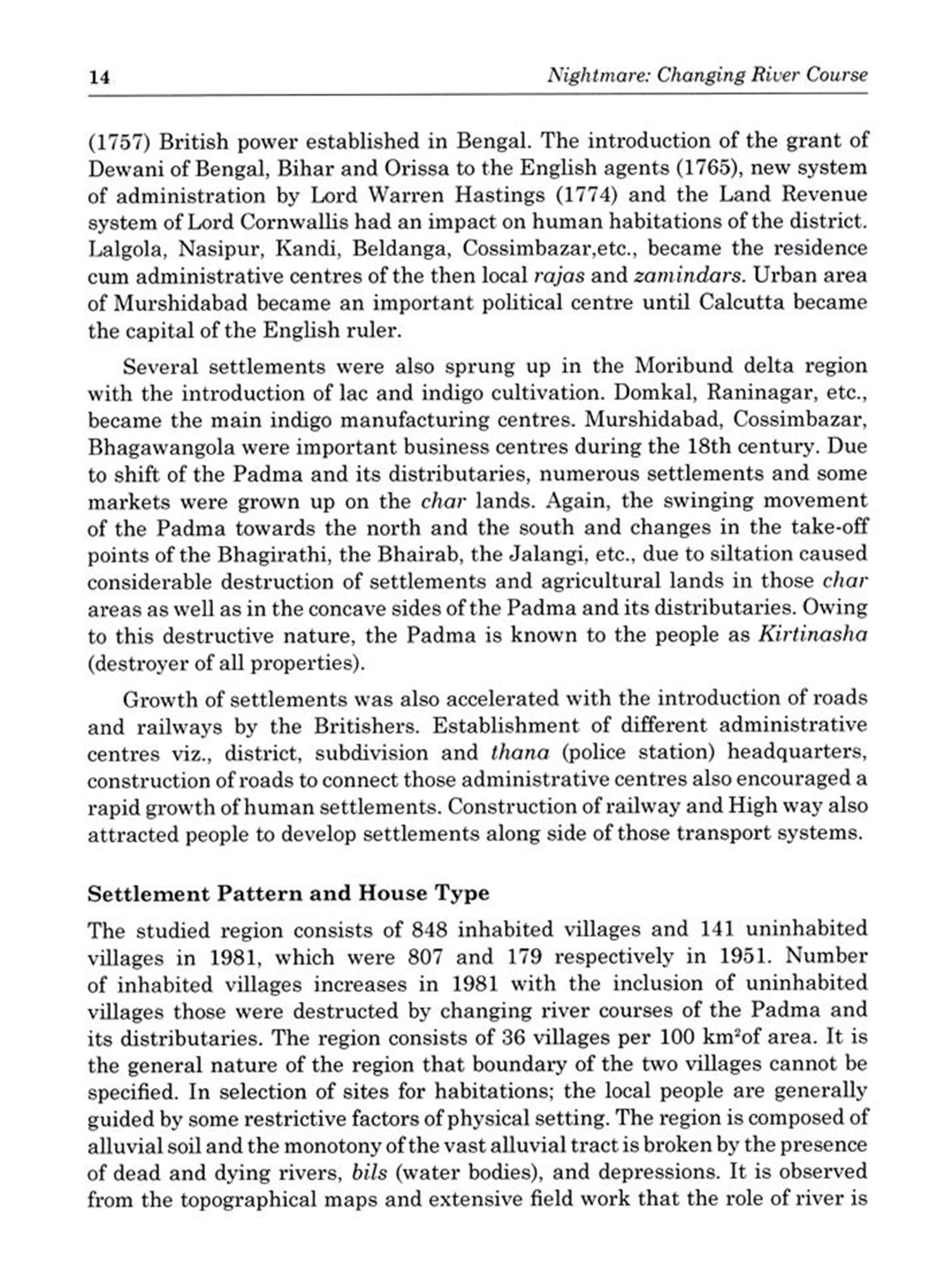 The increasing erosion in the right bank of the Padma in the Moribund delta region of Murshidabad district, West Bengal is becoming the nightmare for the people of the area. The Padma is the principal river of the region and controls total drainage system of the area by oscillation and change of its course. As the Padma is a meandering river, bank erosion followed by flood is the common phenomenon. But indiscriminate drawal of water in the upper reaches of the Ganga, deforestation and most importantly construction of Farakka Barrage has aggravated the dimension of river bank erosion. Areas near the Padma have seriously been affected by the changing course of the mother river or its distributaries. In the present treaties author has tried to focus and highlight through empirical data that the study area according to intensity of erosion has been divided. Thousands of hectares of land and many settlements have already been obliterated making the settlers pauper. It has been reflected in variation of landholding size and change in the status of land owning gentry which in chain lead to affect households as well as occupation structure in those regions. The study has shown that changing course of the Padma is also responsible for changing occupation pattern, population and settlement pattern also. Region wise variation has also been observed in land use pattern and agricultural land use. The lowest diversification of crops in the Most affected region proves the most agricultural uncertainty of the area. Differences have been found in loss and availability of infrastructure facilities for irrigation and use of agricultural implements. Thus, changing course of the river has caused various changes which brings not only a nightmare to the habitat but it also has affected subsistence pattern which is full of agony with the mercy of celestial world throughout the region. With this empirical study it has also been highlighted people's perceptions and government efforts found in this region to minimise this hazard. The planners, NGOs and social activists can easily formulate any development scheme on the basis of first hand information documented through empiricist by researcher-Geographer and accordingly a fruitful programme may be executed where the author has also put some suggestions to mitigate the problems arised from this natural phenomenon.