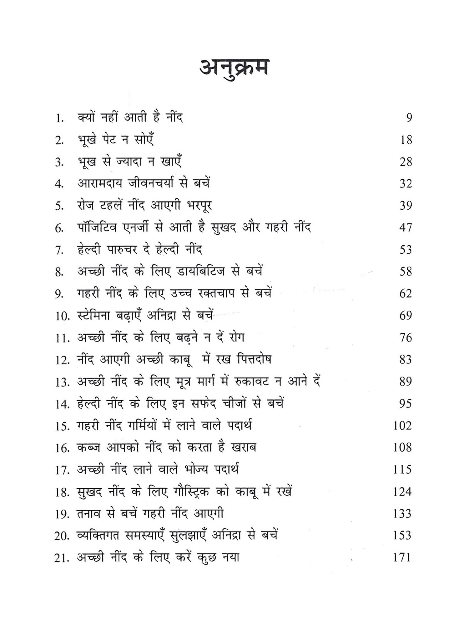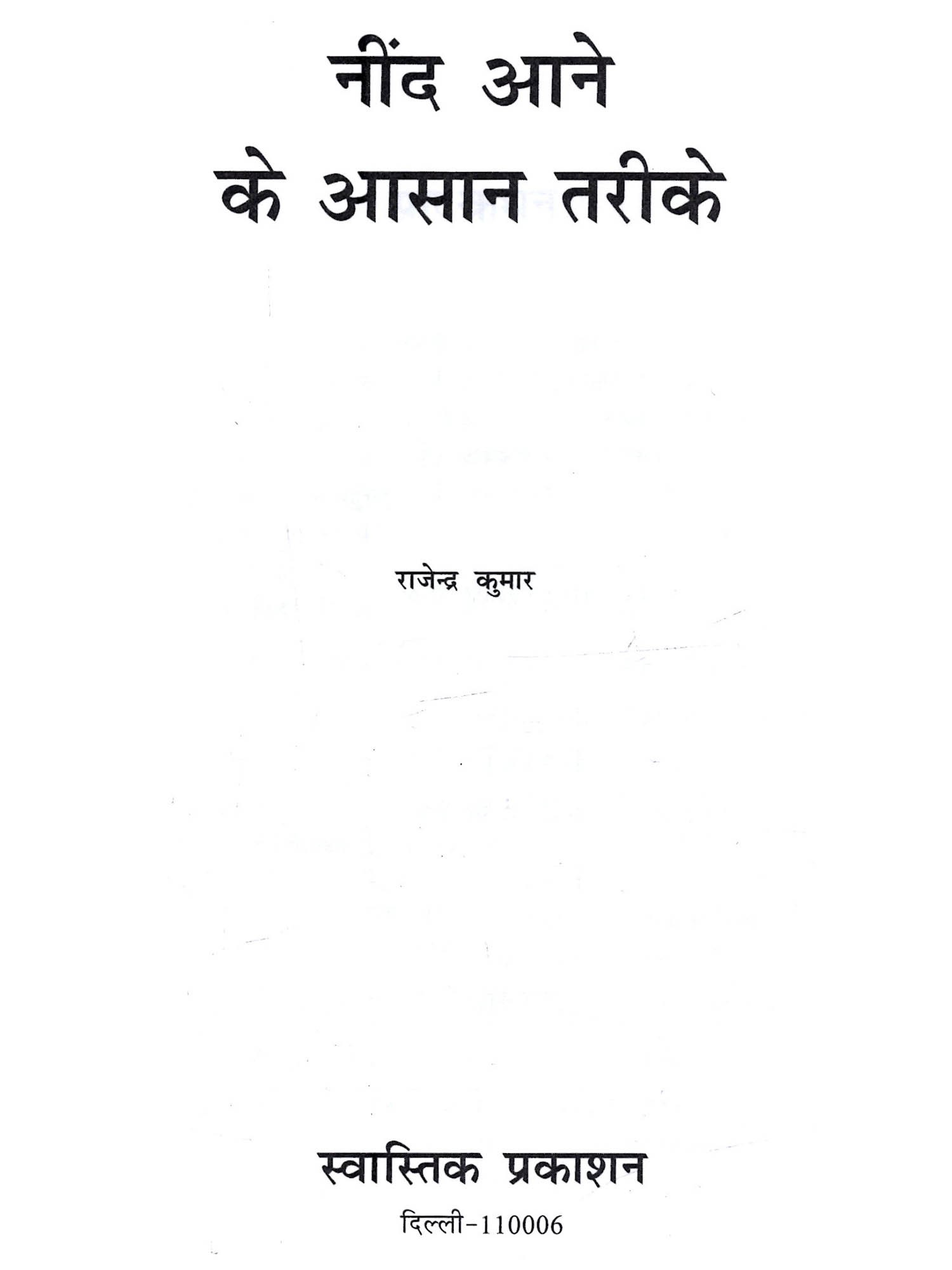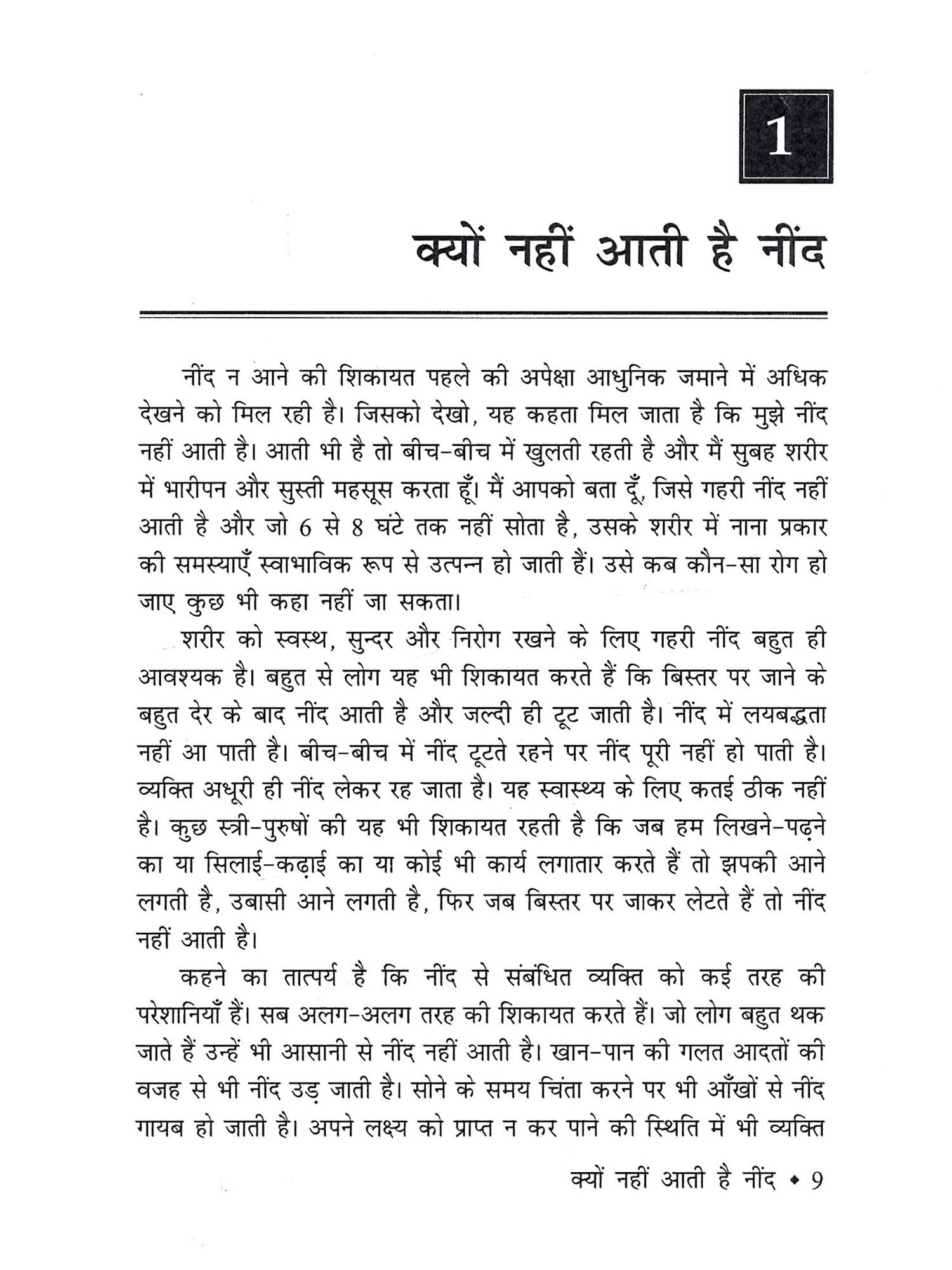 आज की भागदौड़ की जिन्दगी में लोगों को नींद नहीं आती। दिन भागने-दौड़ने में बीत जाता है और रात को बिस्तर पर जाने पर नींद न आना बीमारी का लक्षण हो सकता है। आजकल मनोचिकित्सकों के पास अनिद्रा के रोगियों का जमावड़ा लगा रहता है। आप अपनी दिनचर्या में सुधार कर लें, स्वयं को हेल्दी और निरोग रखने की पूरी कोशिश करें तो आपको अनिद्रा से मुक्ति मिल सकती है। अनिद्रा कोई रोग न होकर रोगों का लक्षण है। 'लाइफ स्टाइल' की देन अनिद्रा है। सोते समय अच्छा सोचें और अच्छे विचार लेकर सोएँ ताकि कोई भी दुर्भावना आप पर हावी न हो सके। दुर्भावना आप पर हॉवी हो जाती है तो आप पूरी तरह से नकारात्मकता से भर जाते हैं, फिर आप नींद में ऐसे ही सपने देखने लगते हैं, जिसमें आप डर जाते हैं, फिर थरथर कांपने लगते हैं। सपना इतना वीभत्स और डरावना जो होता है जिस कारण आपकी नींद टूट जाती है तो फिर आपको नींद नहीं आती। आपकी मन की स्थिति सामान्य होने में समय लगता है, तब तक सुबह हो जाती है। आप सकारात्मक सोचें, अच्छा सोचें। आज का जो समय है वह बहुत भीड़भाड़ वाला है और नींद न आना जिन्दगी को दूभर कर देता है। पुस्तक में नींद आने के आसान तरीकों का वर्णन सरल, सहज भाषा शैली में किया गया है ताकि पाठक पुस्तक का पठन कर और उन तरीकों को अपनाकर अच्छी, गहरी और लम्बी नींद लेकर चैन और सुखद जीवन व्यतीत कर सकें।