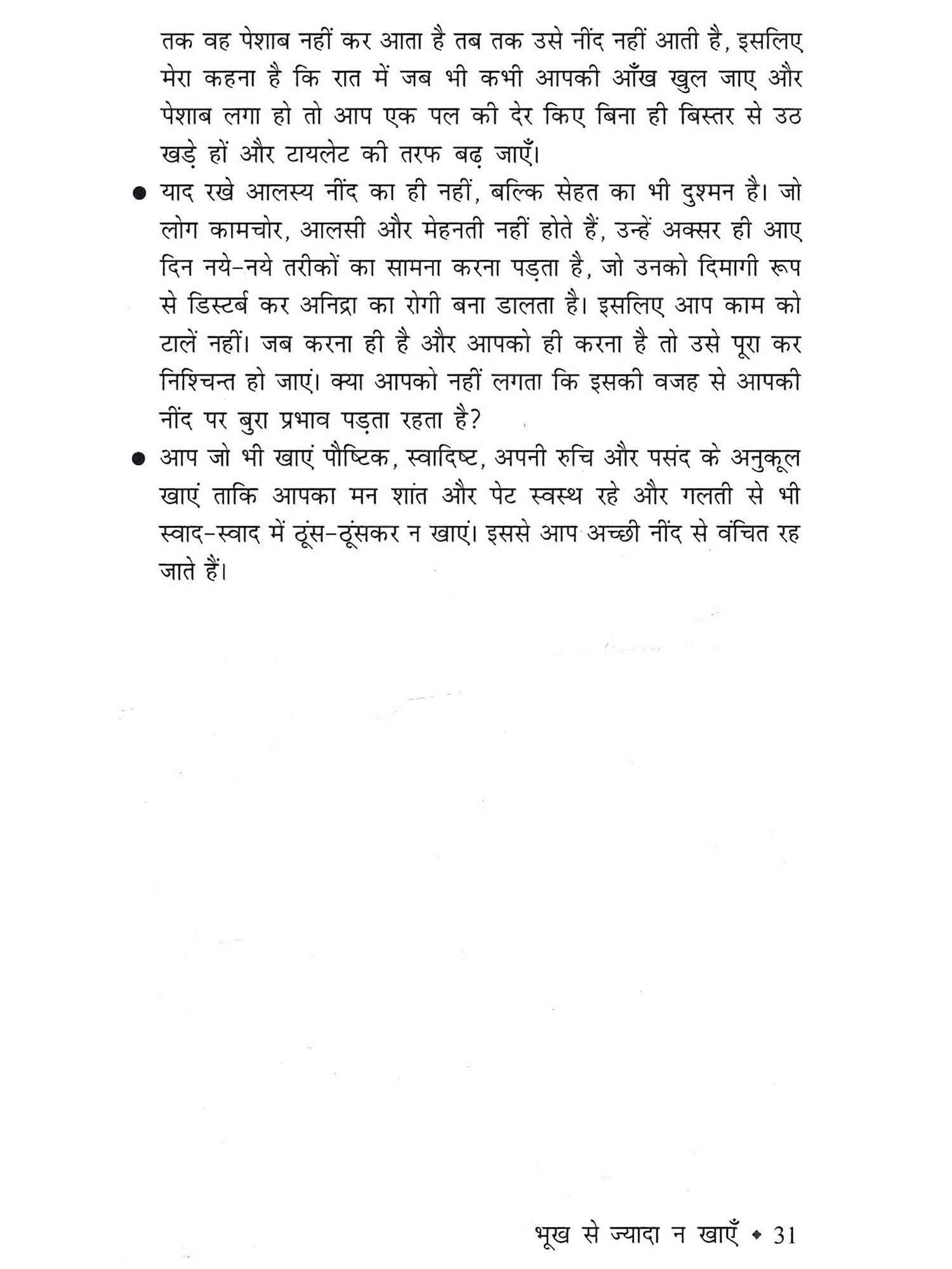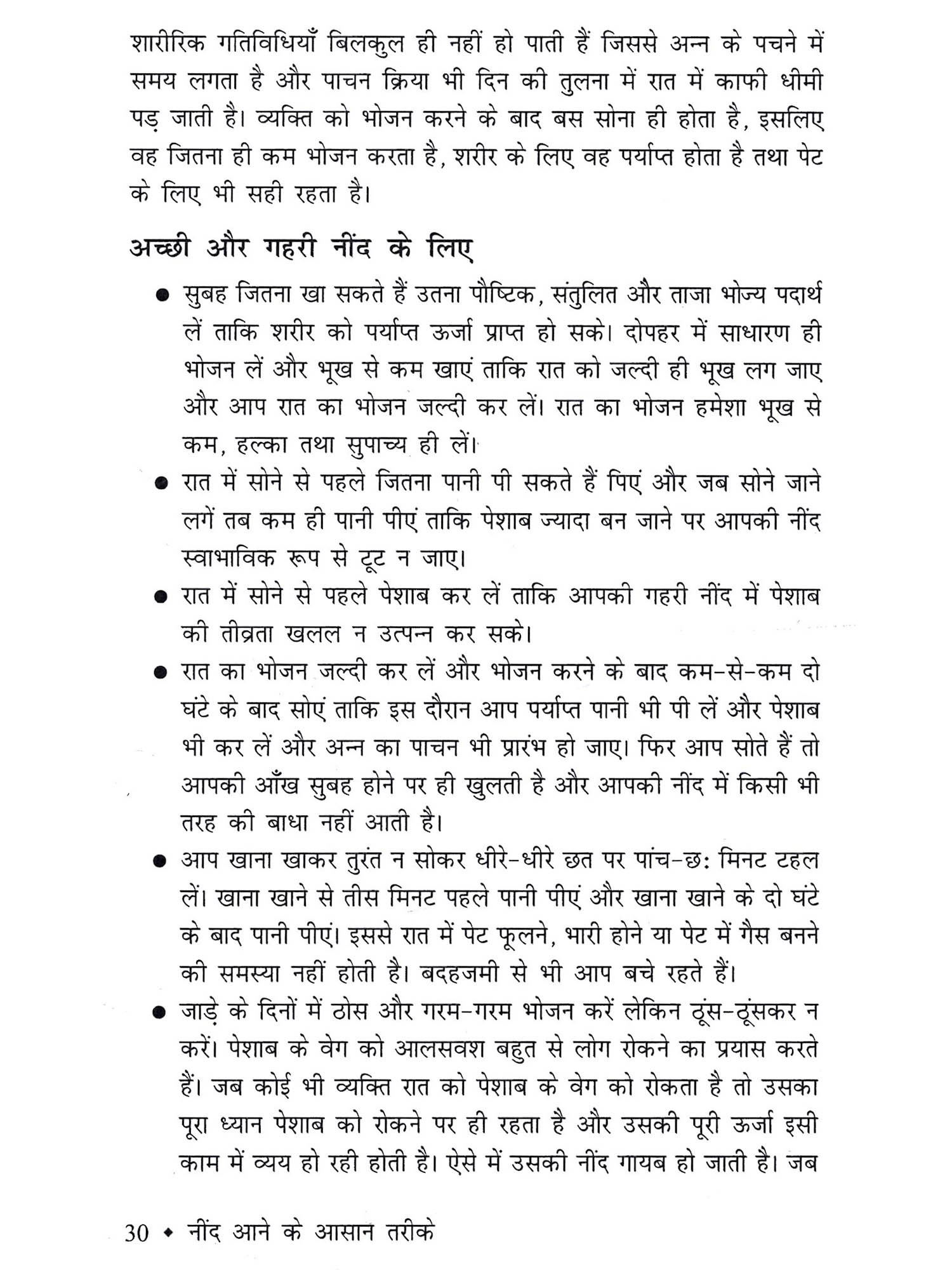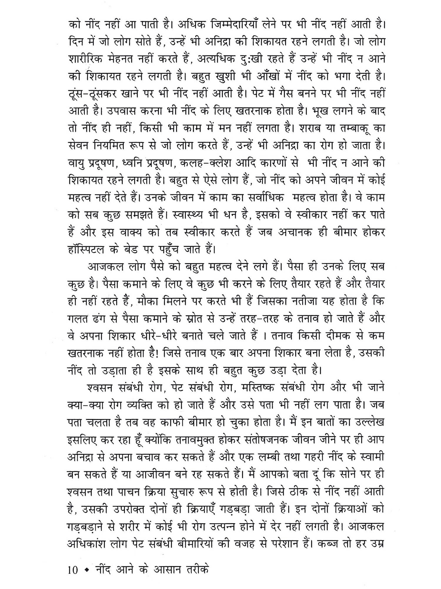 आज की भागदौड़ की जिन्दगी में लोगों को नींद नहीं आती। दिन भागने-दौड़ने में बीत जाता है और रात को बिस्तर पर जाने पर नींद न आना बीमारी का लक्षण हो सकता है। आजकल मनोचिकित्सकों के पास अनिद्रा के रोगियों का जमावड़ा लगा रहता है। आप अपनी दिनचर्या में सुधार कर लें, स्वयं को हेल्दी और निरोग रखने की पूरी कोशिश करें तो आपको अनिद्रा से मुक्ति मिल सकती है। अनिद्रा कोई रोग न होकर रोगों का लक्षण है। 'लाइफ स्टाइल' की देन अनिद्रा है। सोते समय अच्छा सोचें और अच्छे विचार लेकर सोएँ ताकि कोई भी दुर्भावना आप पर हावी न हो सके। दुर्भावना आप पर हॉवी हो जाती है तो आप पूरी तरह से नकारात्मकता से भर जाते हैं, फिर आप नींद में ऐसे ही सपने देखने लगते हैं, जिसमें आप डर जाते हैं, फिर थरथर कांपने लगते हैं। सपना इतना वीभत्स और डरावना जो होता है जिस कारण आपकी नींद टूट जाती है तो फिर आपको नींद नहीं आती। आपकी मन की स्थिति सामान्य होने में समय लगता है, तब तक सुबह हो जाती है। आप सकारात्मक सोचें, अच्छा सोचें। आज का जो समय है वह बहुत भीड़भाड़ वाला है और नींद न आना जिन्दगी को दूभर कर देता है। पुस्तक में नींद आने के आसान तरीकों का वर्णन सरल, सहज भाषा शैली में किया गया है ताकि पाठक पुस्तक का पठन कर और उन तरीकों को अपनाकर अच्छी, गहरी और लम्बी नींद लेकर चैन और सुखद जीवन व्यतीत कर सकें।