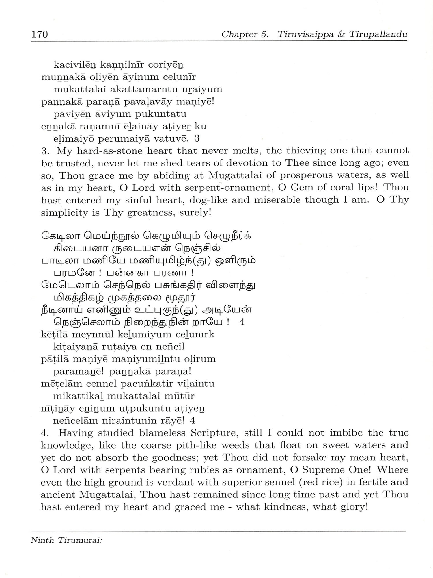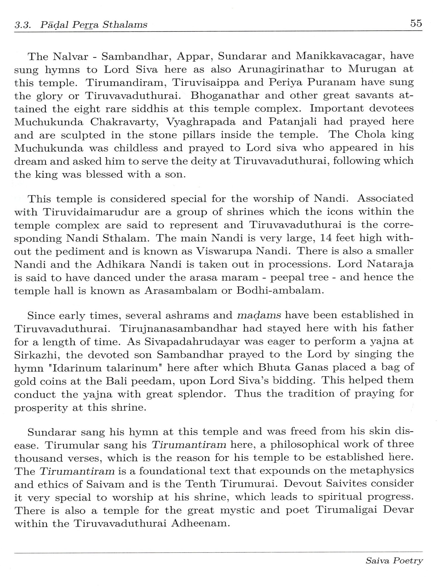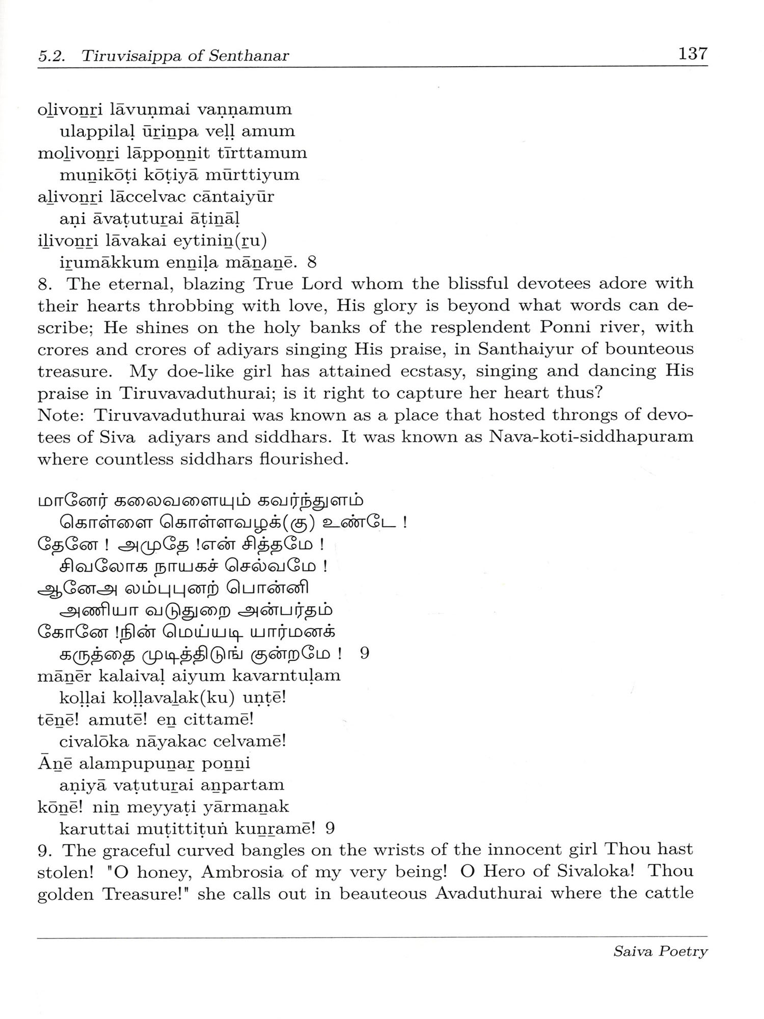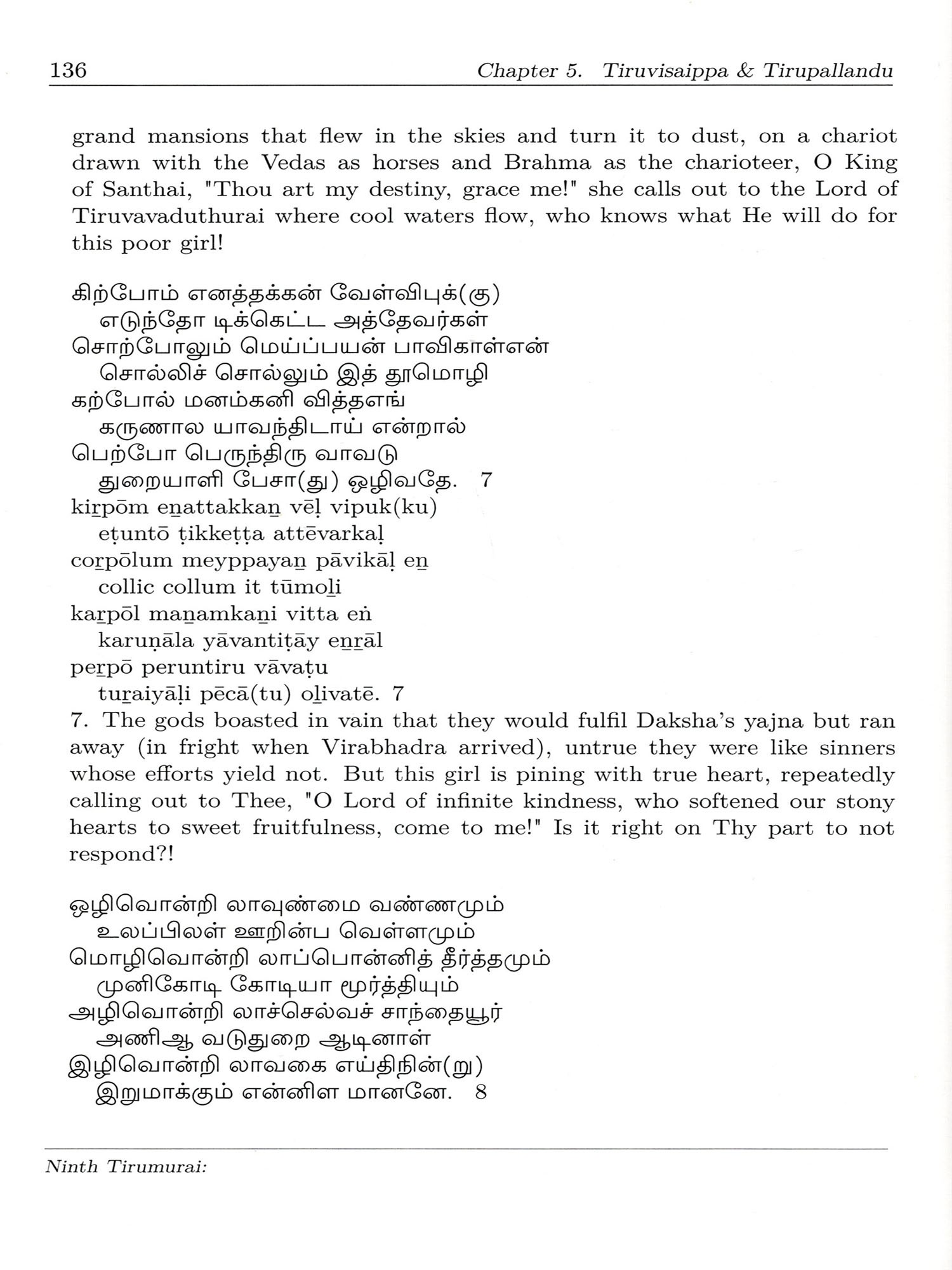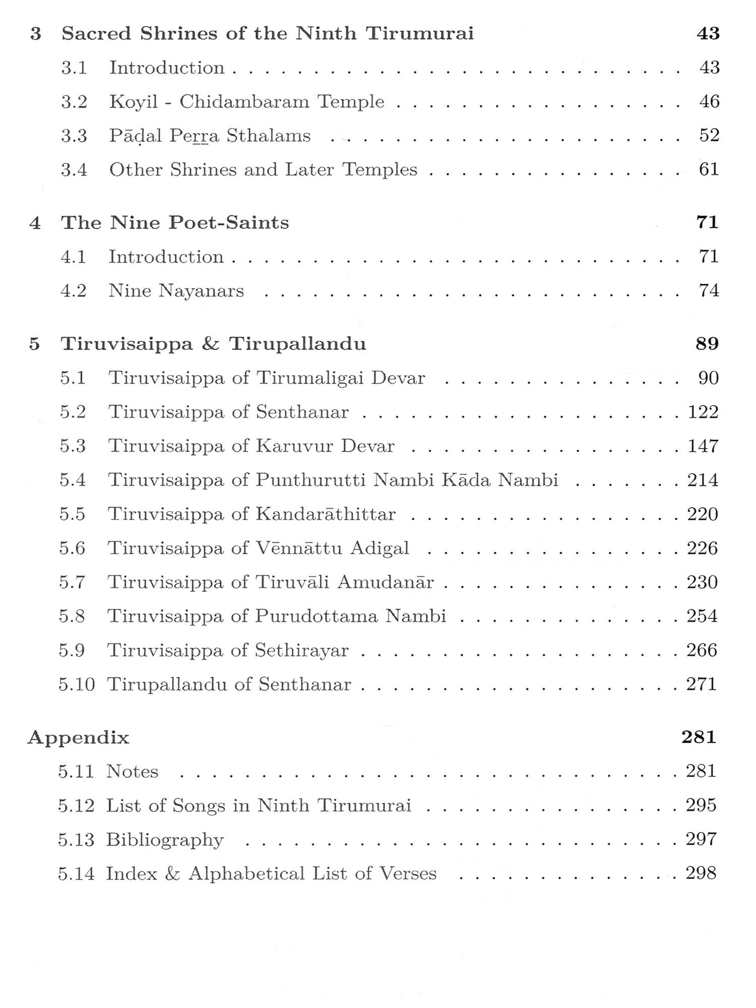 Every day in the ritual worship of Lord Shiva in Agama temples, it is customary to sing five verses known as Panchapuranam from the Tirumurai collection, at every ceremony one verse from the Tevaram of Muvar, one from Manikkavacagar's works, one from the Tiruvisaippa, one from Tirupal landu and one from the Periya Puranam. See Appendix Note 1] With two songs of five selected from the Ninth Tirumurai, which is also the shortest of the twelve, we can understand the greatness of this compilation.