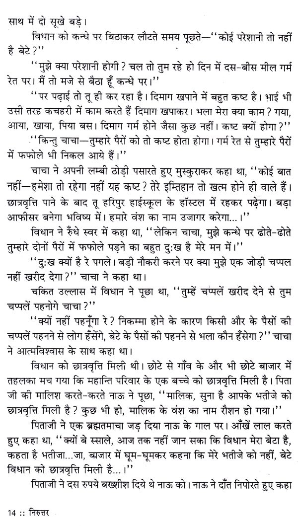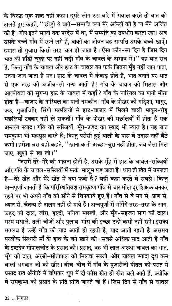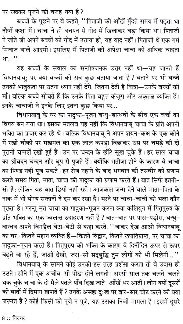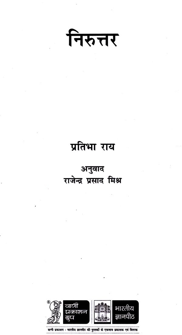 निरुत्तर ओड़िया कथा-साहित्य की प्रख्यात लेखिका प्रतिभा राय की लम्बी कथा-यात्रा के मार्ग में एक नये पड़ाव के रूप में प्रस्तुत है उनका नवीनतम कहानी-संग्रह निरुत्तर। निरुत्तर की कहानियों में मनुष्य और उसके बाह्य एवं अन्तःपरिवेश के अभिनव रूप तथा अप्रकट तसवीरें अपनी सम्पूर्णता में उभरकर आयी हैं। इनमें मनुष्य और मानवीयता के बीच के अन्तर तथा मानवीय अनुभूतियों को बड़े ही सरल, सहज और मर्मस्पर्शी शैली में व्यक्त किया गया है। यही कारण है कि लेखिका के कथा-कर्म का प्रतिनिधि व केन्द्रीय स्वर गहरी आत्मीयता के साथ सुनाई देता है। भाषा, शैली, कथ्य, अभिव्यक्ति एवं मानवीय संवेदनाओं की दृष्टि से विचार करें तो संग्रह की एक-एक कहानी इस बात की पुष्टि करती है कि देश, काल, पात्र, भाषा और आत्माभिव्यक्ति की बहुविध सीमाओं |