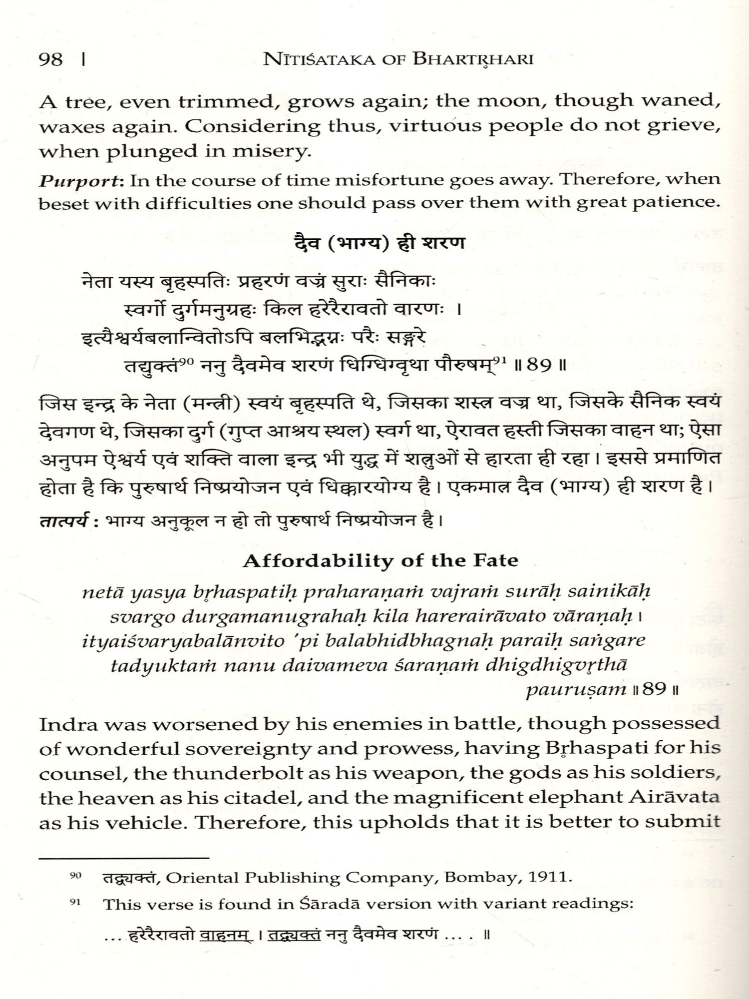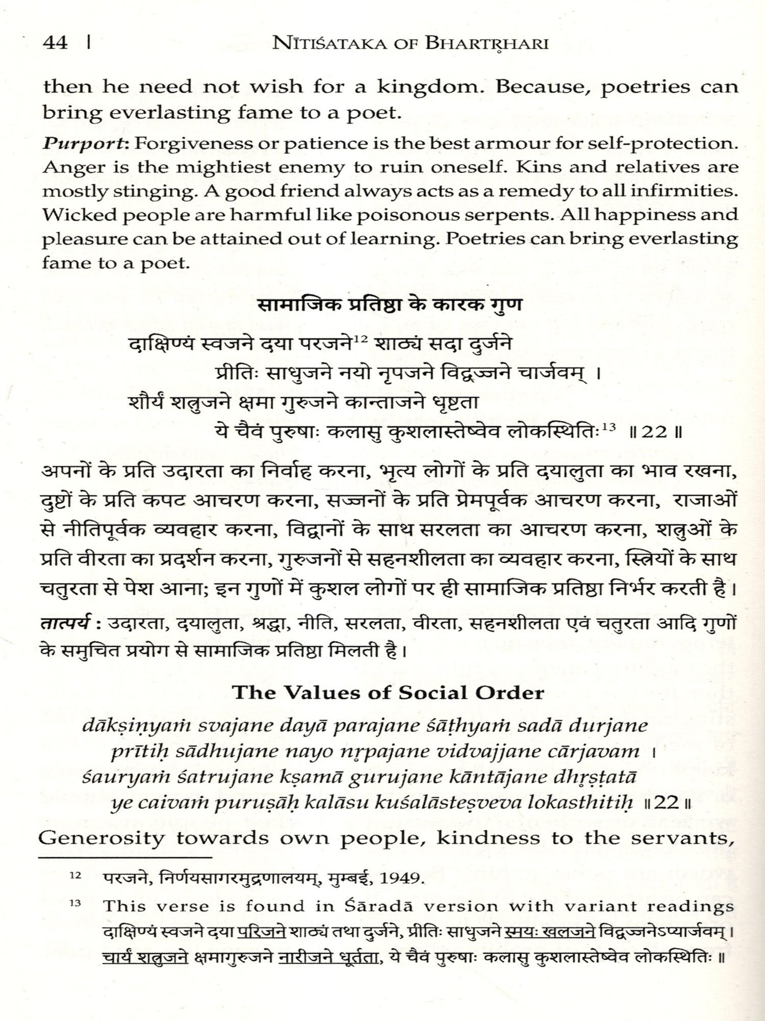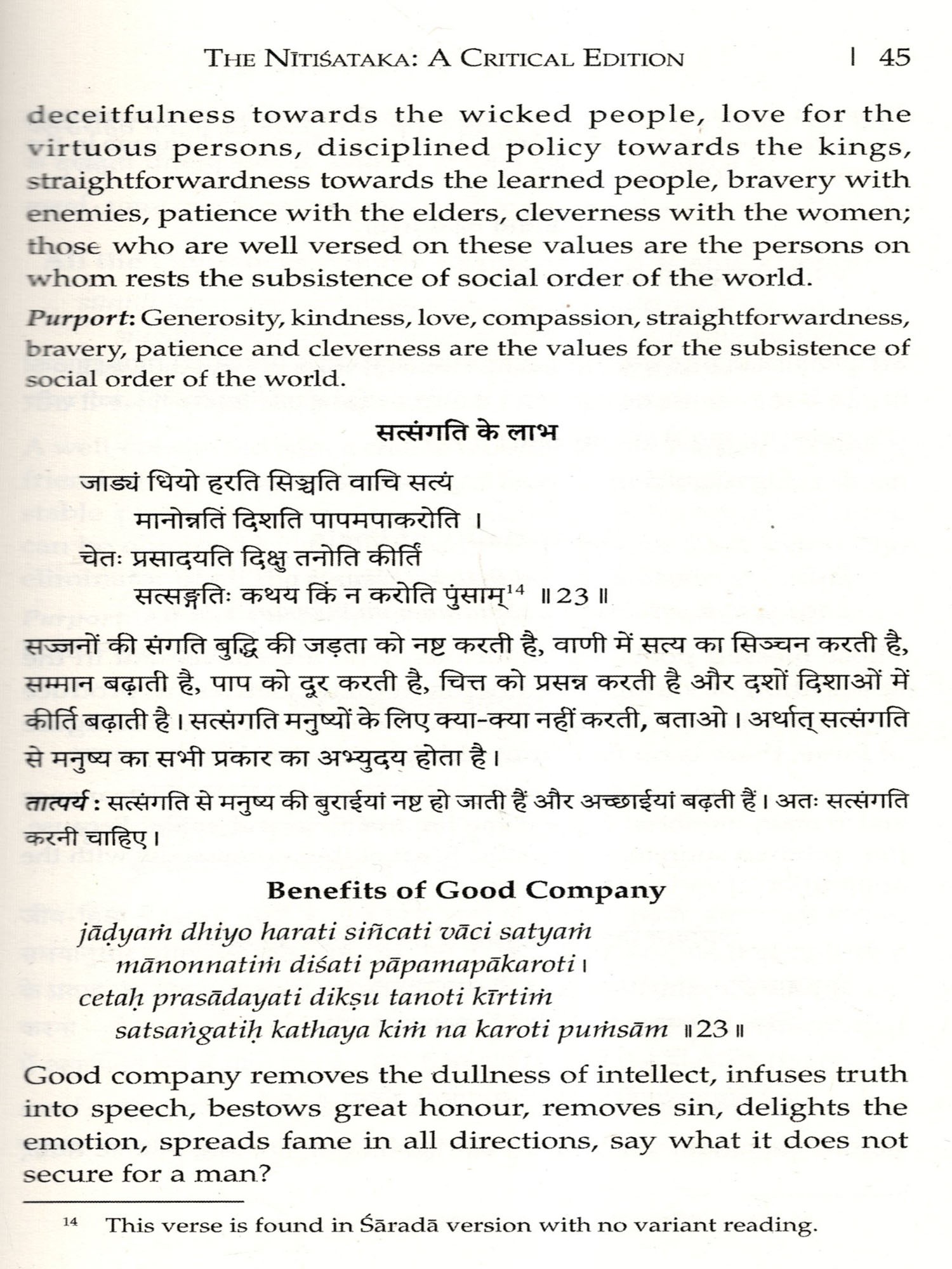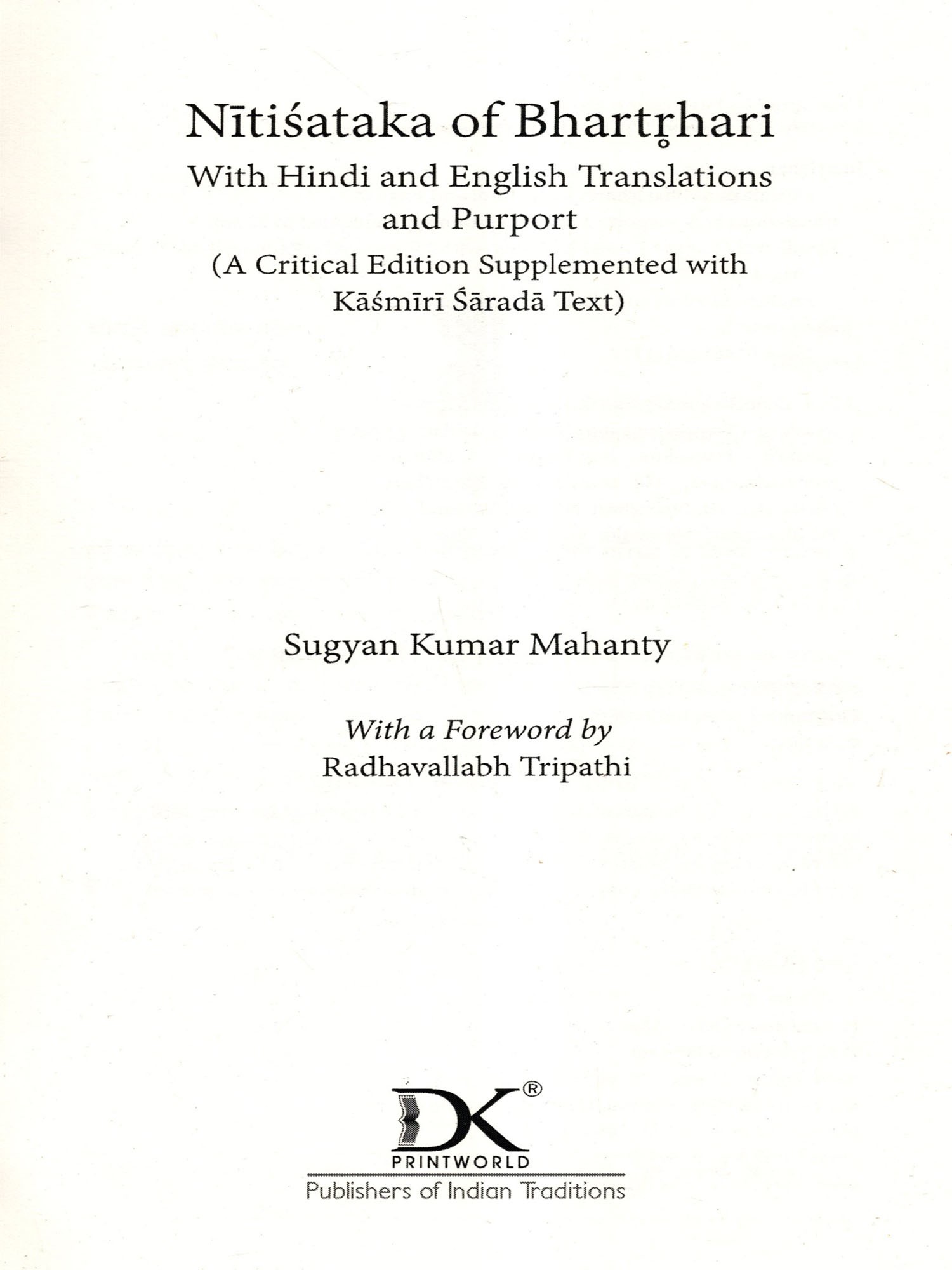 IT GIVES me immense pleasure to present this edition of the Nitisataka, ascribed to Bhartthari, along with Hindi and English translation and Kasmiri Sarada text with critical notes on variant Sarada readings. This edition owes its inception to Shri Susheel Mittal of D.K. Printworld (P) Ltd., New Delhi, who assigned me to prepare a flawless edition along with reliable Hindi and English translations.