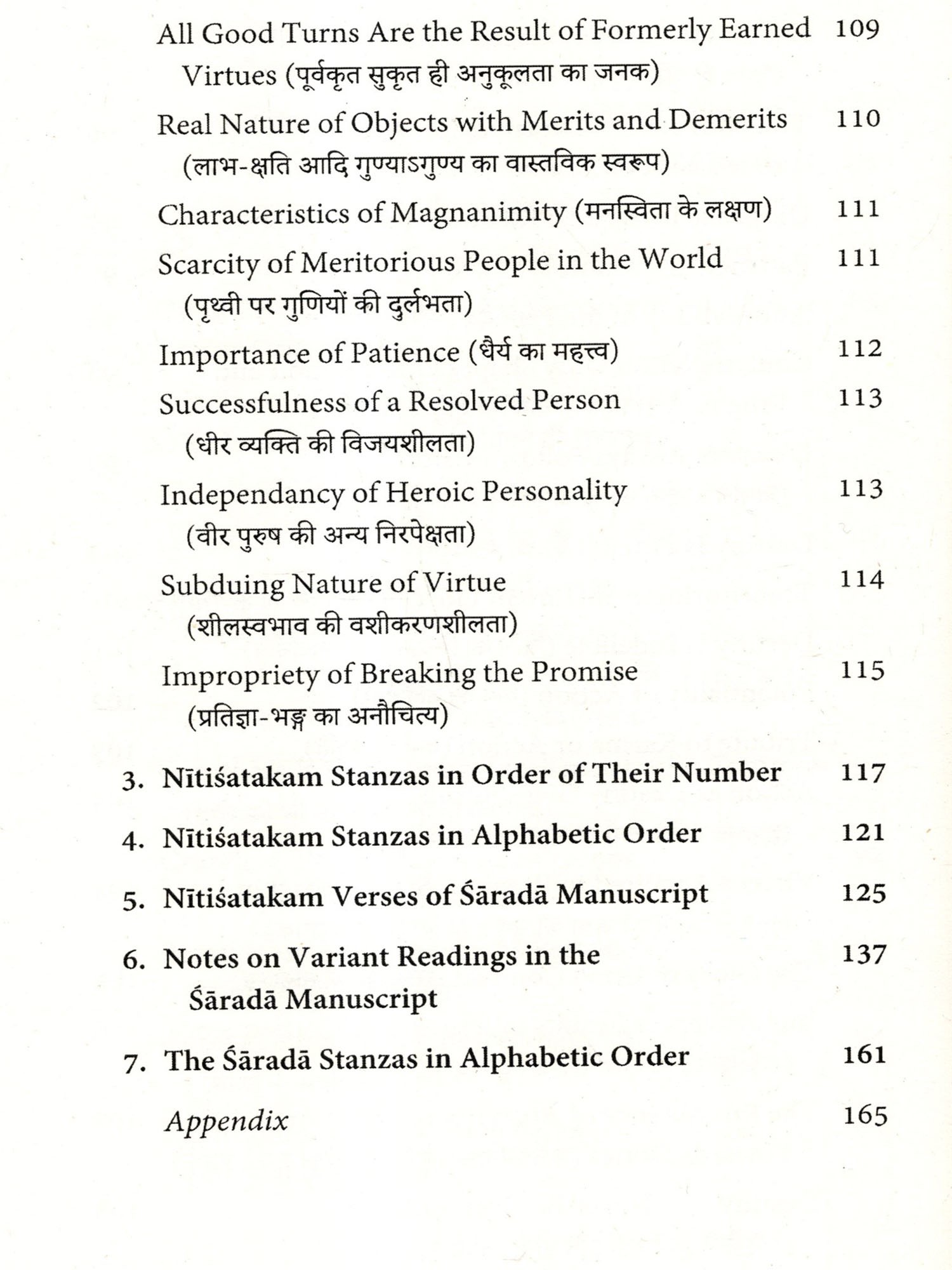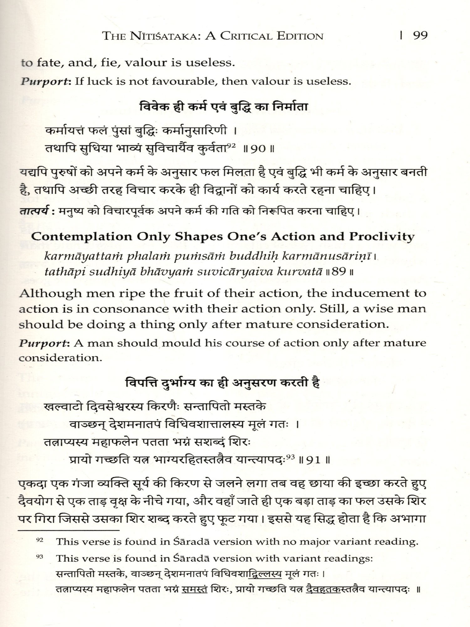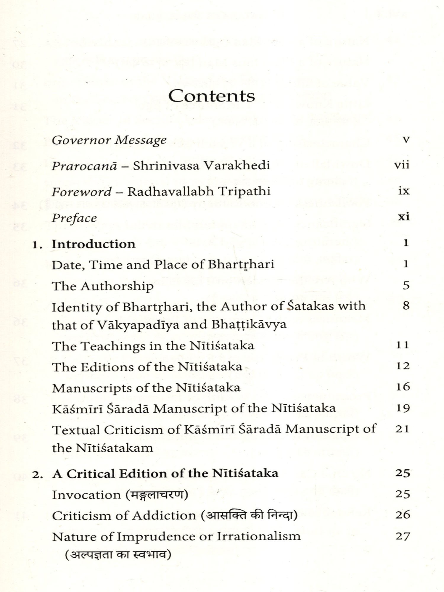 This has been prepared with commonly accepted verses of the Nitisataka in the available printed editions. But in the due course of my search of its different printed editions and manuscripts, I discovered a single copy of Kasmīrī Saradā manuscript, which was transcribed into Devanagari by me, that has been supplemented to this edition with critical notes on variations of Kasmiri Sarada script.