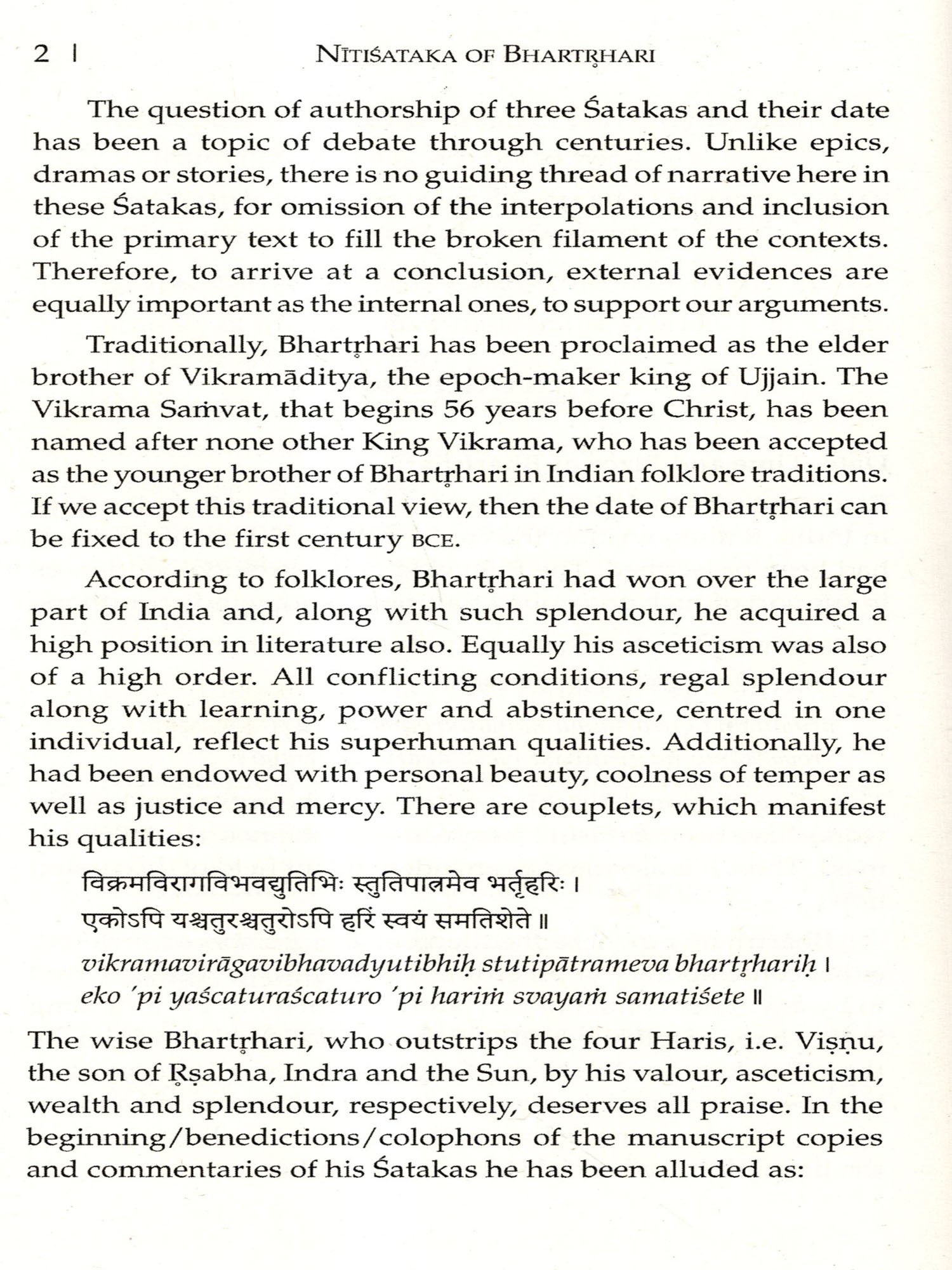 Dr. Mohanty rightly adjusts Bharthari as "a great sage, an imperial monarch as well as a celebrated poet". He has tried to fix the period of our poet with the help of some references which have not been noted by earlier scholars. In fact, the critical editions of celebrated poets like Bhartrhari should also provide perspectives from the tradition of commentators and great masters of Alaṁkārasastra. Dr. Mohanty has rightly referred to Ksemendra's citation of Bharthari's verse.