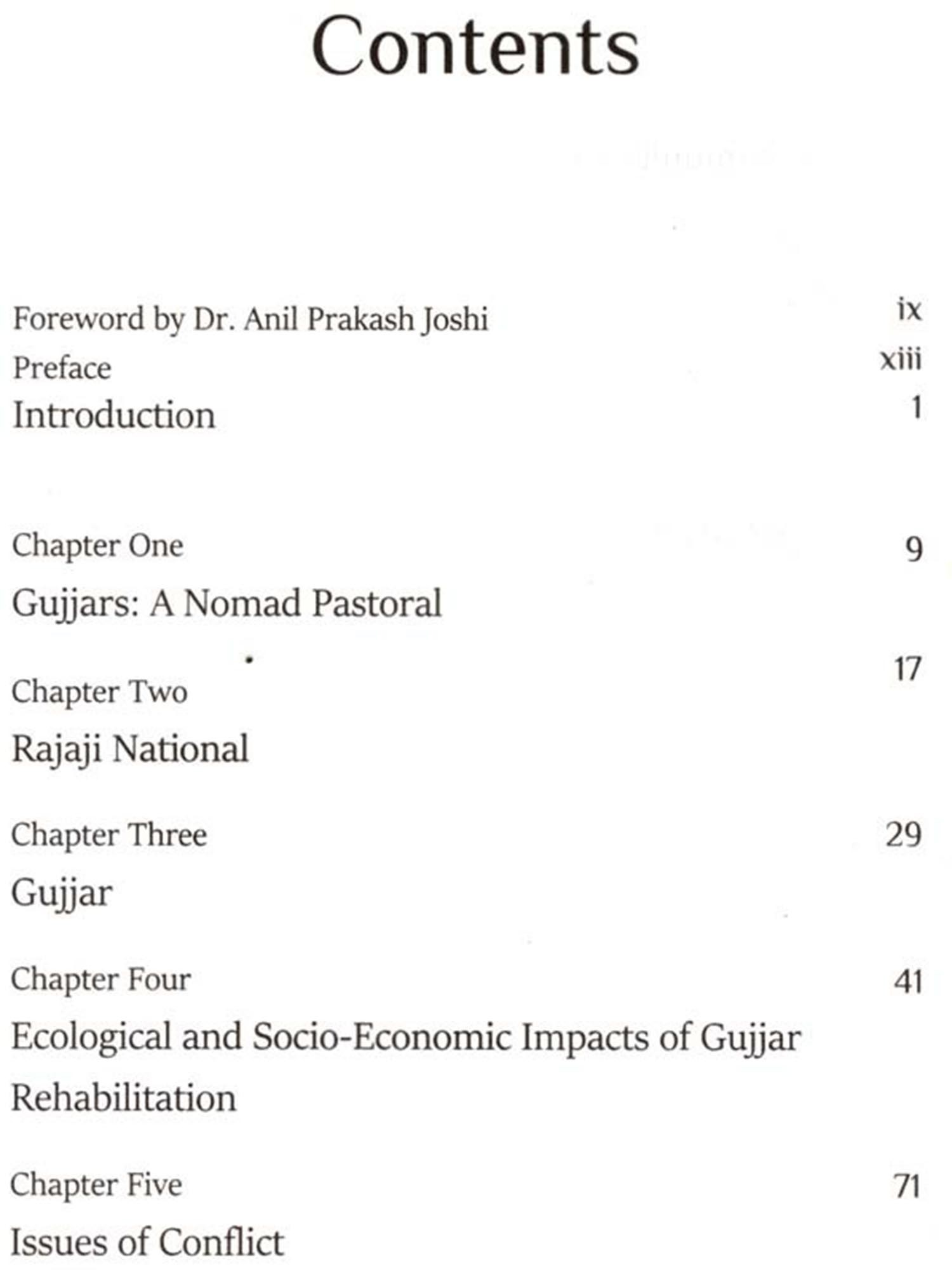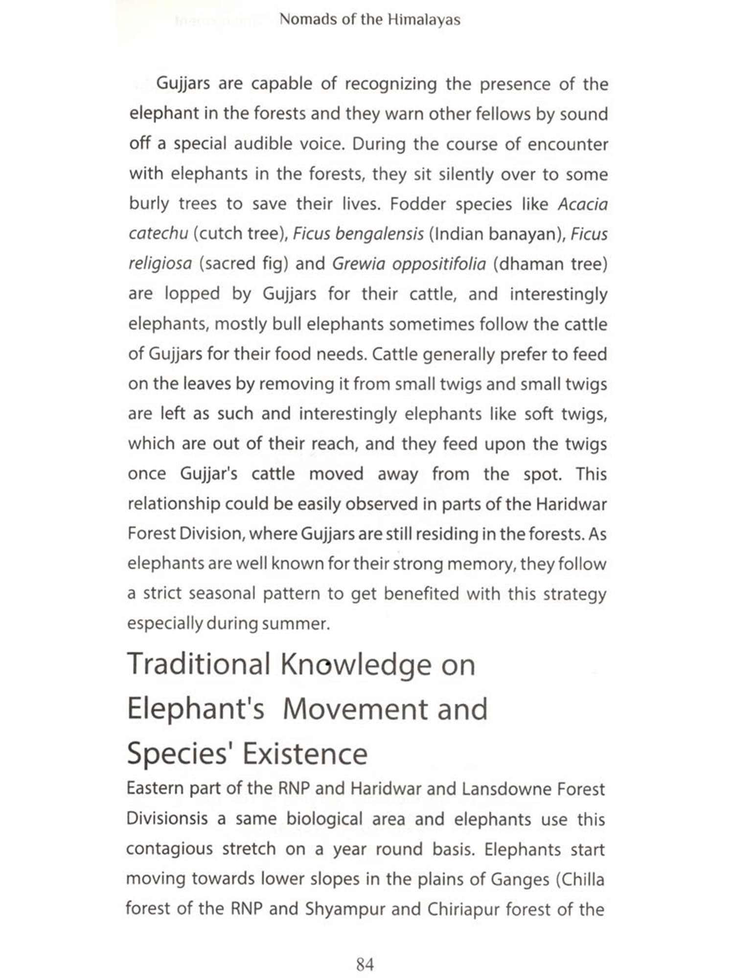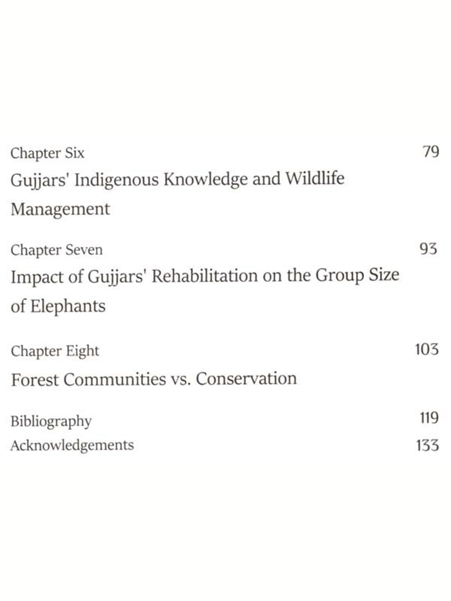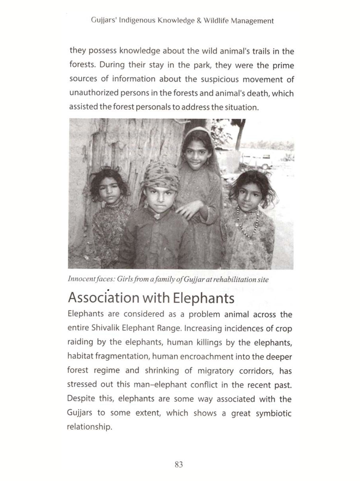Chapter six of the book precisely describes about some of the aspects of the Gujjars' indigenous knowledge; indeed, such lessons could be considered during the formulation of working plans of the protected areas. Chapter seven explores the impact of rehabilitation of Gujjars on the group size of the elephants. However, Chapter eight represents some of the case studies on role of the communities in forest and wildlife conservation in different parts of the country.