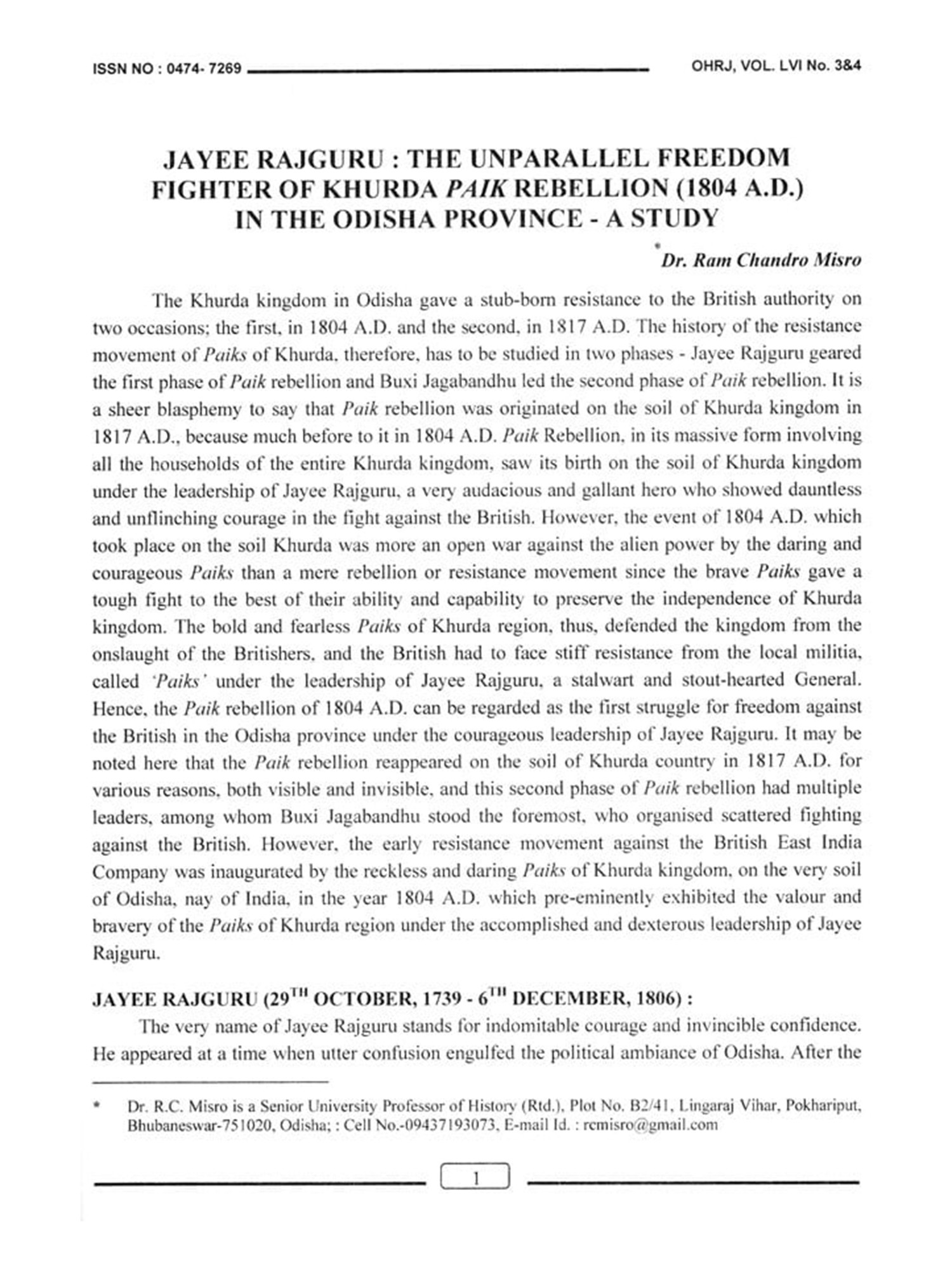 The Odisha Historical Research Journal: Volume LVI No. 3 & 4 (Including Articles on Jaina Remains of Choudwar and Freedom Struggle in Bhadrak)
