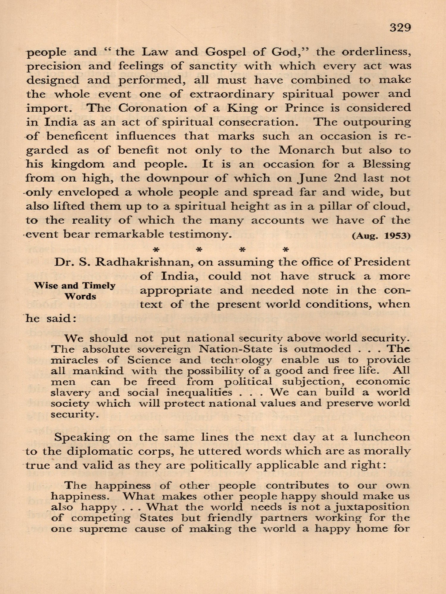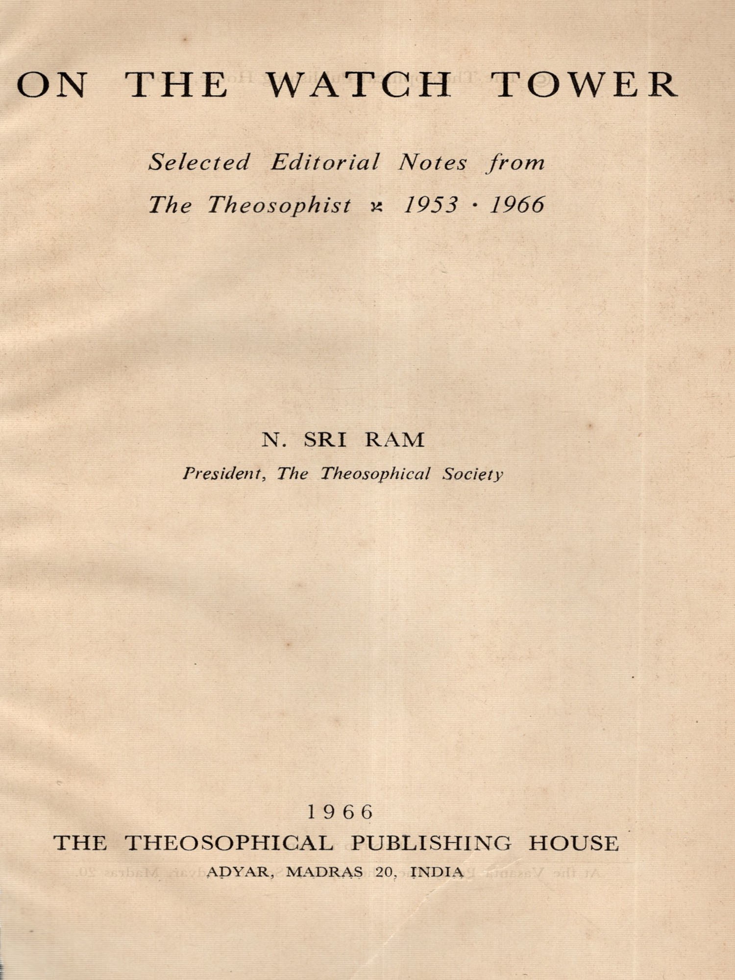 OVER the years readers of THE THEOSOPHIST in many parts of the world have expressed their appreciation of the Watch-Tower Notes written by the President of the Theosophical Society, Mr. N. Sri Ram. His comments on contemporary life, together with his observations concerning matters that are significant to the Theosophical world in general, appear monthly in the Society's magazine. There is abundant evidence that many who read that journal have found the Watch-Tower Notes a source of enlightenment and inspiration. Through his editorial pen Mr. Sri Ram shares his deep perception and practical application of the simple principles underlying many of the complex matters that man is faced with today.