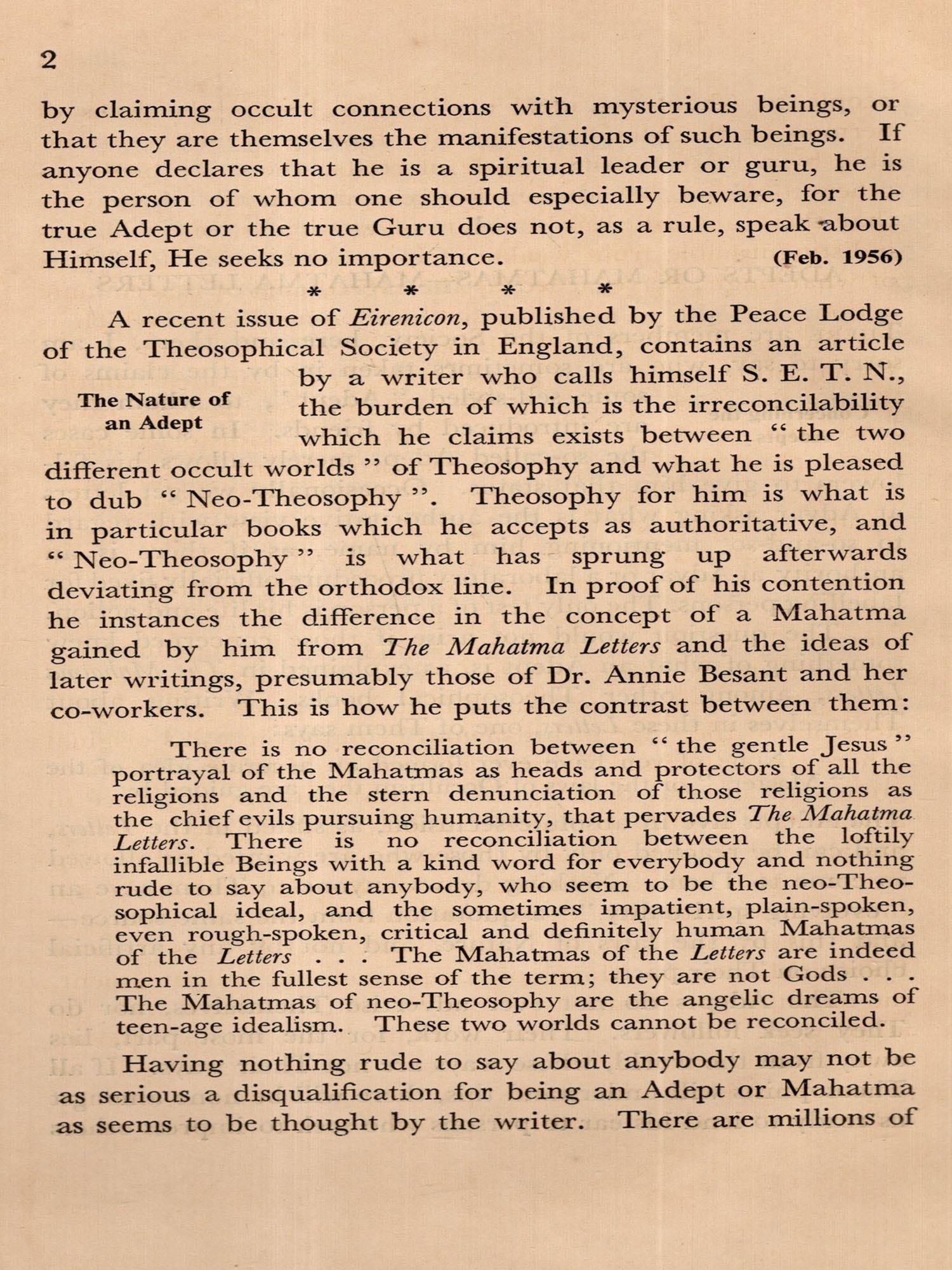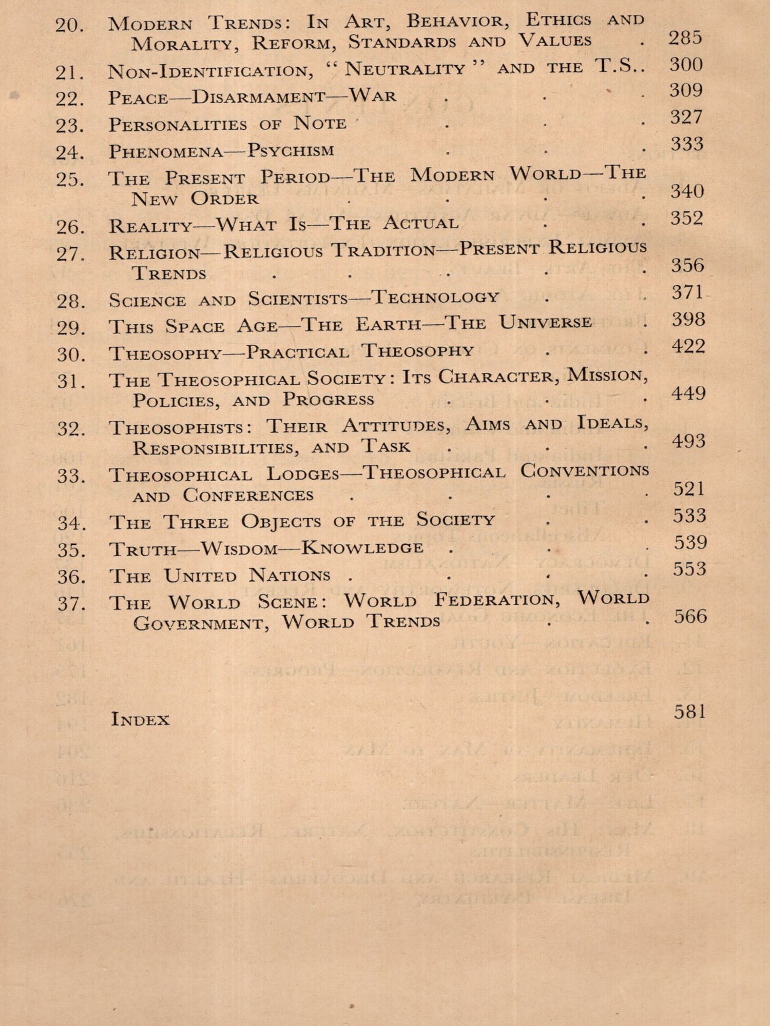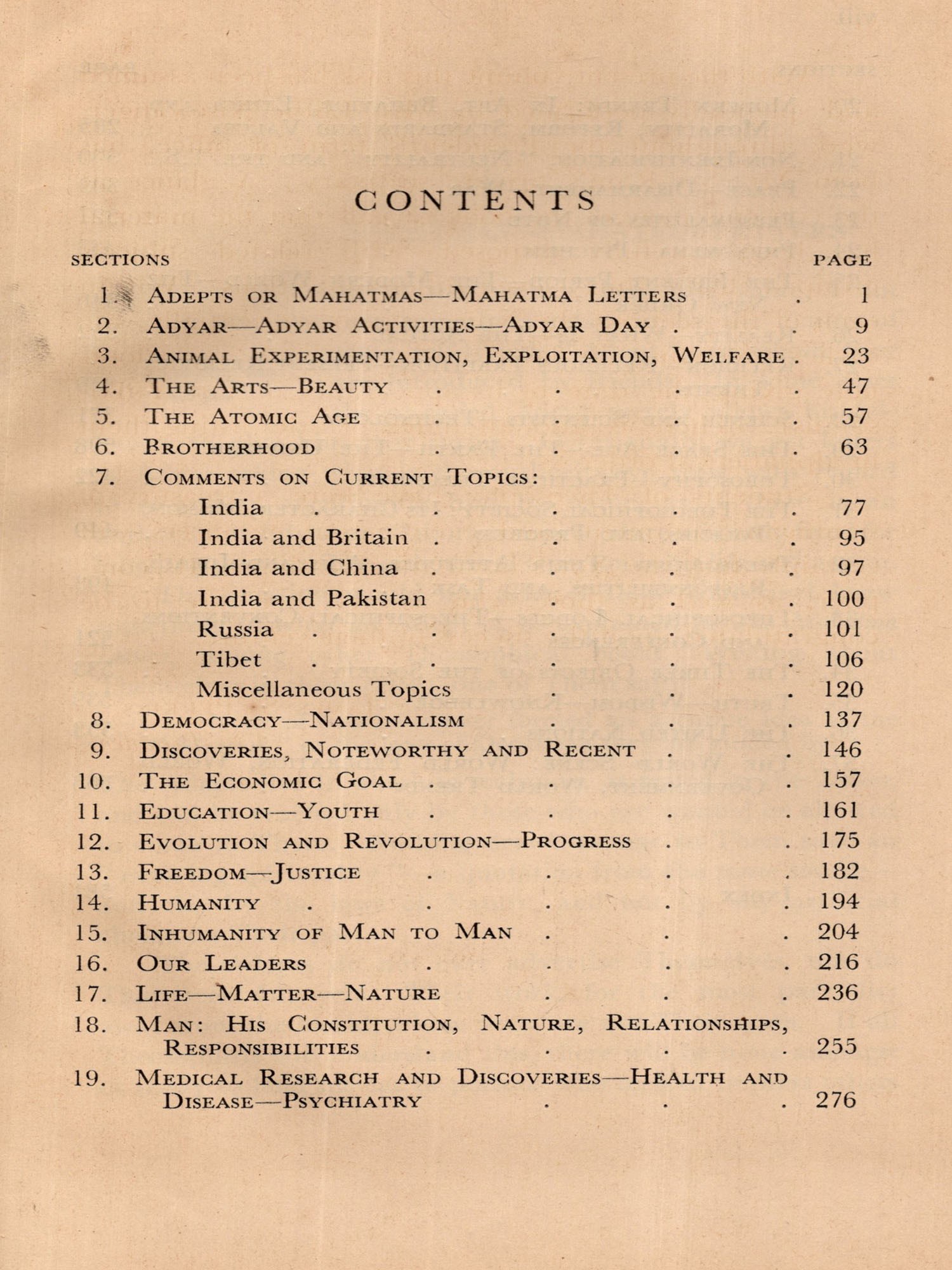 With the present volume this task has been assumed and splendidly performed by Miss Elithe Nisewanger, who, throughout the President's term of office, has been Mr. Sri Ram's private secretary. A glance at the contents page of the book reveals that the material has been carefully disposed, with related subjects grouped in the thirty-seven different sections. Within each of the sections the Notes appear sequentially, the earlier preceding the later writings. Each has a foot-note giving the date of its appearance in THE THEO-SOPHIST. There is also an index of titles listing them in alphabetical order.