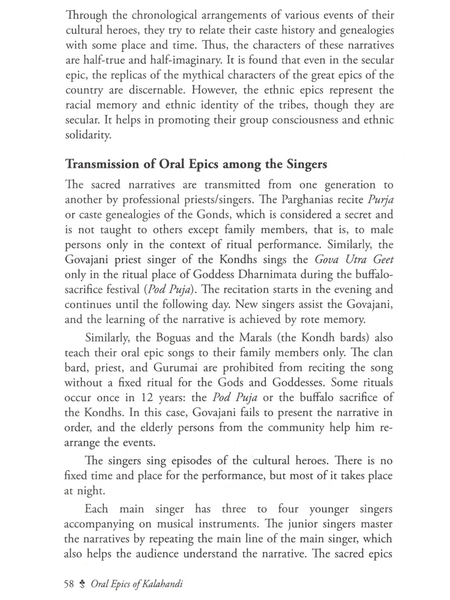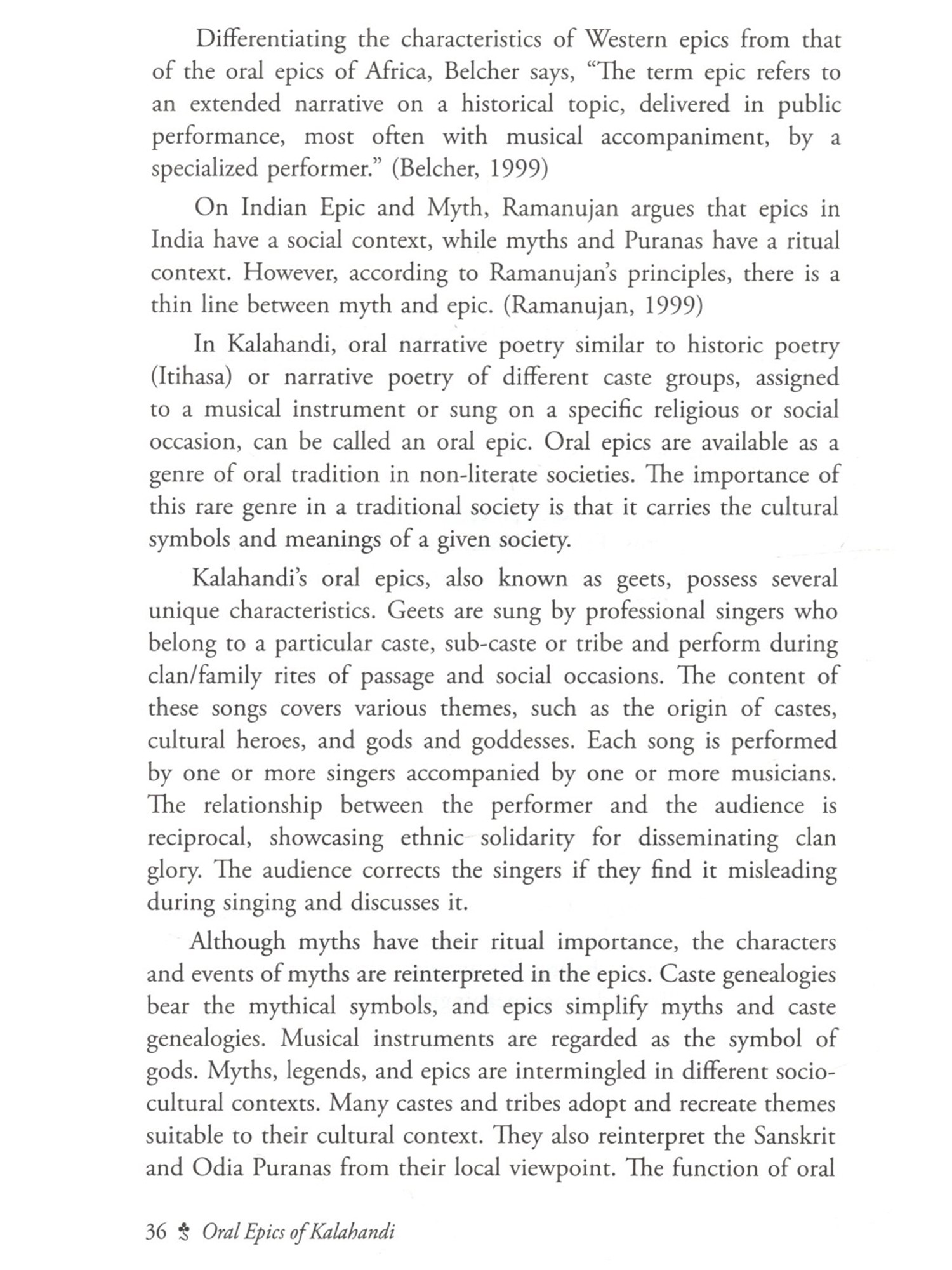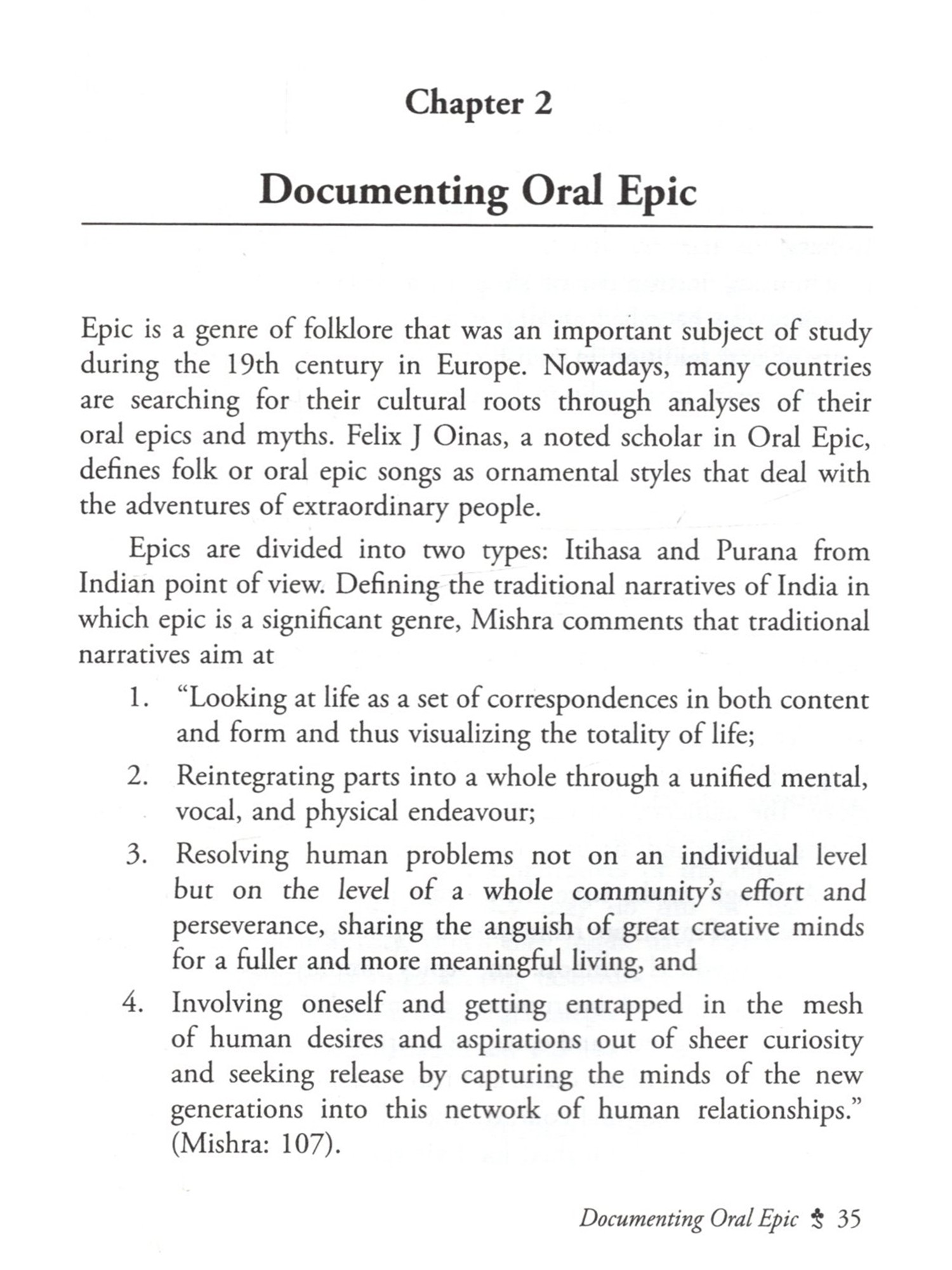 The study of oral epics, a relatively new field in folkloric literature, owes much to the pioneering efforts of Western scholars. They initiated primary research of oral epics in Europe and Africa, and over a period of time, it has evolved into one of the emerging genres of folklore research. In the late 19th century and early 20th century, Milman Parry's study of Homeric epics and his comparison with written epics significantly contributed to the study of oral epics. This comparison, known as the Oral-Formulaic Theory, has been instrumental in the study of epic literature. Following in his footsteps, Albert B. Lord's research on Yugoslavian epics further strengthened and established the comparative analysis of oral and written epics (Foley 1988: 155). Parry and Lord established a new discipline widely accepted worldwide in the literature study. Contemporary scholars such as Walter J. Ong, Joseph Duggan, Berkley Peabody, Michael Nagler, Gerald Else, and Ruth Finnegan expanded the horizon of the study of oral epics through their field research in Western countries. Their objective was to understand the composition of oral epics present among the oral singers and to examine the recurring epic formulae before the emergence of written epics. They also sought to understand the contribution of tradition-oriented epics in the construction and composition of written epics by great poets. The purpose was to establish how oral epics in performance substantially contributed to the framing of written epics in terms of form, content, style, and meter. David E. Bynum, Alain Renoir, Richard Janko, and Werner H. Kelber contributed to the Western oral literary tradition. Afterwards, the study of oral narratives in a performance context became prominent. Thus, the study of epics shifted from the text to composition-in-performance during this period. Traditional epics were initially performed in socio-religious contexts, which inspired singers and writers to capture their stories in written form. Oral epics were created collectively and passed down through generations, while written epics were the work of individual authors and recorded in written format. Despite this difference, oral epics' style, language, and function have significantly influenced written epics. In the 1960s, scholars identified a few critical differences between written and oral epics. For example, written epics are authored by a poet in a written text form and are meant to be read before an audience, whereas oral epics are performed live and rely on a collective memory to survive. Scholars from Western countries such as Felix J Oinas, Milman Parry, Albert B Lord, Otto Rank, Lauri Honko, John Brockington, Isidore Okpewho, John Miles Foley, Stephen Belcher, and many others have studied the oral epic tradition and attempted to define its characteristics. They discussed oral epics' content, form, stylistics, and texture and tried to put them into written form. Oral epics have become a fascinating genre of folklore research. Over the past 30 years, folklore fellows of oral epics from around the world have established a new dimension to the study of epic traditions, creating a discipline in the study of oral epics both in the East and West. This has helped me understand the cultural interactions in many living cultures worldwide. From the 1960s to 1990s, scholars from the West started studying the African epics, which represent the mythological and historical accounts of the land and people of Africa. Scholars like Isidore Okpewho, John William Johnson, and Daniel Biebuyck, along with African and Western scholars, researched the oral epics of Africa and discovered the rich African oral epic tradition representing their history and culture. Scholars like Richard Dorson, Felix J. Oinas, Axel Olrik, Dan Ben-Amos, and Ruth Finnegan also studied the epics of Africa. However, the African scholars from indigenous scholarship questioned the authenticity of the research model and reinterpreted the African epics from their socio-historical context. Scholars like Isidore Okpewho, M.M. Mulokozi. and Stephen Belcher studied African epics from a native's point of view, defining the function and meaning of using the genre. Isidore Okpewho stressed traditional African art in general and analyzed the cultural resources present in the community. He also studied narrative style's form, structure, function, and nature in his seminal work "The Epic in Africa". African scholars' study of oral epics of Africa revealed the African worldview of looking at a narrative from a historical perspective with cultural continuity. To them, oral epic/narratives are a part of their social reproduction. Therefore, the study of oral tradition must be viewed from a socio-historical point of view rather than looking at the epic as a text. The social function of epics determines the authenticity of epics in African society. In his book "Epic Traditions of Africa," Stephen Belcher mentions the wide range of oral epics encompassing greater Africa. He presents an exploratory world of epics prevalent in Africa through his diachronic study of epics about history, caste genealogies, and myths. The study of oral epics became more concrete because of the efforts of Alan Dundes and John Miles Foley. Foley's research on Serbo-Croatian oral epics established the scientific analysis of text and performance and a critical analysis of the grammar of oral epics. Scholars such as Minna Skafte Jensen, Joseph Harris, and Dell Hymes also contributed to studying European epics through their work. Similarly, Karl Reichl and Arthur Hatto studied Turkish and Siberian epics, respectively, and explored the cultural identity of many countries. In Europe, Lauri Honko, a Finnish folklorist, played a pivotal role in globalizing the study of oral epics.