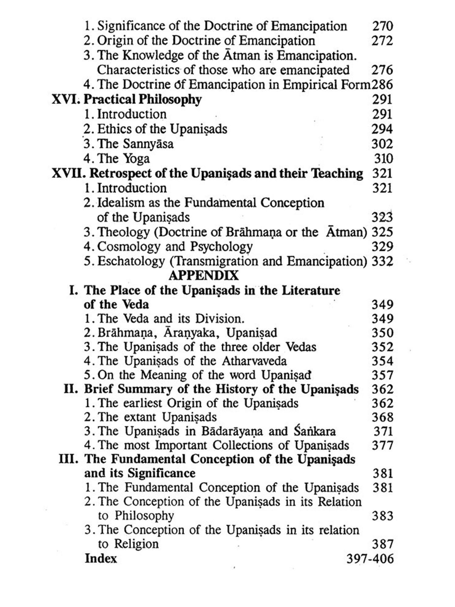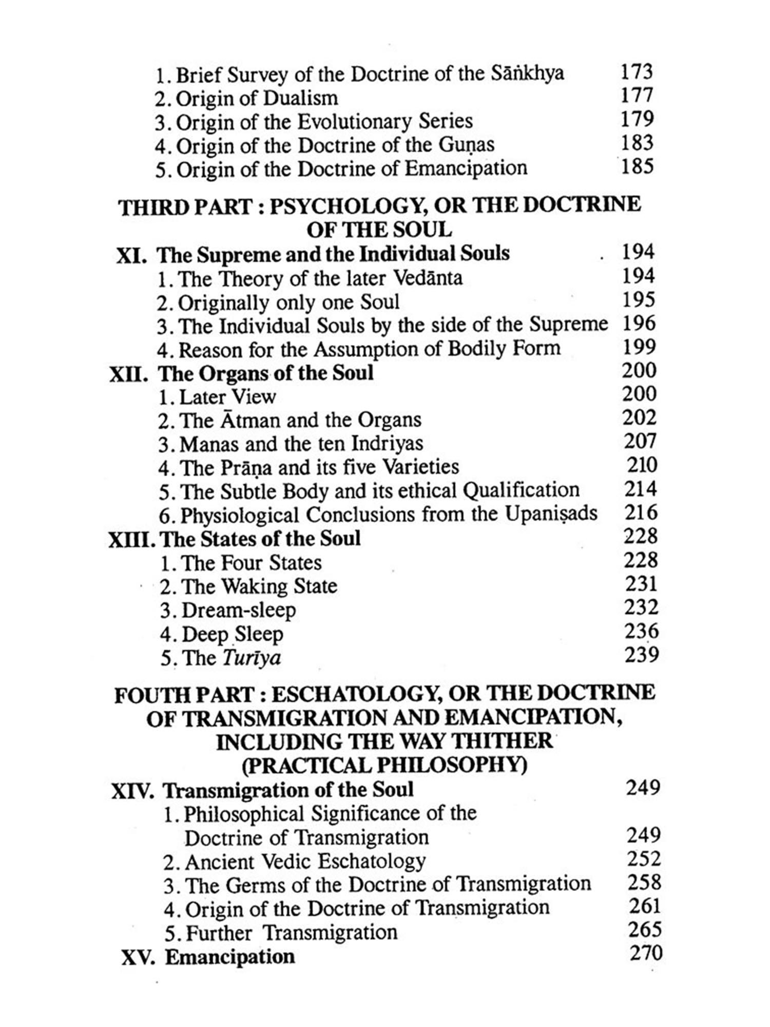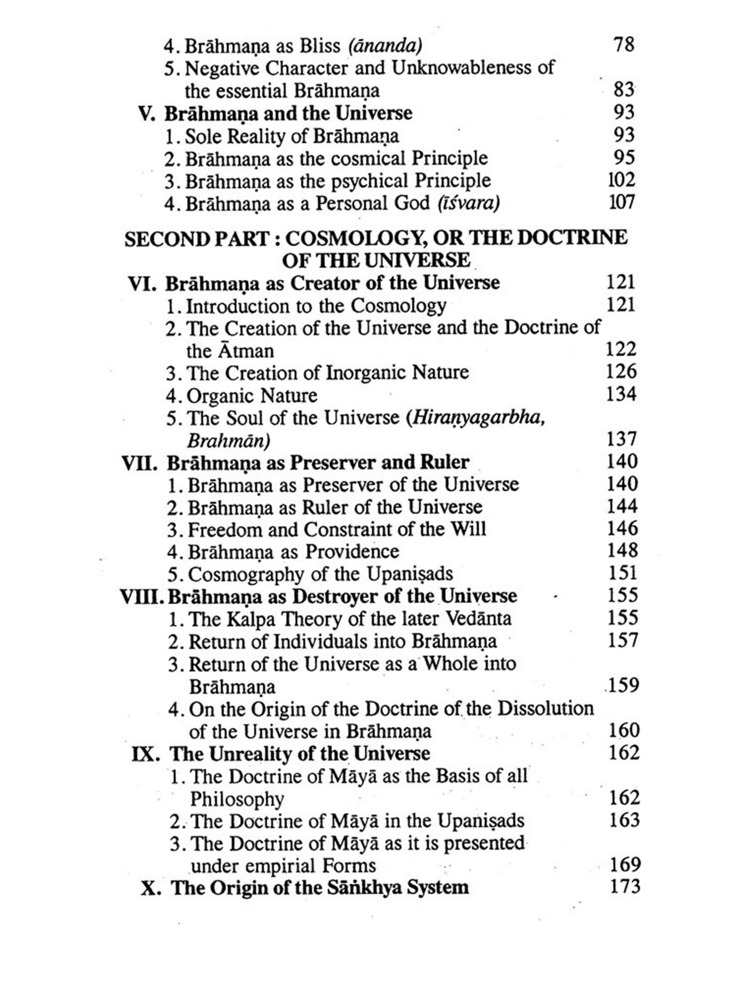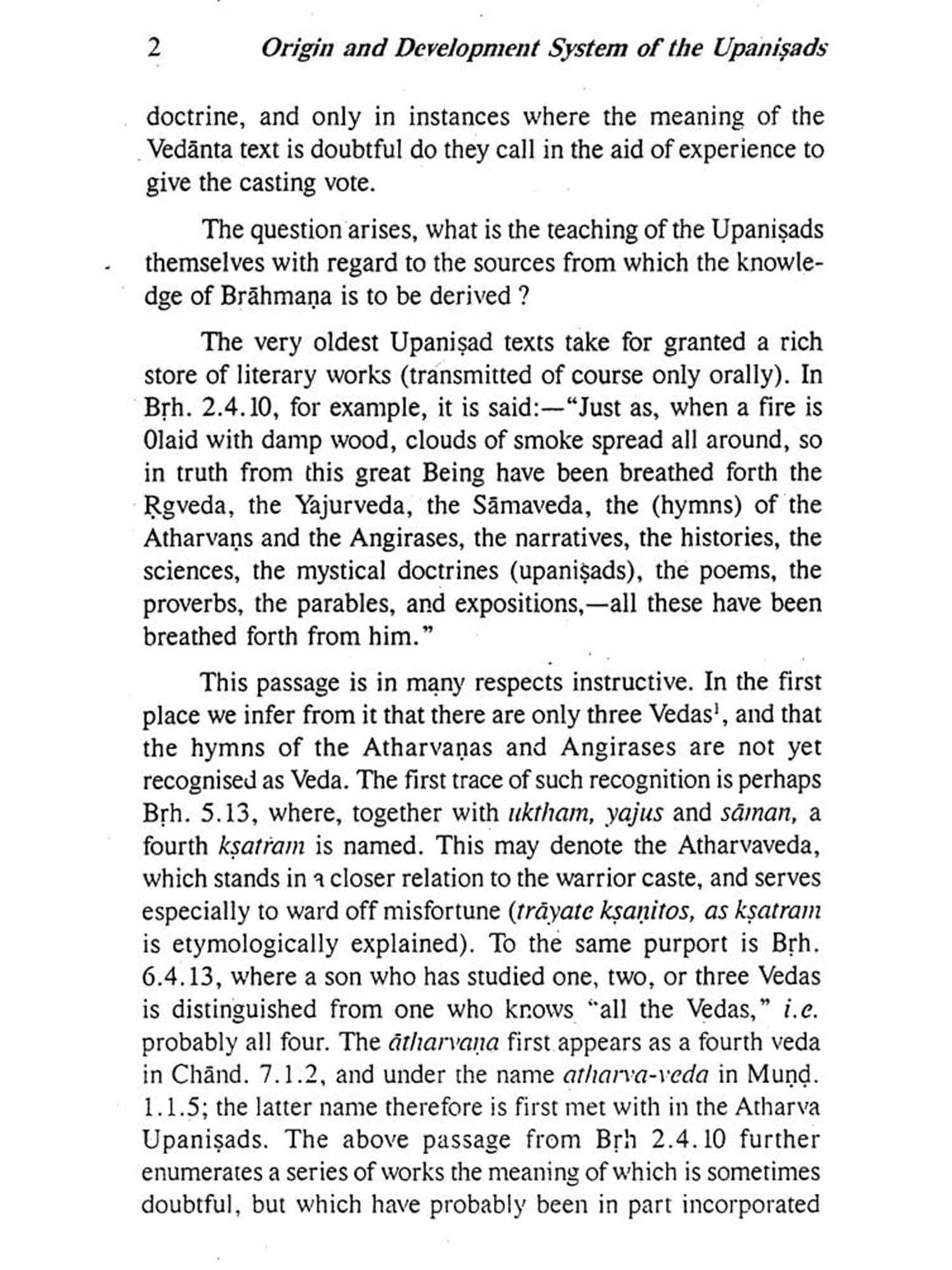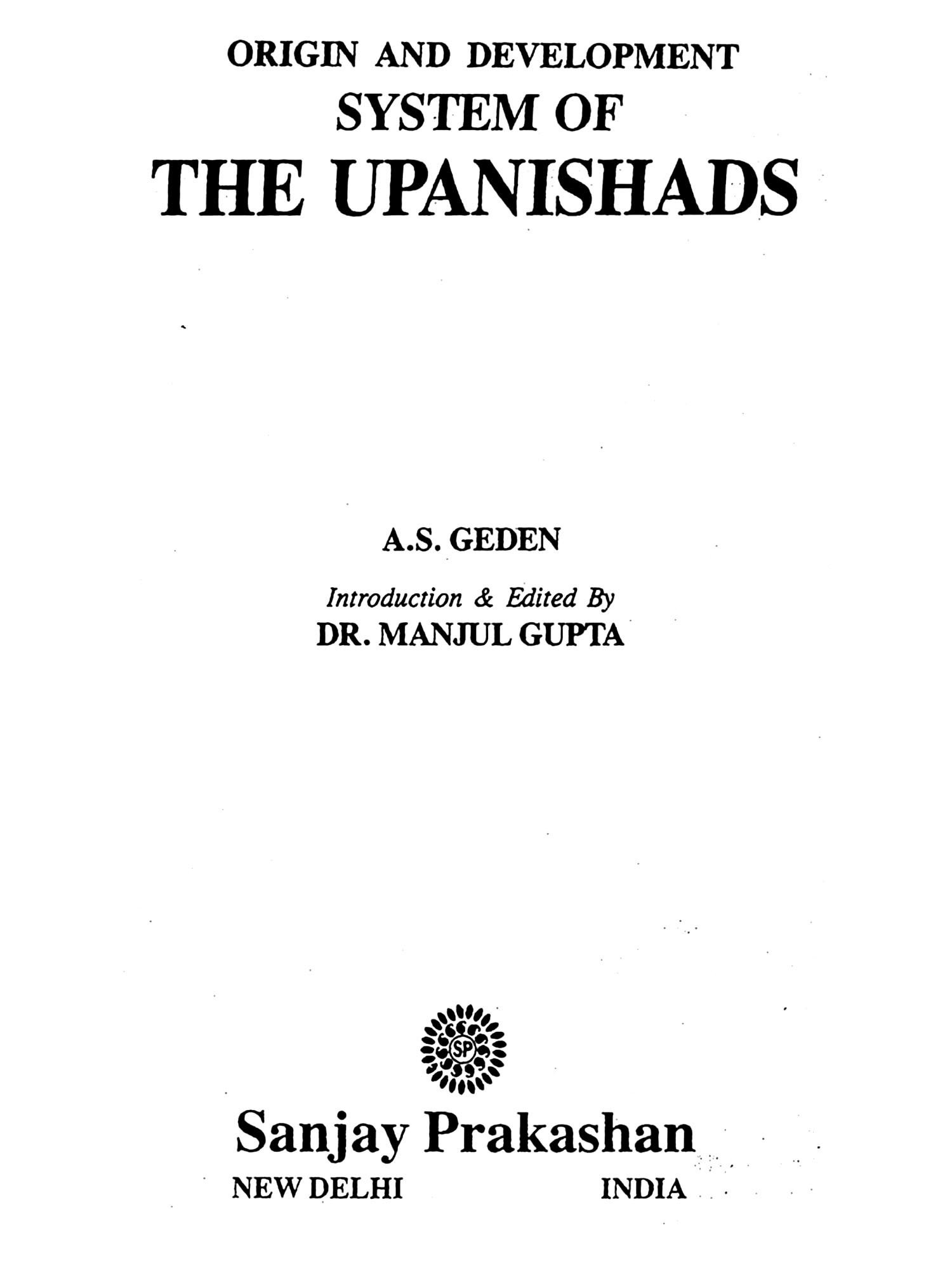 The present book 'Origin and Development System of the Upaniṣads' is written by Geden, A.S. The book reflects the hard labour, diligence and deep in probing of the author. The book is written in clear and lucid style. Before coming to the actual discussion of the system of Upaniṣads, the another has discussed the place, meaning, devision of Upanisads in the introduction part of the book. The Upanişads are often referred and known as Vedanta, hence, the author has discussed the place of Upaniṣads in the Literature of the Veda. The Vedic literature has been classified into four principal parts corres-ponding to the four priestly offices at the Soma sacrifice namely Rg, Yajus, Sâma and Atharvaveda, each comprising a Samhita, a Brāhmaņa, a sūtra. The Brahmaņa again is further divided into three orders by the exponents of Vedanta, although their contents are closely connected and overlap each other-Vidhi, Arthvāda and Vedānta or Upanișad. Aranyakas are the link between Brahmaņas and Upaniṣads. But the separation of the material in all the three is not strictly found. Then the Upani-sads of the three Vedas have been mentioned by the author and in his view the case is entirely different with the numerous Upanişads found in the Atharvaveda. The names of the Atharva Upanişads are derived partly from the contents and partly from any accidental circumstance.
