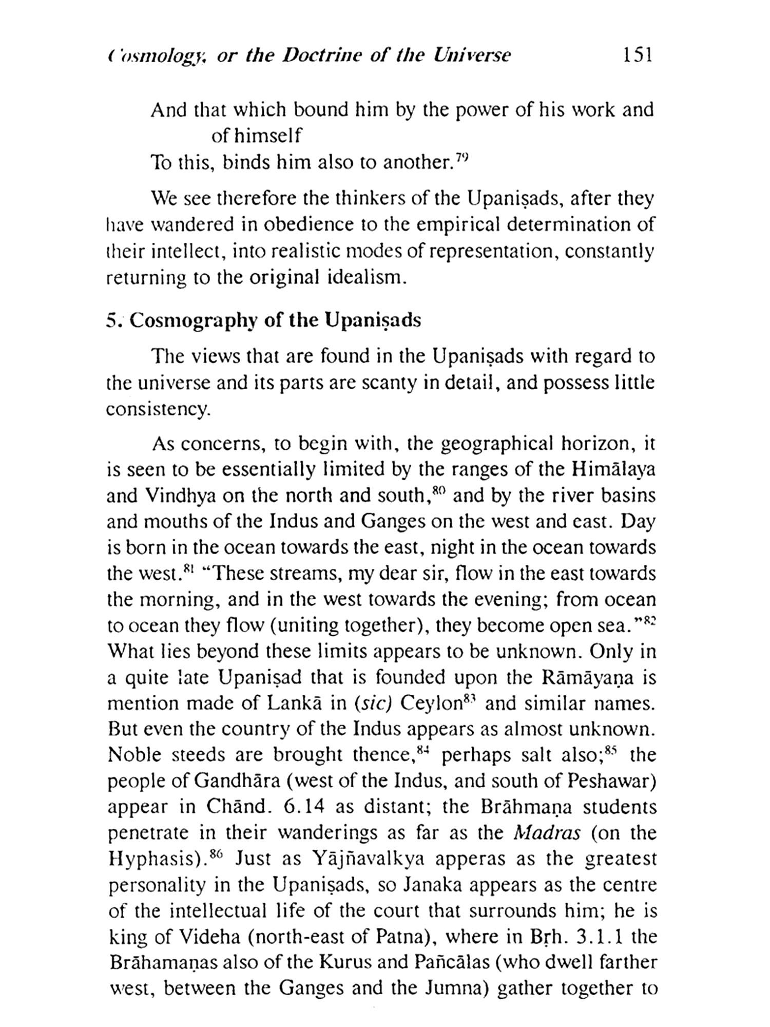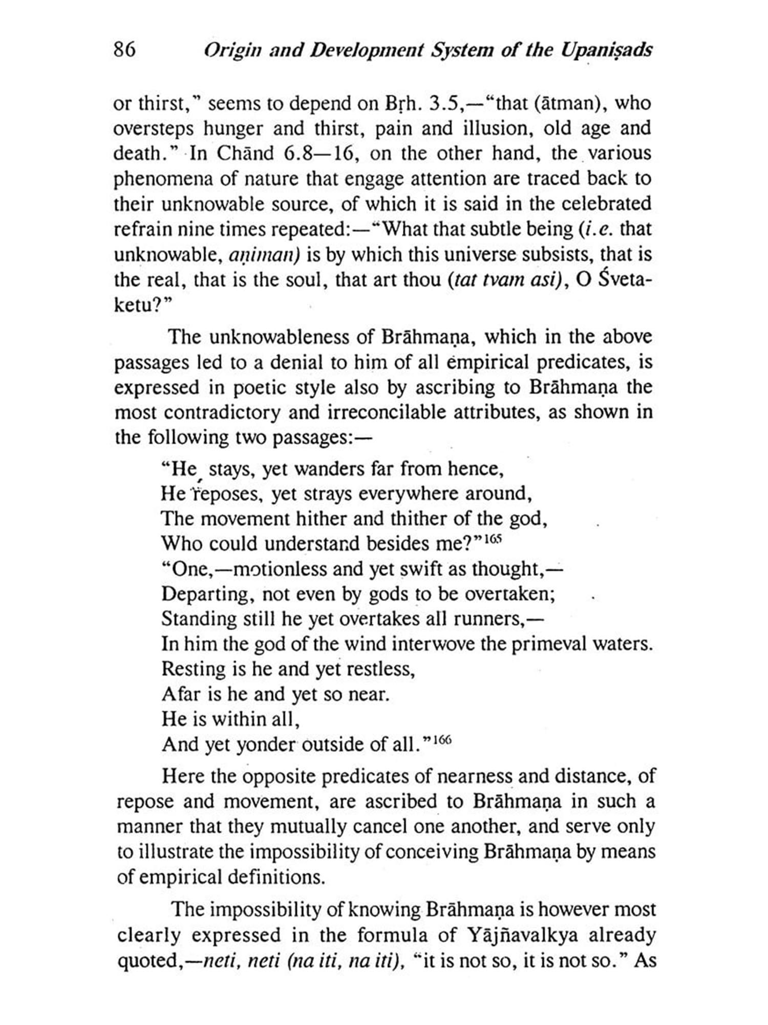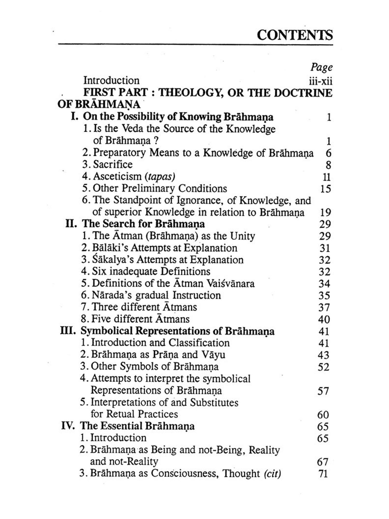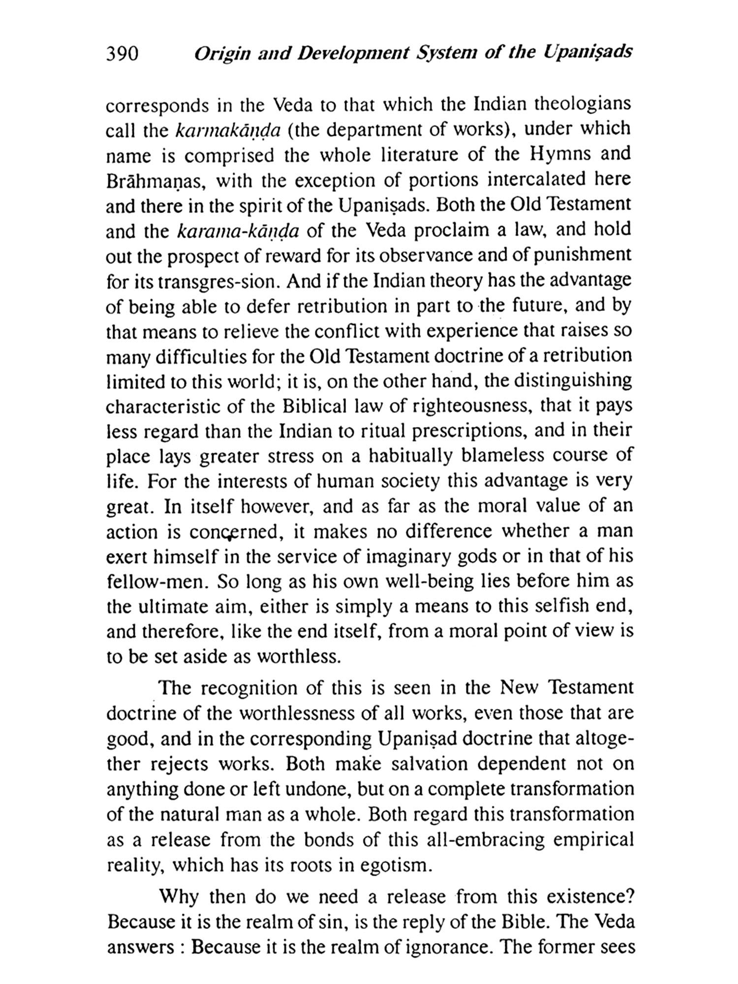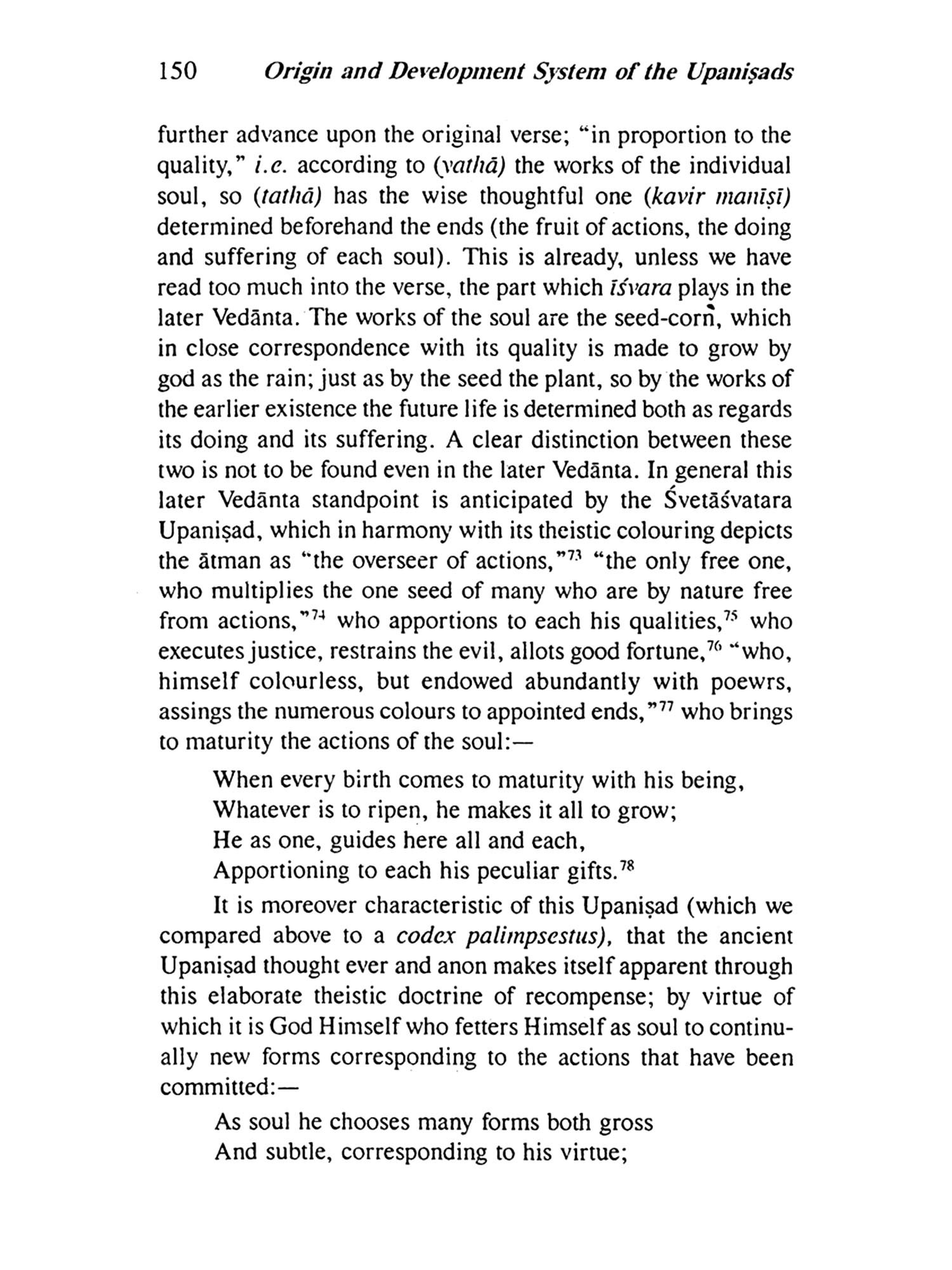 The present book 'Origin and Development System of the Upaniṣads' is written by Geden, A.S. The book reflects the hard labour, diligence and deep in probing of the author. The book is written in clear and lucid style. Before coming to the actual discussion of the system of Upaniṣads, the another has discussed the place, meaning, devision of Upanisads in the introduction part of the book. The Upanişads are often referred and known as Vedanta, hence, the author has discussed the place of Upaniṣads in the Literature of the Veda. The Vedic literature has been classified into four principal parts corres-ponding to the four priestly offices at the Soma sacrifice namely Rg, Yajus, Sâma and Atharvaveda, each comprising a Samhita, a Brāhmaņa, a sūtra. The Brahmaņa again is further divided into three orders by the exponents of Vedanta, although their contents are closely connected and overlap each other-Vidhi, Arthvāda and Vedānta or Upanișad. Aranyakas are the link between Brahmaņas and Upaniṣads. But the separation of the material in all the three is not strictly found. Then the Upani-sads of the three Vedas have been mentioned by the author and in his view the case is entirely different with the numerous Upanişads found in the Atharvaveda. The names of the Atharva Upanişads are derived partly from the contents and partly from any accidental circumstance.