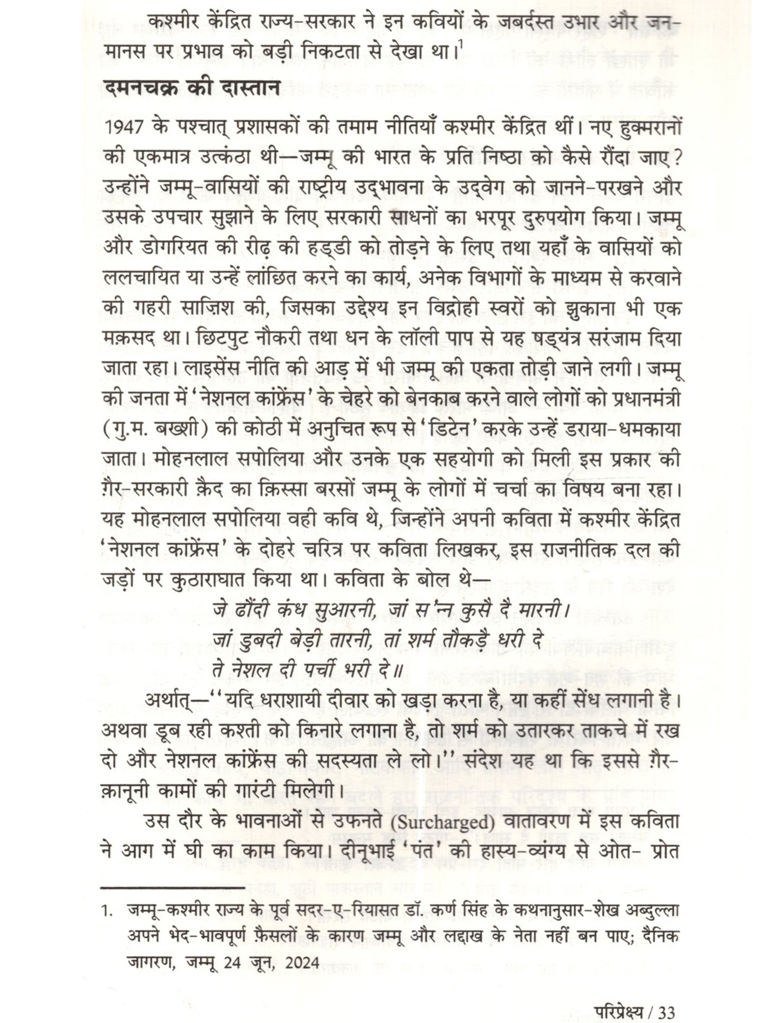 भूरिः प्रशंसा की है। डोगरी में जहाँ उनके काव्य-सोष्टय को सराहा जाता है, वहीं हिंदी