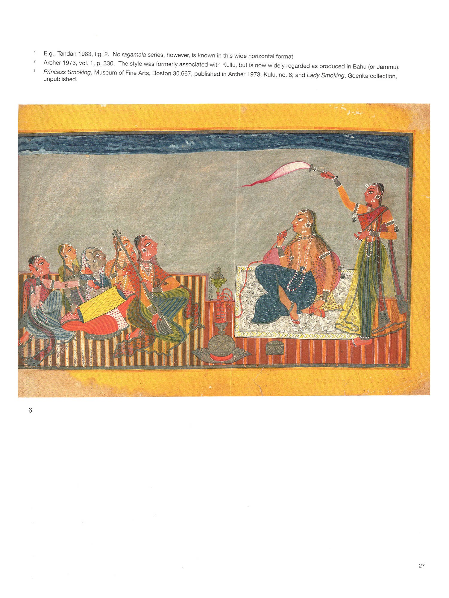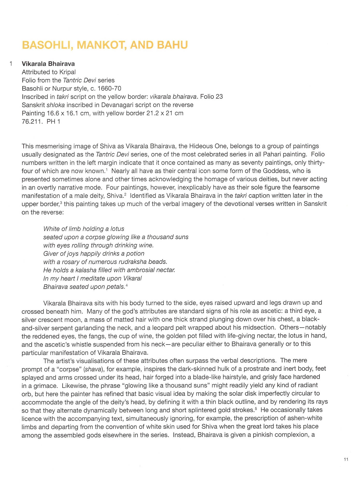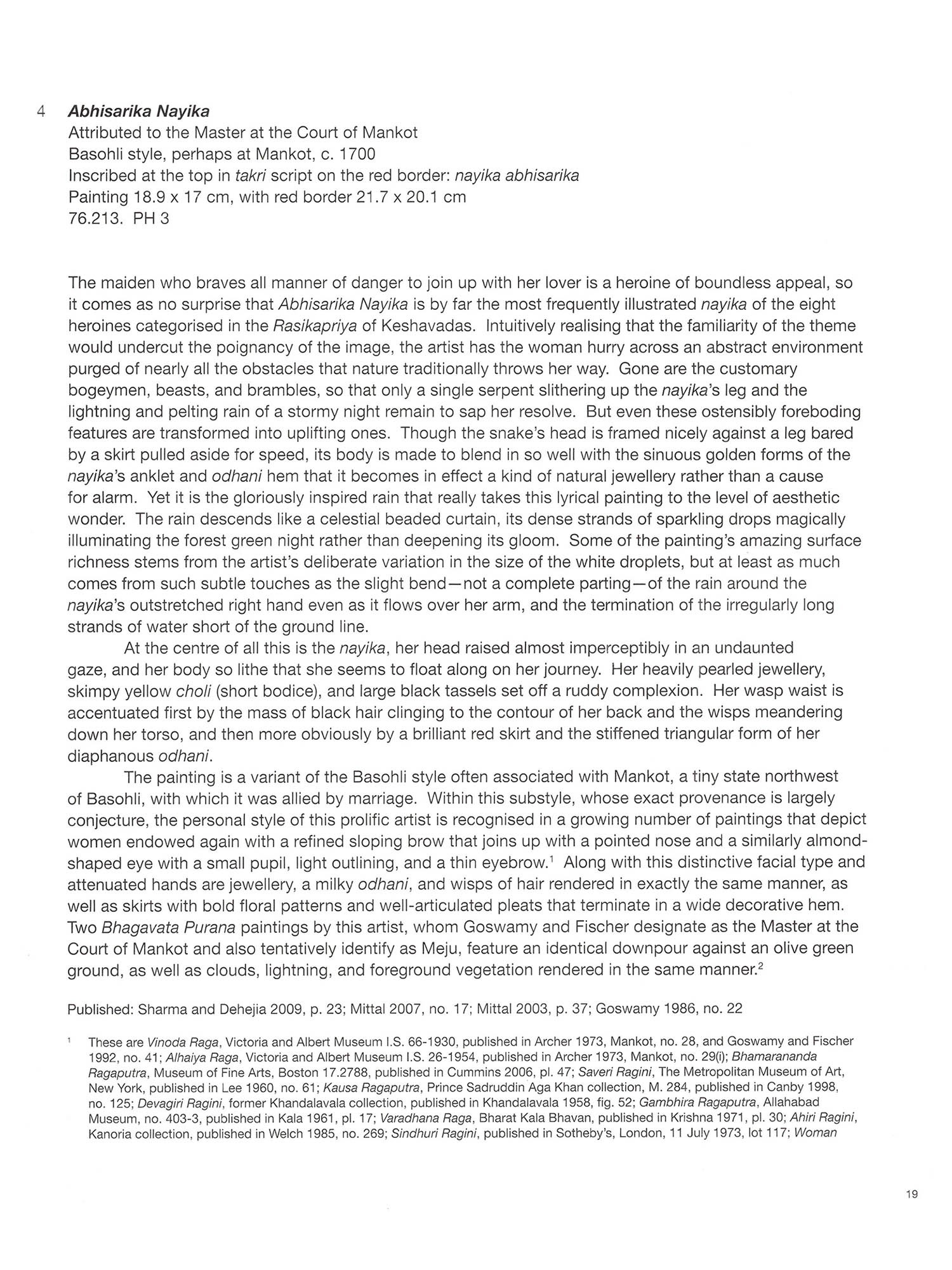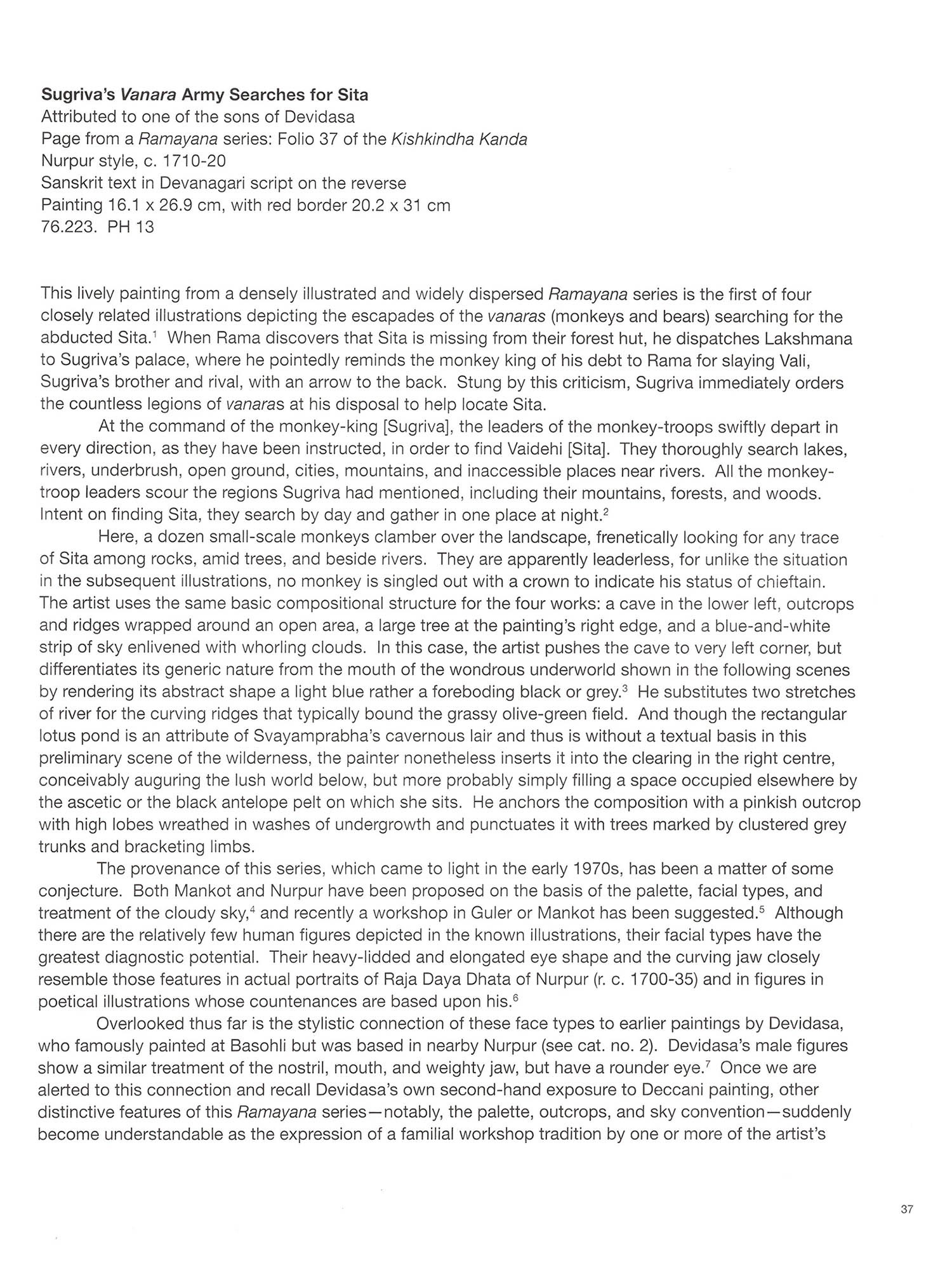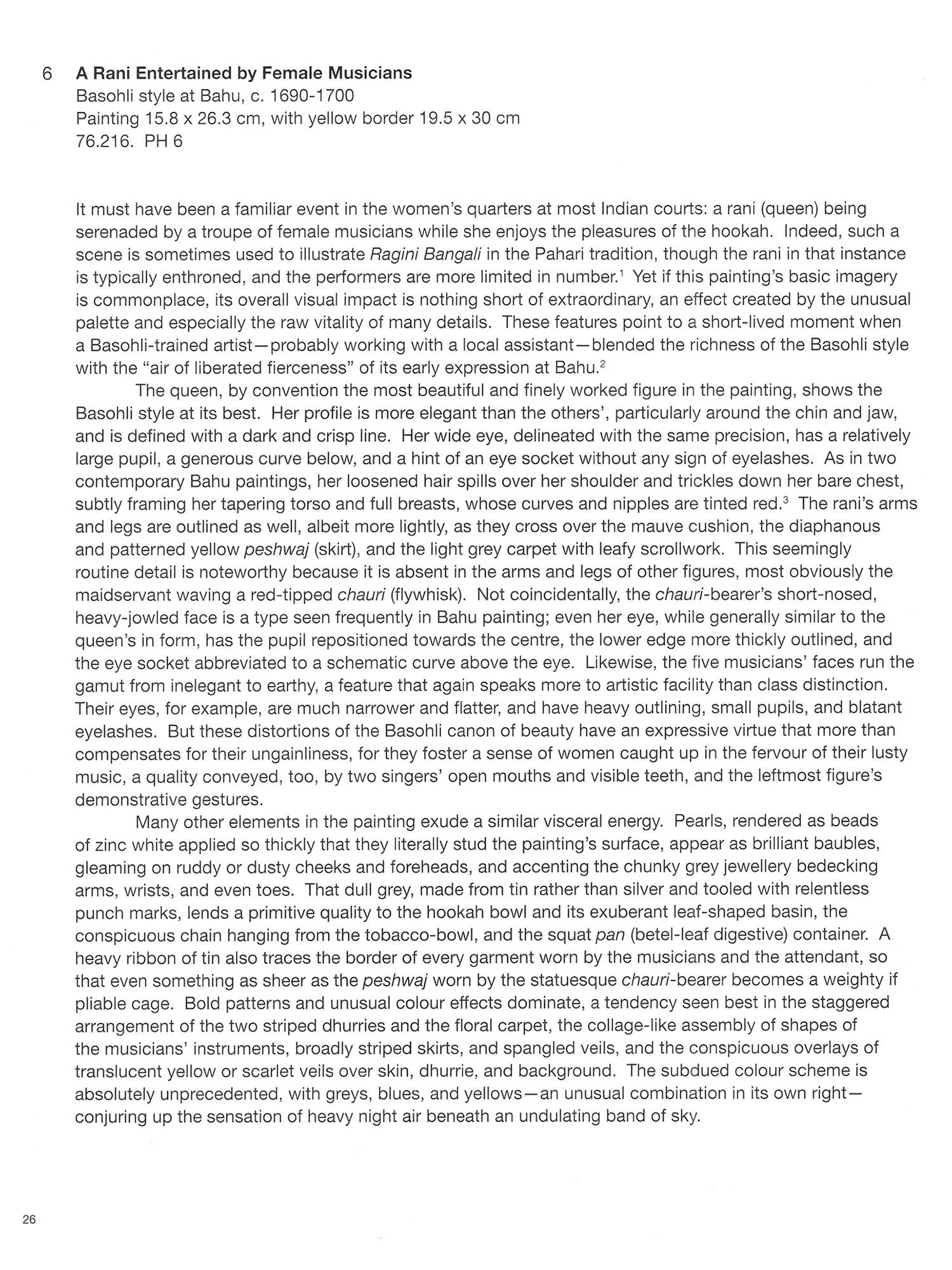 Pahari painting is the art of the mountainous regions of the Punjab Hills, a remote and geographically distinct area in northern India. The area, estimated to be about 500 kilometres long by 160 kilometres wide, encompasses most of the territory of the modern-day Indian states of Jammu and Kashmir, Himachal Pradesh, and Uttarakhand. The terrain consists of the foothills of the Himalayas and the lower-lying areas watered by "the five rivers" of the Punjab (from the Persian panj ab)-the Jhelum, Chenab, Ravi, Sutlej, and Beas-all tributaries of the Indus River. The widely used term Pahari is derived from the Hindi word pahar (mountain), so that Pahari literally means "from the mountains." The Punjab Hills were divided up into thirty-five states, a few geographically large, but most small, sometimes measuring as little as sixteen kilometres across (see cat. nos. 71 and 73). During the heyday of the Mughal empire in the first half of the 17th century, Emperors Akbar (r. 1556-1605). Jahangir (r. 1605-27), and Shahjahan (r. 1627-58) made some inroads into the region, conquering, for example, the forts at Kangra and Nurpur, and thereby affecting the political dynamics of the Punjab Hills. But most Pahari states were neither embroiled in a prolonged military confrontation with the Mughals nor fell under their direct administrative control. A few states-particularly the ones closest to the plains such as Nurpur, Mandi, and Kangra-did form tutelary alliances with the Mughals, and their Rajput rulers and princes were given military commissions and honours. These were normally hereditary positions, usually adhering to the principle of primogeniture. Younger members of the family were sometimes appointed to high offices such as the wazir (prime minister). The religious complexion of the region was somewhat different than that of the plains of northern India. The cults of Shiva and the Devi enjoyed greater dominance than elsewhere, often drawing strength from a rich tradition of folk beliefs. Vishnu was naturally an important focus of worship, especially in his ten forms known as the Dasavataras (ten avataras or "descents"). However, the cult of bhakti, which entailed ardent personal devotion to Krishna, the cowherd manifestation of Vishnu, became prevalent in the area only in the 17th century. And while Islam had no major religious following in the Punjab Hills, Sikhism, whose founder, Guru Nanak Dev (1469-1539), was born in the western part of this region, established a considerable religious and political presence there in the 18th and 19th centuries. Although some mural paintings are preserved in palaces and temples, most Pahari paintings were made on small sheets of paper, a format that has led them to be described commonly as miniatures. Many paintings were intended to be independent works of art, and required no particular physical context for their entire meaning to be accessible. Others were part of extensive painting series, a term used for a collection of illustrations prepared in accordance with a given text but kept sequentially and loosely between boards-a traditional Indian format-rather than bound physically into a bookbinding, a format employed consistently in the Islamic tradition. In most cases, some version of the text is written on the reverse, either in excerpt or in full. The language is most often Sanskrit, the classical Indian language, and the script is Devanagari (literally, "script of the gods"). which is used across most of north India. In some cases, local scripts such as takri and Sharda supplanted Devanagari. Takri in particular has many arcane local variants in the Punjab Hills, and command of it remains quite rare among scholars and collectors. Provenance, that is, where an individual painting or painting series was collected, is sometimes a clue to the source of the workshop or original patronage. This was especially true when royal collections were first being dispersed in the 1950s. Yet this information should be evaluated with caution, for such accounts are sometimes fabricated by dealers with an intent to deceive, and paintings and manuscripts were routinely sent from one court to another as part of dowries and other forms of ceremonial gifting. With the political upheaval in the early and mid 19th century, and the growing power of the Sikhs and British, this formalised system of mutual exchange came to an end. Each state had a distinctive style associated with it, sometimes lasting only a few decades, and other times more than century. At Mandi, for example, a short-lived Mughalised style flourished. the mid 17" century (cat (cat, no Icat nos. 23-27) and then all but vanished eventually being superseded by an entirely different and more enduring style associated with the long reign of Raia Sidh Sen fr. 1684-1727) primarily because individual painters occasionally moved from one territory to another, as is the case nos 29-331 There are however, many interconnections among the states during various periods in land revenue, an income supplemented with periodic gifts. Hence, artist families often had one or Some states were less wealthy, and could afford to employ only a few artists, who were normally paid from Guler to Chamba. Jasrota and Baschli, for example, in the late 18th century (cat nos. 21.76-79) in adiacent and sometimes even far-flung states. The amount and quality of painting were not directly two sons strike out in search of new patronage, a practice that accounts for related styles springing u an outsized related to the resources in the state coffers. The small state of Guter for example, plaved an role in formulating and disseminating a style throughout the Punjab Hills. Rather, if a patron took a keen interest in art and rewarded good work with appreciation and money, good painting could flourish and occurred in the tiny state of Jasrota, where the creative collaboration of patron and painter, Balwand even in states with modest territory and money. By