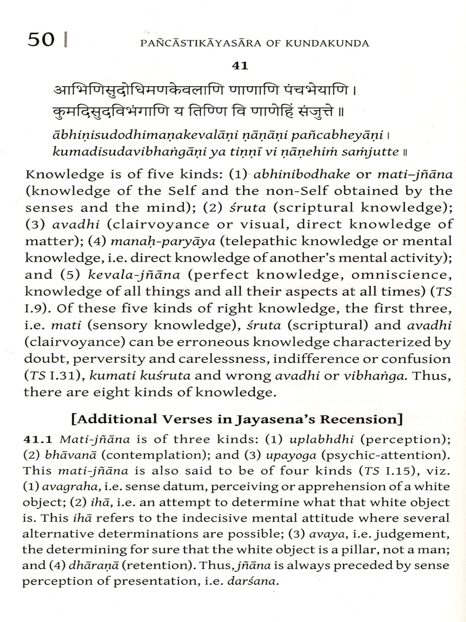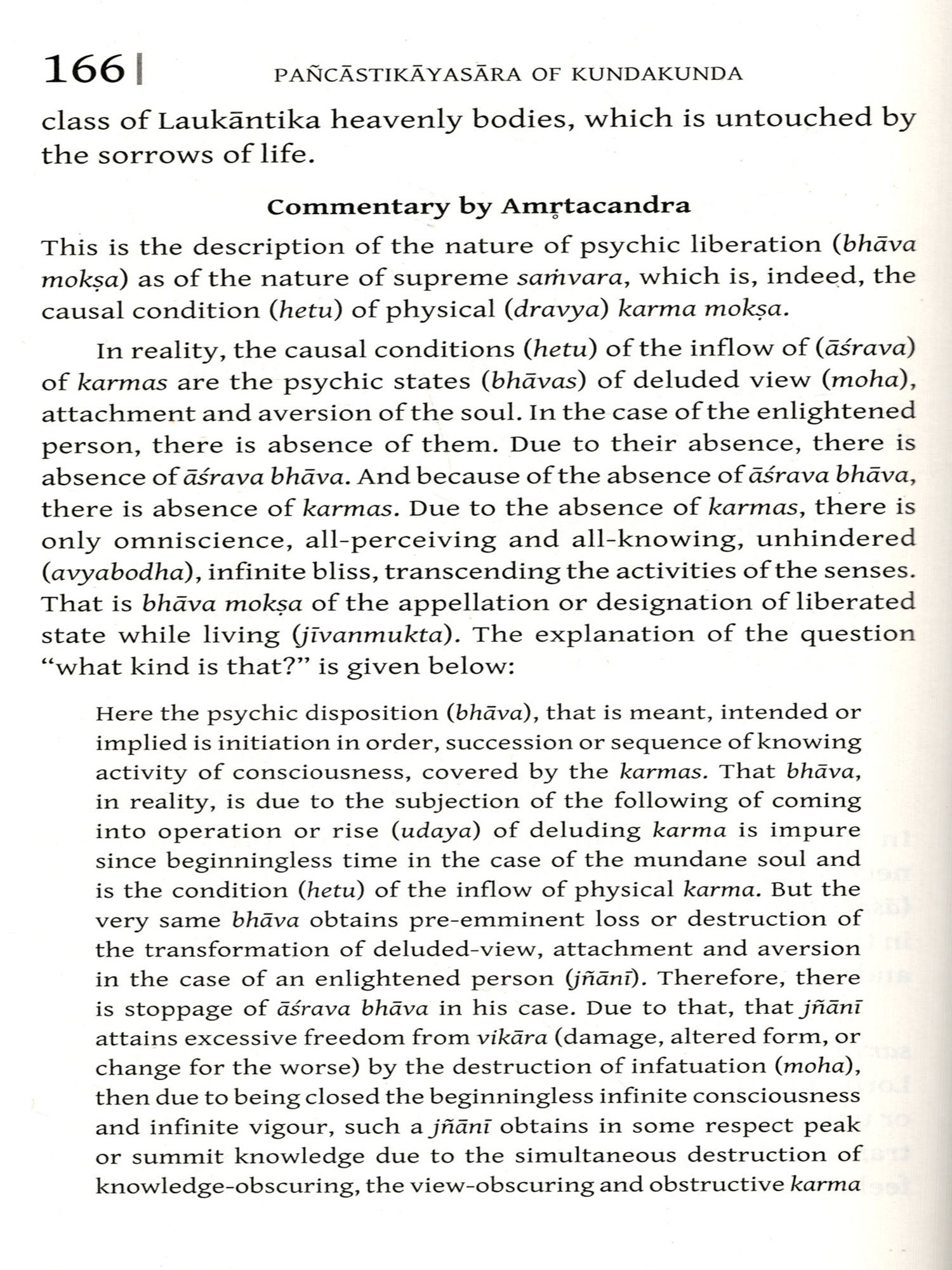 Like other works of Kundakunda, the Samayasara (SS) and Pravacanasara (PS), PKS too contains the Sanskrit commentaries of both Amṛtacandra and Jayasena. As with other works, Jayasena's recension of the Pancastikayasara also contains additional verses than those in Amṛtacandra's recension of the Pancastikayasara.