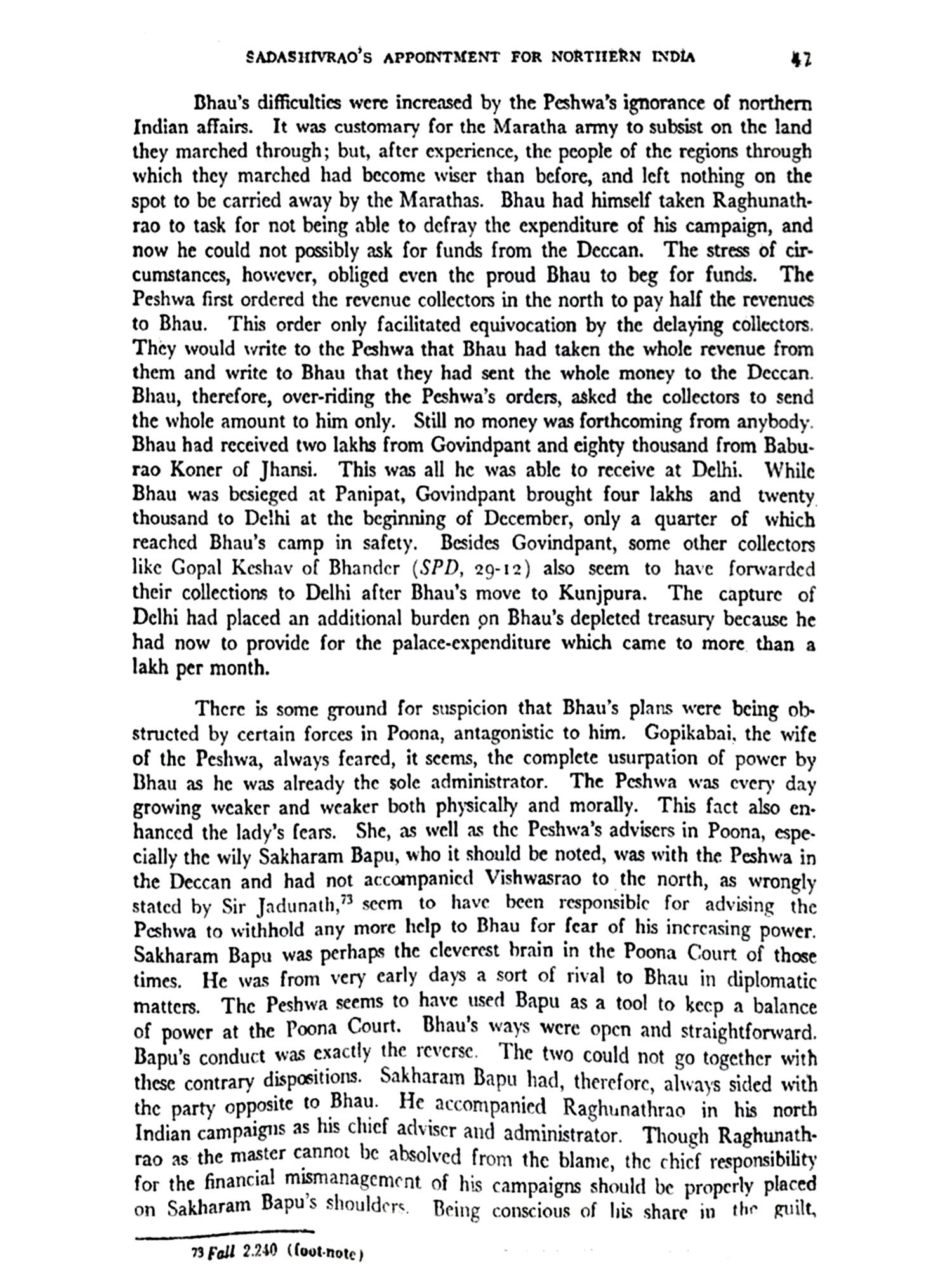 The battle of Panipat has naturally occupied a prominent place in the heart of the historically minded Marathas. Their interest in the affair was heightened by the genius of Vishvanath Kashinath RAJWADE, the founder of a school of historical research in Maharashtra. It has become a perennial theme for discussion ever since. RAJWADE was not noted for a sound judgment, however. His writings have provoked more polemical literature than any other man's in Marathi, and even Sir Jadunath SARKAR, writing in English, could not resist the temptation of having a fling at him.