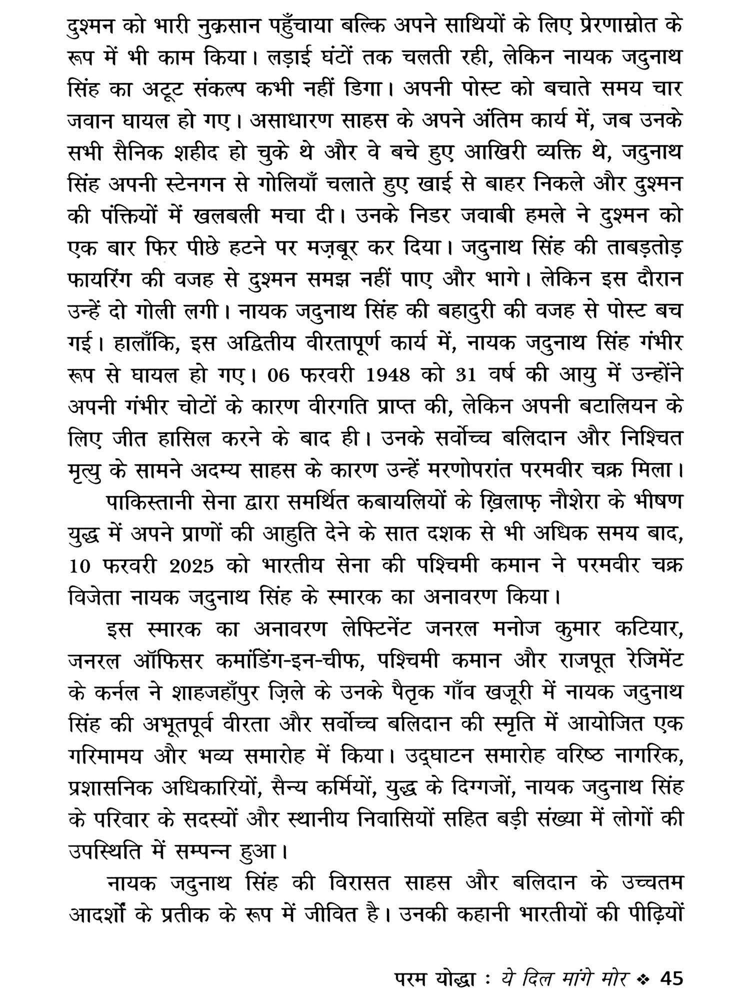 युद्ध में, वे एक ऐसी शांति का प्रदर्शन करते हैं जो लगभग अलौकिक हैं। गोलियाँ हवा को चीरती हैं, विस्फोट ज़मीन को चीर देते हैं, और फिर भी वे आगे बढ़ते रहते हैं। ज़ख्मों को नज़रअंदाज़ कर देते हैं, दर्द भुला देते हैं- मिशन ही एकमात्र वास्तविकता बन जाता है। आगे बढ़ने वाला हर कदम डर को चुनौती देता है। दिल की हर धड़कन आज़ादी के लिए एक ढोल की थाप है। और जब अंतिम क्षण आता है- जब जीवित रहना अब संभव नहीं होता- वे बिना किसी पछतावे के अपनी जान दे देते हैं। उनके अंतिम विचार अपने लिए नहीं, बल्कि झण्डे के लिए, उन साथियों के लिए होते हैं जो आगे बढ़ेंगे, और उन लोगों के लिए जो सैकड़ों मील दूर शांति से सो रहे हैं, कोई पहरा जो दे रहा है।