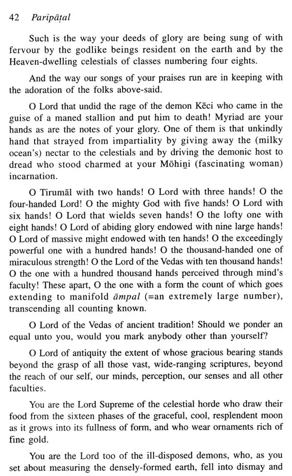 What is known as Ettuttokai (eight anthologies) consists of Narrinai, Kuruntokai. Ainkurunuru, Patirruppattu, Paripatal, Kalittokai, Akananuru and Purananūru, all of which include poems by diverse hands grouped on the basis of metre, content or length of the verse. Love is the exclusive theme of akam anthologies whereas puram refers to subjects such as war, fame, philanthropy and death. In this broad classification unique to ancient Tamil literature, akam may be taken to mean phenomenon and puram noumenon. Paripätal contains. twenty two poems by different poets, the length of each varying from 32 to 140 lines. The poems on Murugan and Tirumal are, according to A.K. Ramanujan, "the earliest bhakti poems in India, the earliest religious poems in a mother- tongue".
