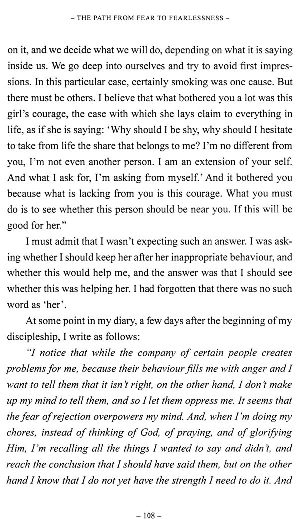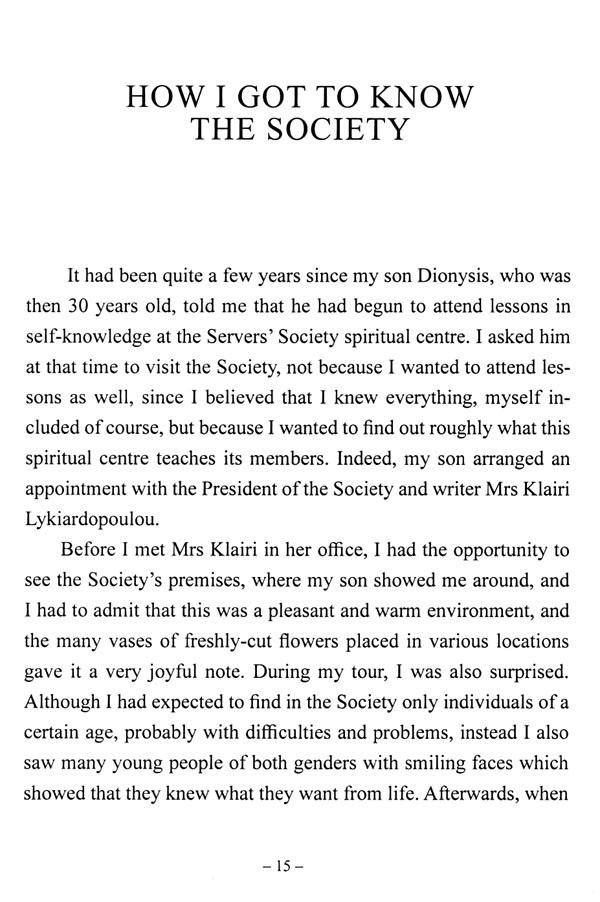 It was these words, and obtaining the valuable help of Mrs Klairi Lykiardopoulou, without whose guidance I would certainly not have managed to do anything, which played a decisive role in my making the decision to write this book. Because I realised that the Master was not asking me to write any literary work, but simply to describe the way in which my healing had progressed through my discipleship, and how I learnt to overcome my problems. He was asking me, that is, to explain how I learnt to cope with life.