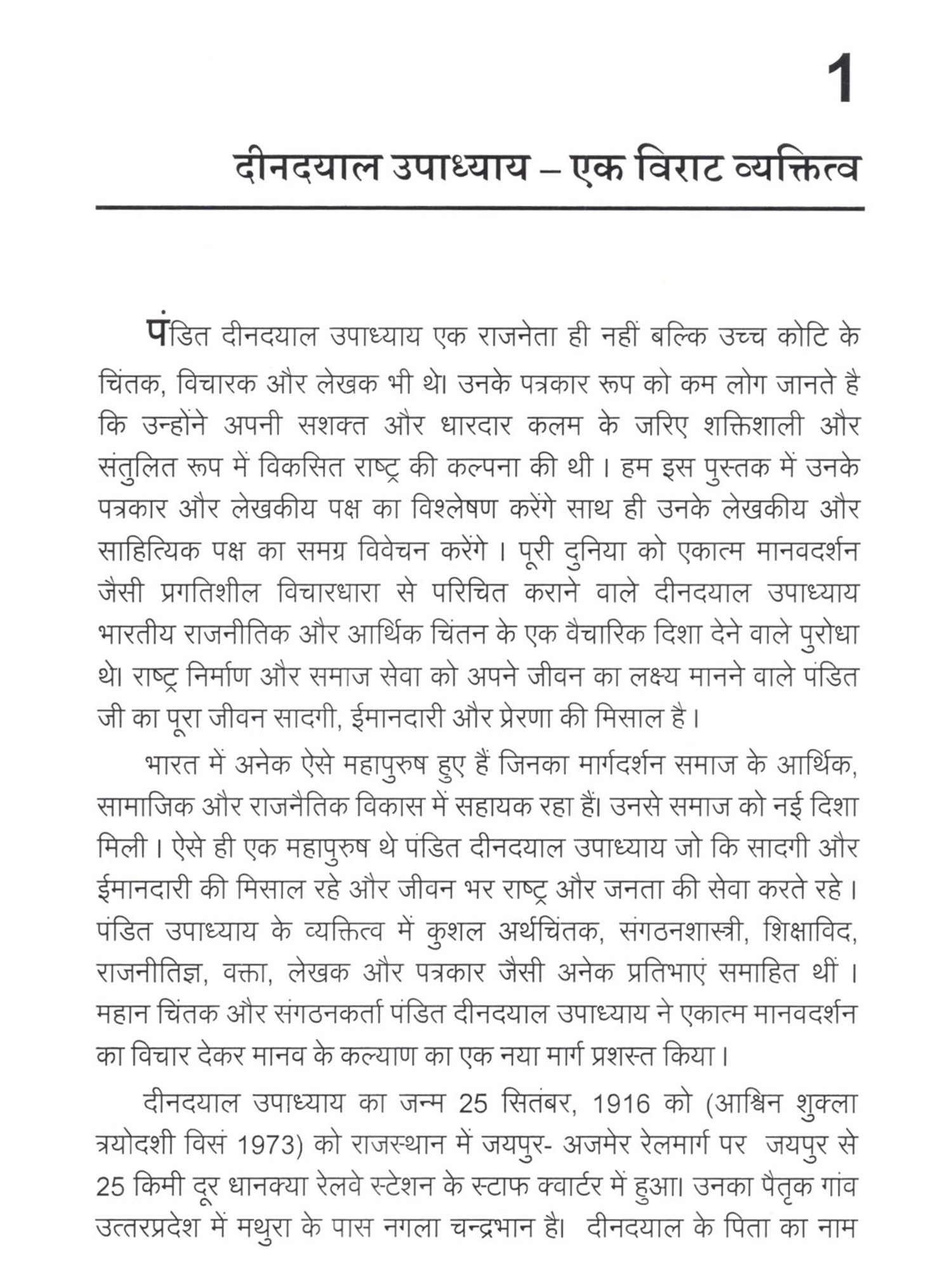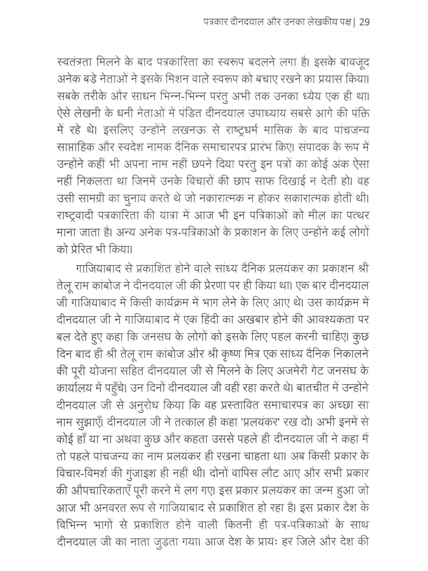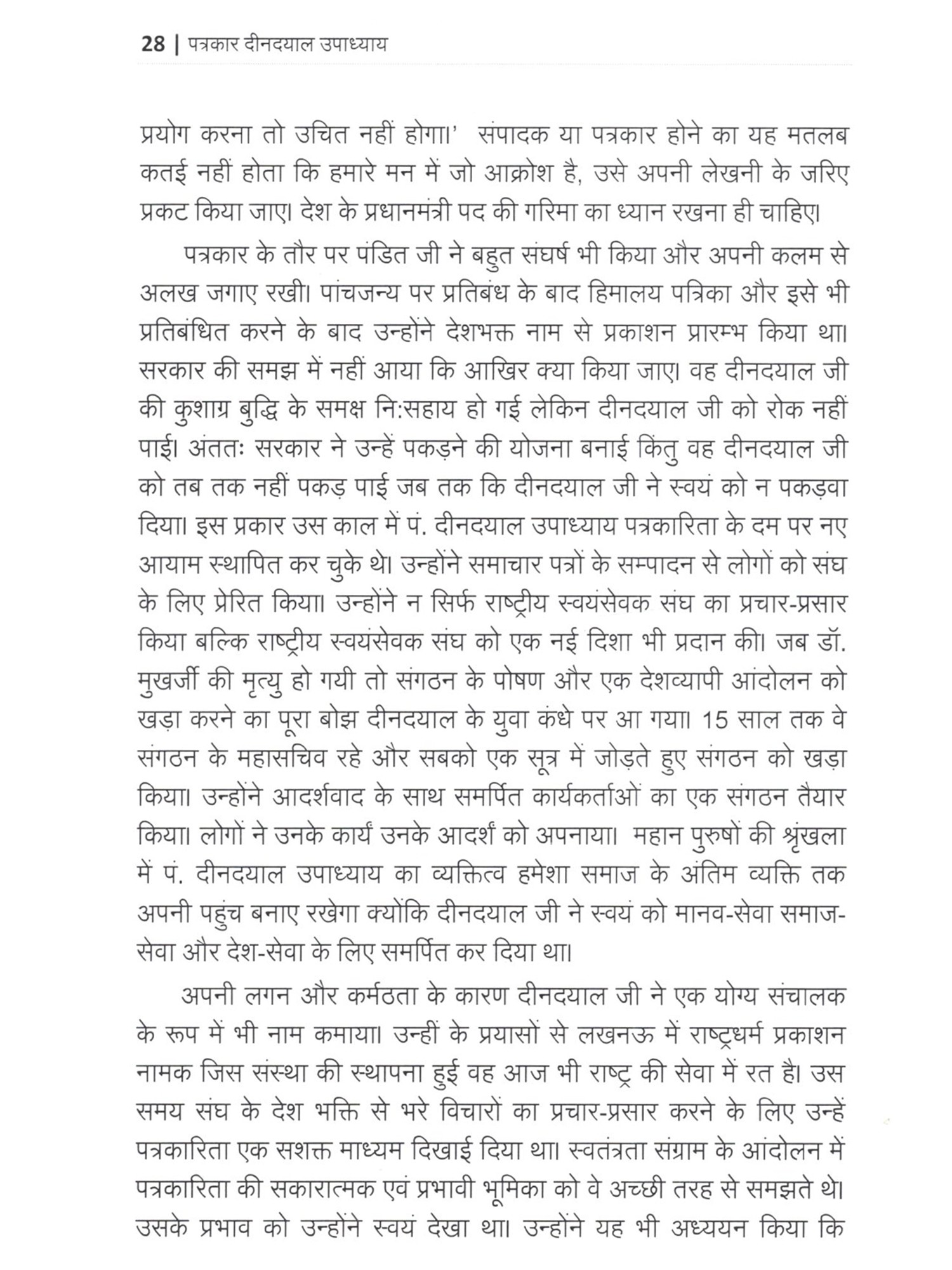 पोडत दीनदयाल उपाध्याय एक कालजयी व्यक्तित्व थे। आमतौर पर इतिहास में उनके राजनीतिक व्यक्तित्व को ही रेखांकित किया जाता रहा है और उनका पत्रकार पक्ष अछूता सा रहा है। वे जनसंघ के एक आधार स्तंभ रहे। उन्होंने संगठन और कार्यकर्ताओं को मजबूती से खड़ा करने में अपना सम्पूर्ण जीवन लगा दिया। उनके पत्रकार पक्ष के बारे में यूँ तो चर्चा हुई है, प्रकाशन भी हुए लेकिन उस परिमाण में नहीं हुई जितने जरूरी थे। उनका पत्रकार पक्ष बेहद संवेदनशील सशक्त और राष्ट्रप्रेम से ओतप्रोत है। इस पुस्तक में पंडित दीनदयाल उपाध्याय के पत्रकार पक्ष को रेखांकित करने को समग्र प्रयास किया गया है। एक पत्रकार के रूप में उन्होंने ना सिर्फ लेखक, संपादक, प्रकाशक का दायित्व निभाया बल्कि वे कपोजिटर, प्रिंटर और वितरक तक के दायित्व का निर्वहन भी कर लेते थे। इन सब कायों में उन्हें कभी कोई संकोच नहीं हुआ। वे प्रकाशन और मुद्रण से जुड़े सभी कार्यों मे सिद्धहस्त थे और समसामयिक विषयों पर विभिन्न प्रकाशनों के माध्यम से अपनी बेबाक टिप्पणियों के जरिए देश के समक्ष चिंतनपरक सामग्री उपलब्ध करवाते थे। उनके आलेखों ने पाठकों में राष्ट्र प्रेम और राष्ट्र समर्पण का भाव जगाया। भाई विजय विप्लवी जी ने करीब पांच वर्ष पूर्व पंडित जी की पत्रकारिता पर शोध करने और उसको पुस्तक का स्वरूप देने की मंशा जताई तो मेरा मन भी पंडित जी की पुस्तकों में रम गया। मैंने बचपन से शाखा जाते हुए और विभिन्न अभ्यास वर्गों में बौद्धिकों के जरिए पंडित दीनदयालजी के बारे में सुना समझा तो था लेकिन उनका पत्रकार रुप मुझ से भी अछूता ही रहा। भाई विप्लवी के साथ मैं भी उनके पत्रकार रूप को पढने और समझने में जुट गया। इस कार्य के लिए विप्लवी जी ने देश भर में दीनदयाल जी से जुड़े संस्थानों से पत्रकारिता सामग्री को एकत्र किया। दीनदयाल जी से जुडे, उनके साथ रहे विद्वतजनों के साक्षात्कार किए और प्रामाणिक जानकारी जुटाने का श्रमसाध्य कार्य किया। में भाई को इस महत्वपूर्ण कार्य के लिए साधुवाद देता हूँ। दीनदयाल उपाध्याय जी से सम्बद्ध समस्त जानकारियों, सदों, विचारों और आलेखों को इस पुस्तक में समेटने का प्रयास किया गया है। हालोंकि पंडितजी के पत्रकार स्वरूप को रेखांकित करने वाली यह कोई अंतिम पुस्तक नहीं होगी क्योंकि अभी भी उनके पत्रकारकर्म पर चर्चाएँ, शोध कार्य होना शेष है। लेकिन में यह विश्वास व्यक्त करता हूं कि इस पुस्तक से नई पीढी के पत्रकारों, शोधार्थियों को दीनदयालजी के कार्यों और विचारों को समझने में मदद, एक व्यापक फलक और दृष्टि मिलेगी।