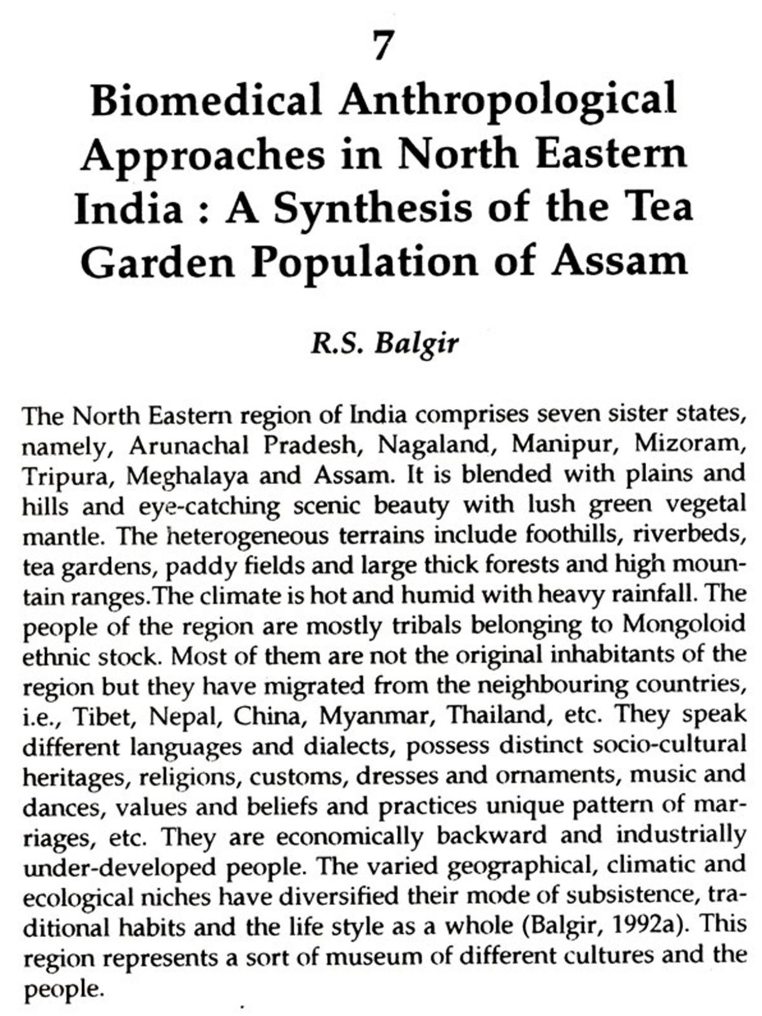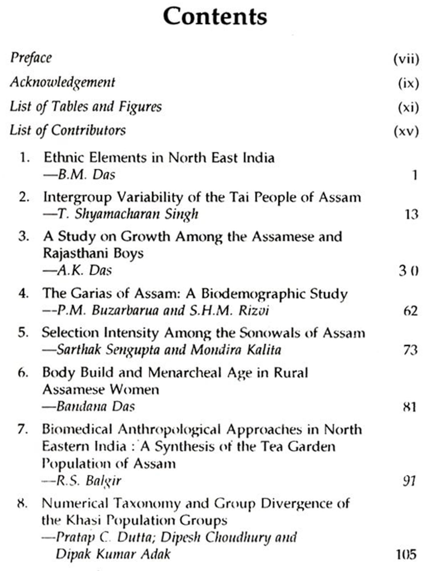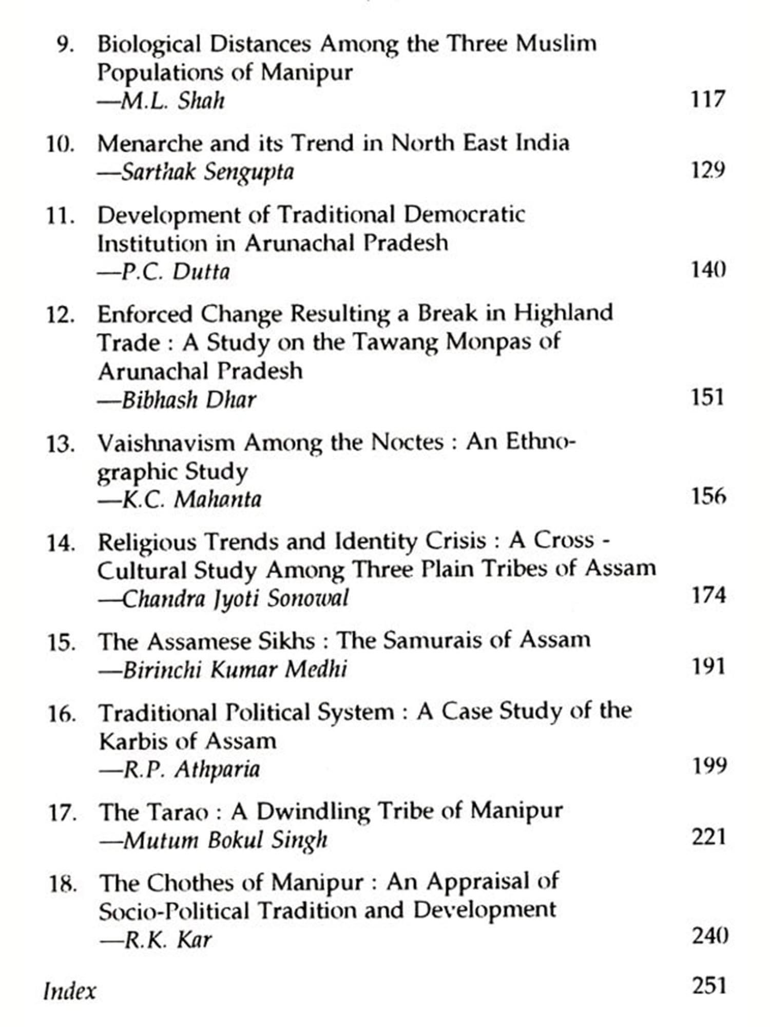 The volume contains a collection of eighteen articles pertaining to some important facets of anthropology like studies on ethnic elements, inter-group variability, human growth, bio-social and medical anthropological aspects, colourful cultural life, tribal institutions, process of Sanskritization, forms of political system, identity dynamics etc. among the vast and varied types of People of North East India. The volume specially covers the tribal inhabitants, muslim and tea-garden immigrants of the region. The volume, however, in no way can claim to have projected a thorough picture of the multifarious people of the region, but a good cross-section of man, society and culture of North East region is here reflected.