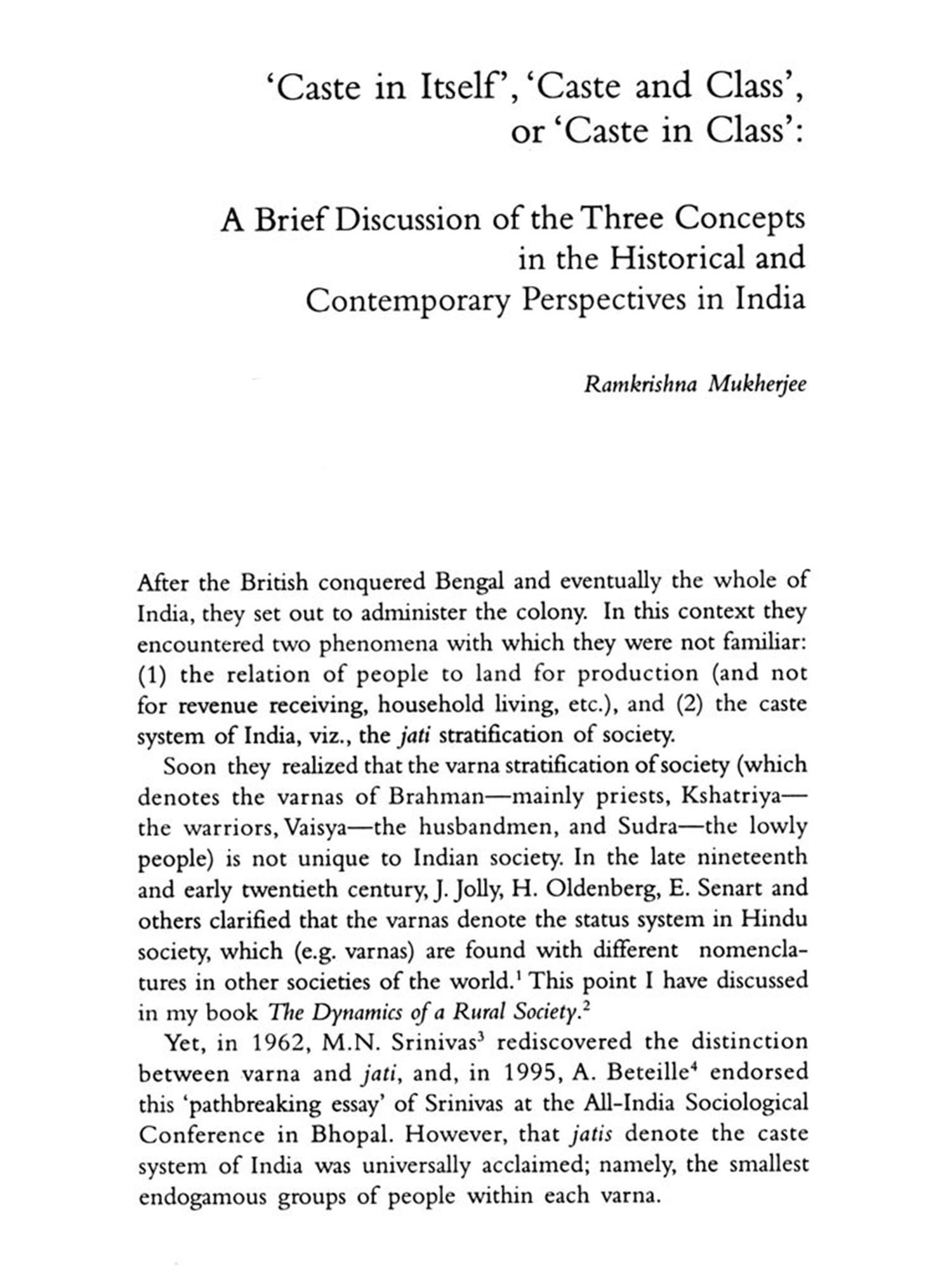 Ramkrishna Mukherjee draws the attention of social scientists to the issues of 'caste in itself', 'caste and class', and 'caste in class', and briefly discusses each in terms of its appropriateness in the historical context. He describes the emergence of the cultural interpretation of the caste system since colonial days. According to him, it was Max Weber who had denounced Marx's contention regarding the caste system as a system denoting the relations of production in ancient and medieval periods. After independence, Weberian notion gained ground and is, at present, the dominant perspective. But, the approach of 'caste in itself', that follows Weberian idea, does not appropriately depict the Indian reality. Class structure has cut across the caste heirarchy giving rise to 'new alliances and antagonisms'. Under the circum-stances, Mukherjee suggests that 'caste in class' appears to be the appropriate approach to understanding Indian social reality today.