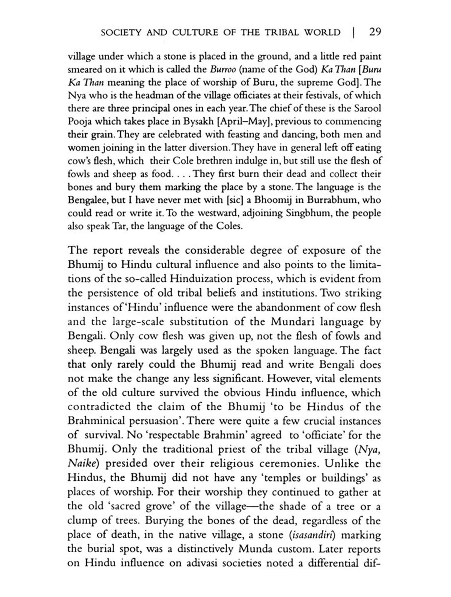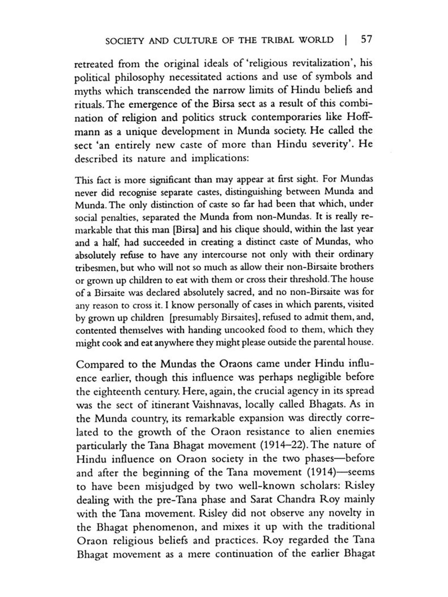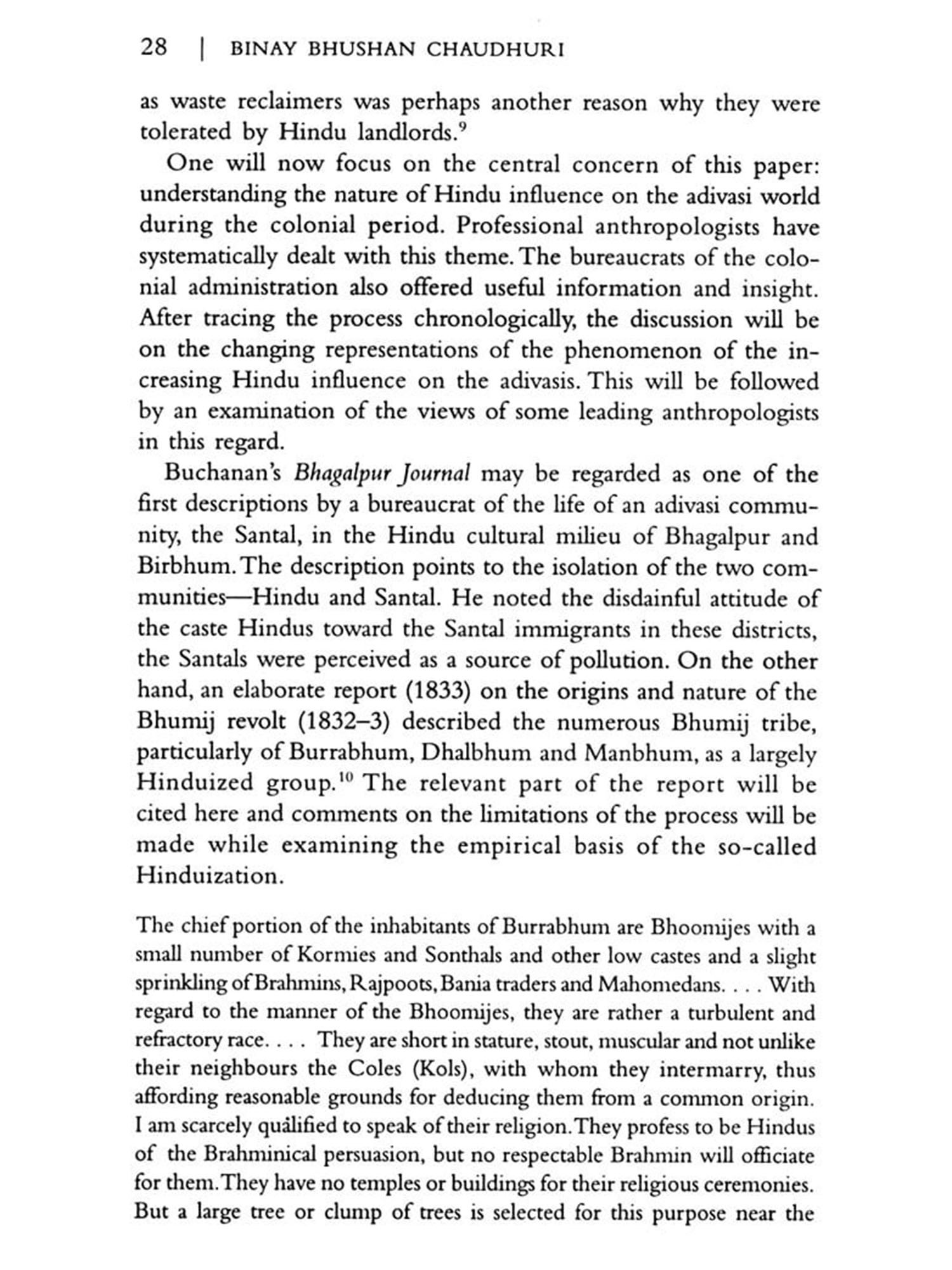 Binay Bhushan Chaudhuri elaborates on caste-tribe contact in the eastern part of India as observed by administrators of the colonial period and anthropologists such as Sarat Chandra Roy, Martin Orans, Nirmal Kumar Bose and Surajit Sinha. His focus is on the tribal communities of Bhumij, Santal, Munda, Oraon and Ho, which had linkages with their non-tribal neighbours, and, therefore, were not 'primitive isolates'. An exchange of cultural traits between them must have occurred under the circumstances. However, Chaudhuri's main objective in this context is to ex-amine the validity of 'Hinduization' of tribes.