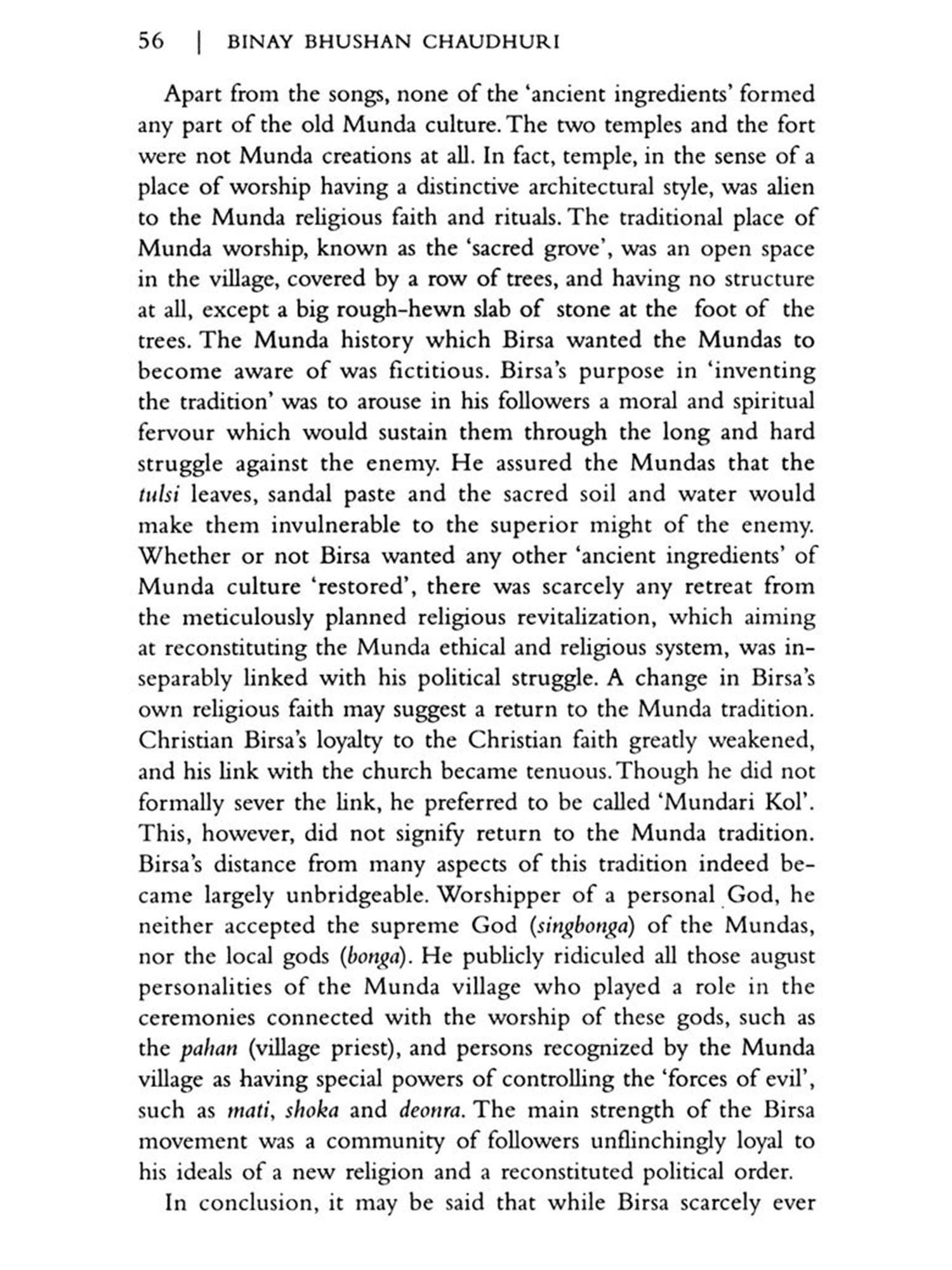 He analyses the works of H.H. Risley, W.W. Hunter and vari-ous official records of the British period regarding the socio-religious and political movements of tribal communities. He also closely examines the historical and anthropological studies of such movements. He contends that differential diffusion characterized the spread of Hindu influence among the tribes. Those who became known as 'Rajputs' were averse to the idea that their entire community should follow their example and become Rajputs like them. So, the bulk of the community remained separate from the Hindufold. This segmentary integration and assimilation, an important phenomenon of Indian history and anthropology, is intensively discussed by Chaudhuri. His analysis can facilitate in explaining the present day tribe versus dikku relation-ship within the tribal zone and the relationship between tribal and non-tribal leaders in the arena of state and national level politics.