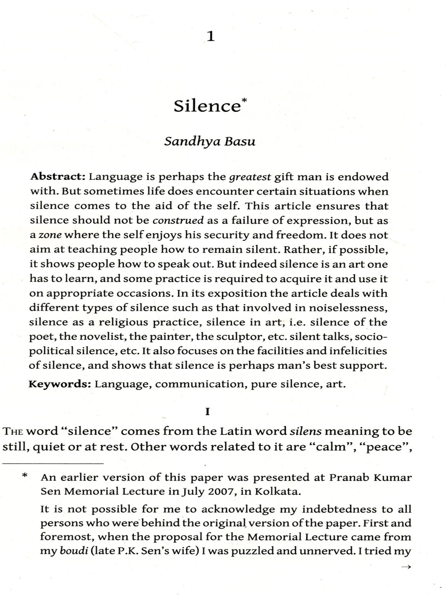Silence and language though seem to be at par with each other, in "Silence" by Sandhya Basu, they are shown as contemporaries of each other. The author does not aim at teaching people how to remain silent, rather, attempts to teach people how to speak out. Dealing with silence in art, religious practice and socio-political context, the author has shown how silence may signal assent or agreement, sometimes disagreement, and also either unite or dissociate people.