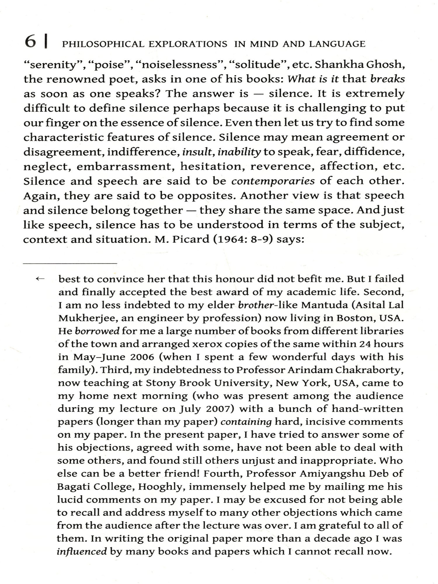 LANGUAGE as such and linguistic practices interest philosophers. Philosophers have been interested in language for very many reasons. Language, being a human phenomenon, interests the philosopher as the purpose of philosophy is to make sense of the world and our lives in it. Language occupied the centre stage of philosophy during the first-half of the last century. It is still a very important area for the philosophers. How is it that we manage to talk about things in the world? How is it that sounds become meaningful words and they concatenate to form sentences that convey our thoughts? How is it that our thoughts and our talks are related? How is it that our words manage to mean what they mean? Why at all do we need to mean what we mean through the use of languistic meaning? How do silences speak? How do words like "I" and "mine" illuminate us about who we are and how we see ourselves? How is it that language can capture images, and how does language in its turn become an image? How do we enjoy the aesthetic savour through language? How is it that complex aesthetic metaphors express our deepest aesthetic experiences? These are a few of the questions that intrigue philosophers. This anthology is an attempt at understanding language and its relation to the world and the mind. Philosophers around the world have thought over the nature of the relation between the word and the world.