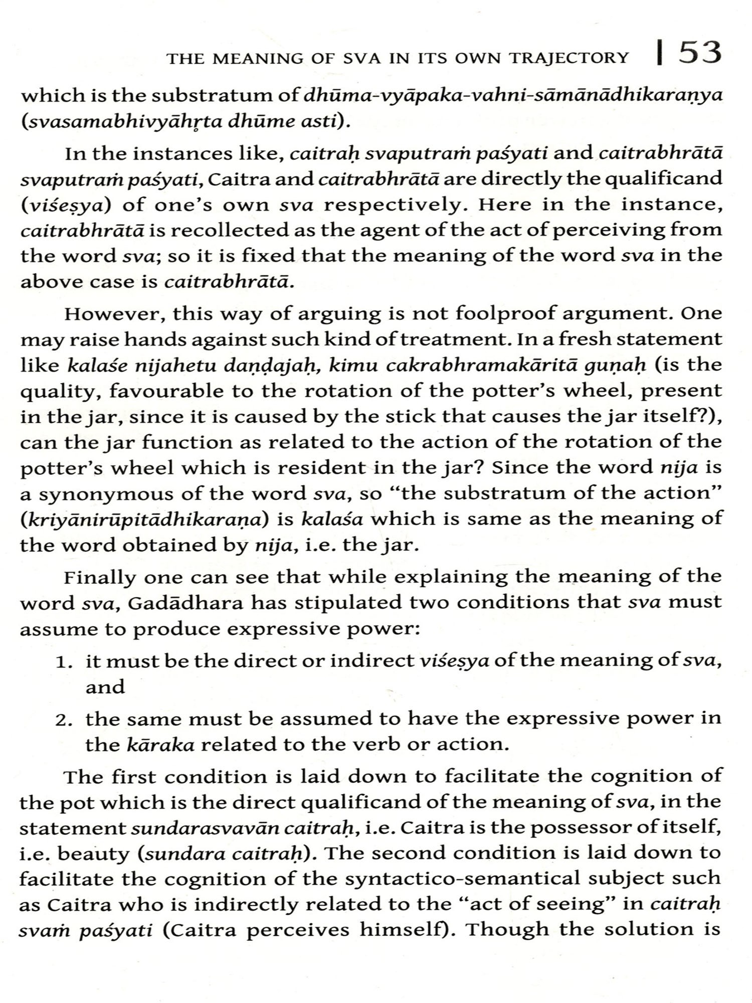 In our daily linguistic behaviour, we are familiar with the word sva in such usages as caitrah svaputram pasyati. But what actually is the meaning of sva - this has been examined by Madhu Kapoor in "The Meaning of Sva in Its Own Trajectory", by taking into account the narration of Gadādhara's Śaktivāda. The semantic explanation by the author is preceded by a brief exposition of the meaning of sva as used in our language in different ways, followed by its transcending reference to the word atman as found in the Brhadaranyaka Upanisad.