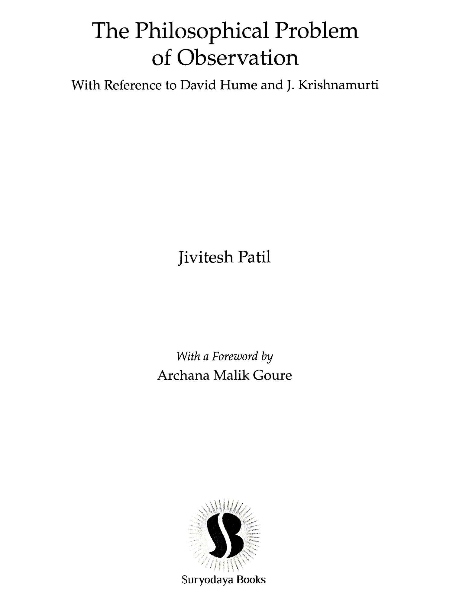 THIS volume, The Philosophical Problem of Observation with Reference to David Hume and J. Krishnamurti, is an important addition to the Indian and Western philosophical studies, providing two different philosophical perspectives on the problem of observation. Here in this volume, the author Jivitesh Patil has analysed the mental states of observation from different perspectives of David Hume, an eighteenth-century Scottish philosopher, and Jiddu Krishnamurti, a twentieth-century Indian philosopher and mystic. Both the philosophers have strong and distinct foundations for their theories of observation. Patil brings out the notions of observation/perception as well as their relation to other cognitive mental states like belief and knowledge, and non-cognitive states like feelings, attitudes and behaviour, which have equal value. Hume's account is largely empirical in nature and his enquiry into the psychological contents of the mind reveals the "underlying principles" of human nature. Krishnamurti's analysis is more philosophical and conceptual, revealing the conflicting and dualistic nature of mind, which affects our life in many a significant way. The underlying principle of human life is paradoxically uncovered in the relation between the observer and the observed. Patil brings forth an important question in his book: "Is there a possibility of observation without the observer?". Further, he raises a follow-up question: "What if the observer is the observed?".
