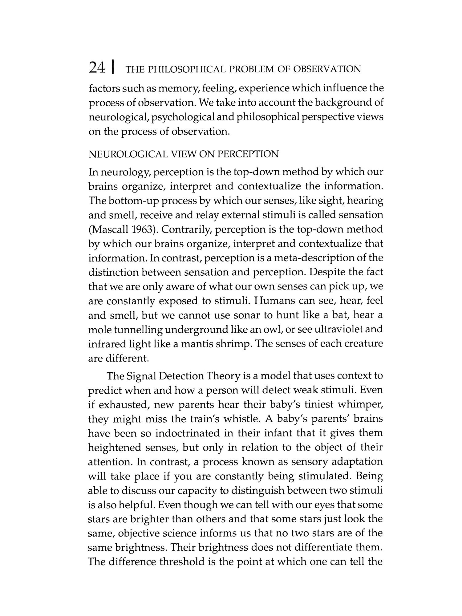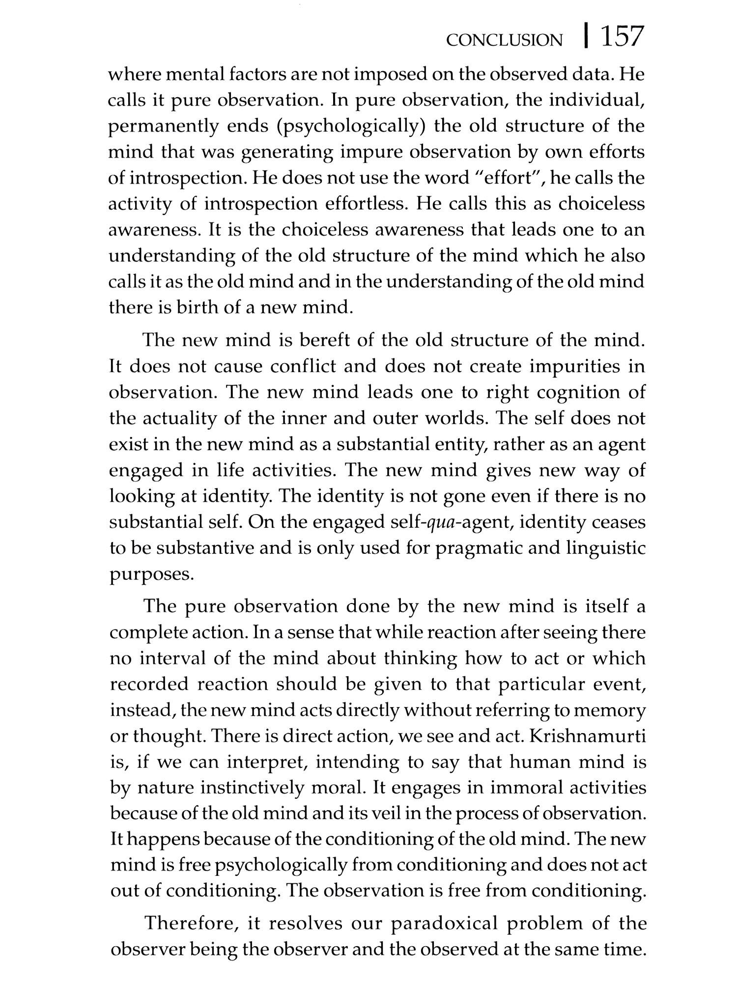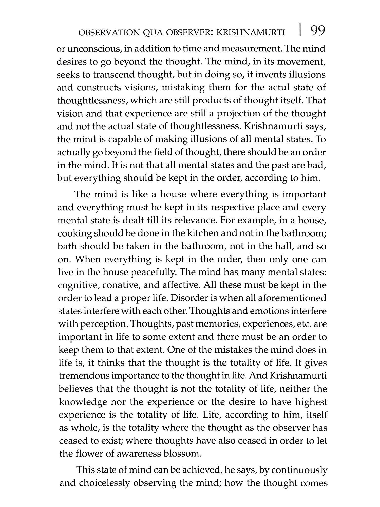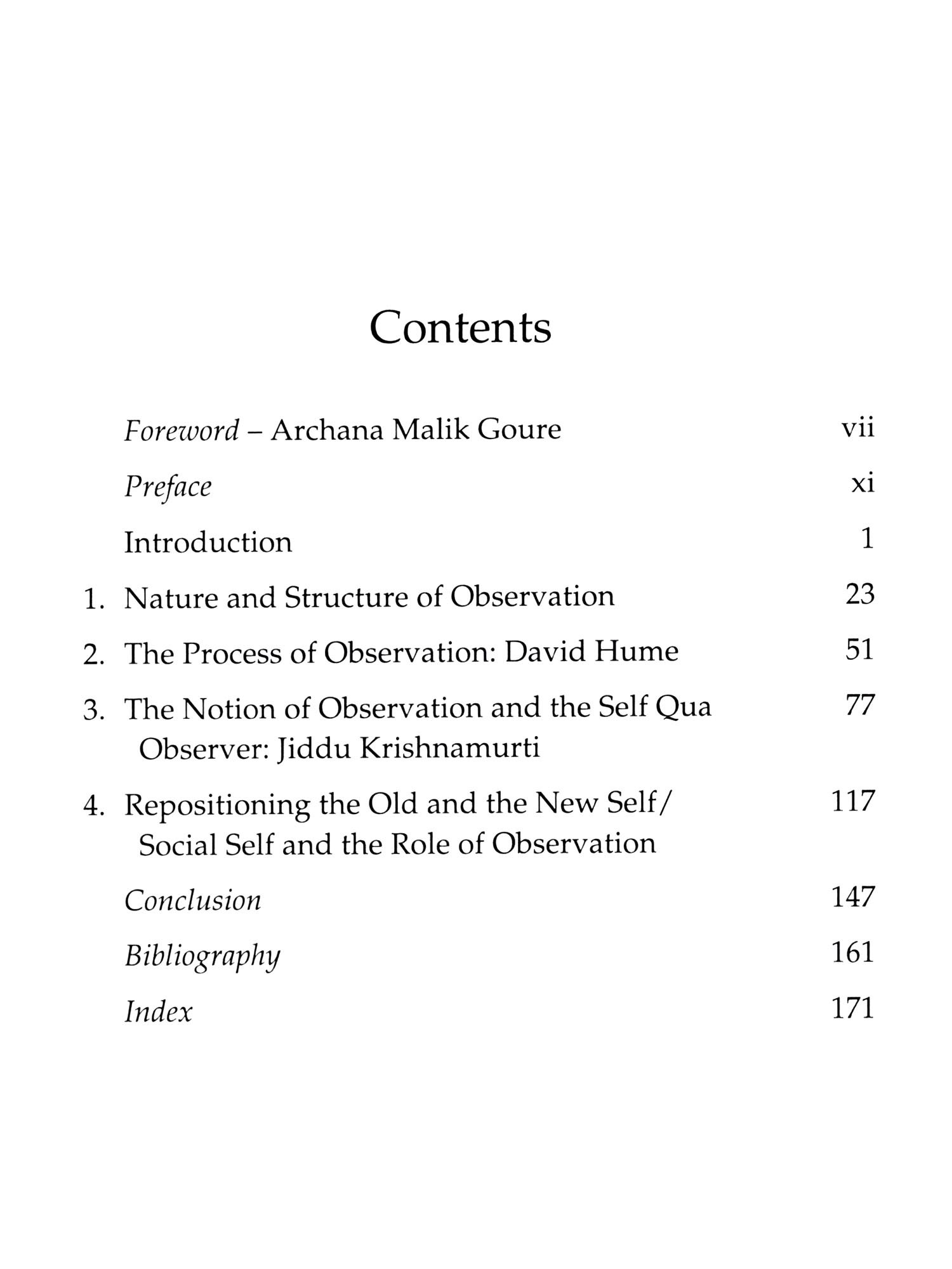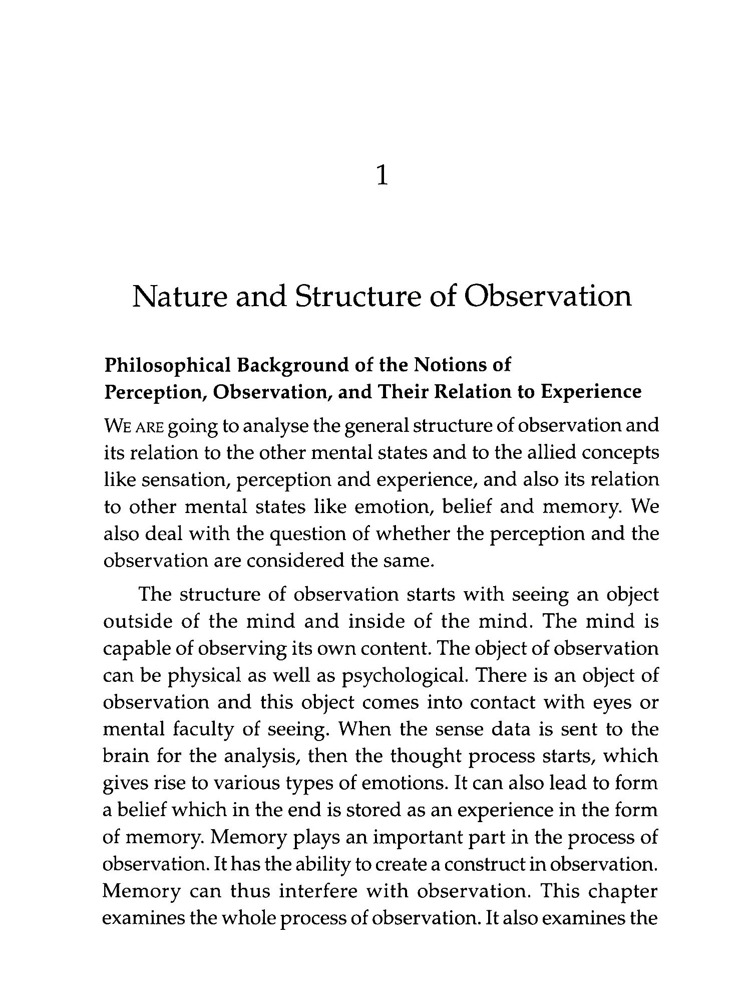 IN THE intricate tapestry of philosophical inquiry, the realm of philosophy of mind has persisted through the annals of time, captivating the intellects of thinkers from ancient civilizations to the contemporary era. What once stood as a unified discourse has now evolved into diverse disciplines such as psychology, neurology, cognitive science and artificial intelligence. Yet, beneath these subdivisions lies a fascinating continuity philosophical questions persist, transcending temporal and geographical boundaries. This study investigates into the philosophy of mind, specifically scrutinizing the role and position of the observer in the act of observation. Choosing two eminent philosophers, J. Krishnamurti from twentieth-century India and David Hume from eighteenth-century Scotland, separated by almost two centuries, offers a unique lens to explore contrasting arguments that surprisingly converge on certain conclusions. This book entitled The Philosophical Problem of Observation With Reference to David Hume and J. Krishnamurti intricately analyses the perspectives of Hume and Krishnamurti regarding the mental state of observation. Drawing extensively from primary sources, including Hume's seminal work like A Treatise of Human Nature (1978) and Krishnamurti's profound-insights from Commentaries on Living (1956), Freedom from the Known (1969) and The First and Last Freedom (2013), this work dissects the empirical and conceptual dimensions of observation.