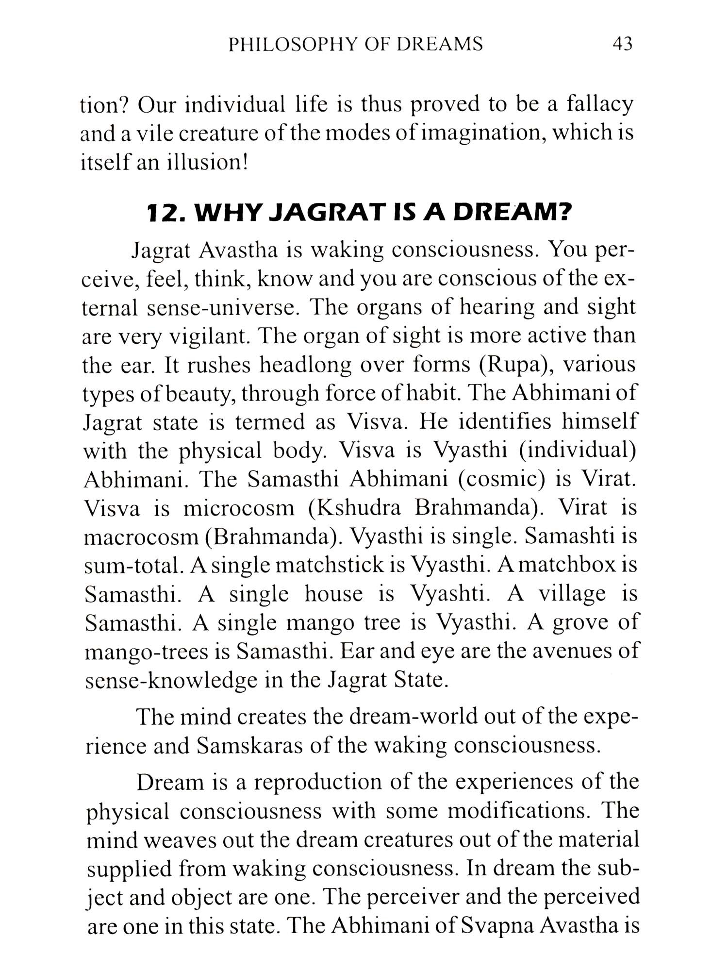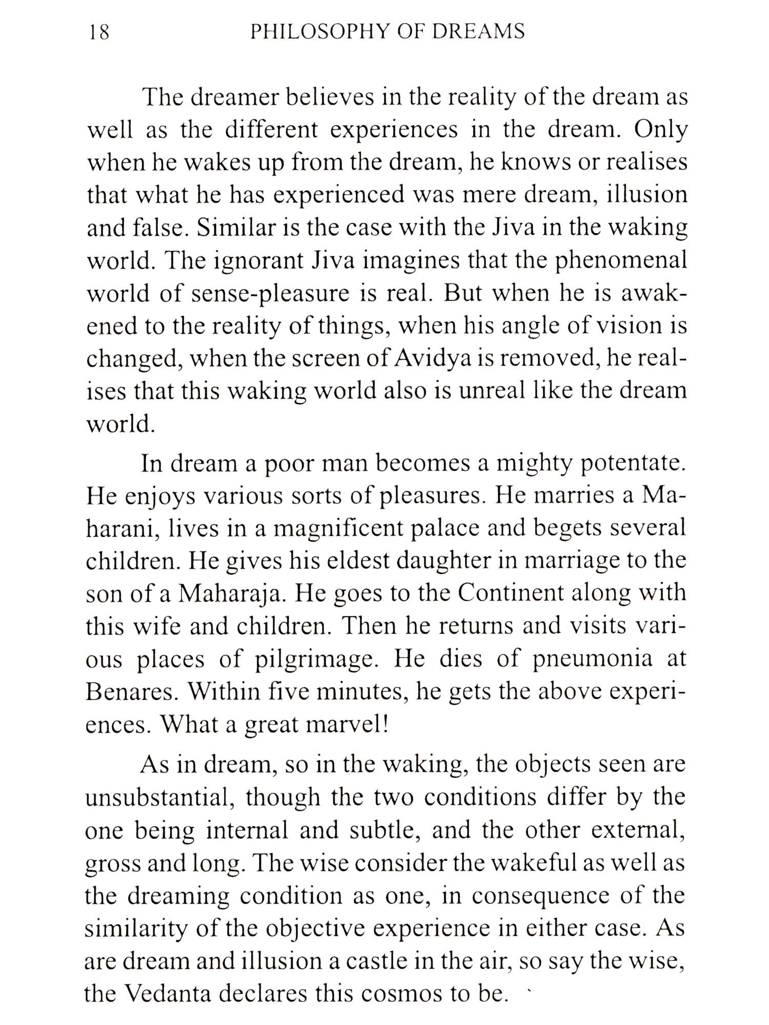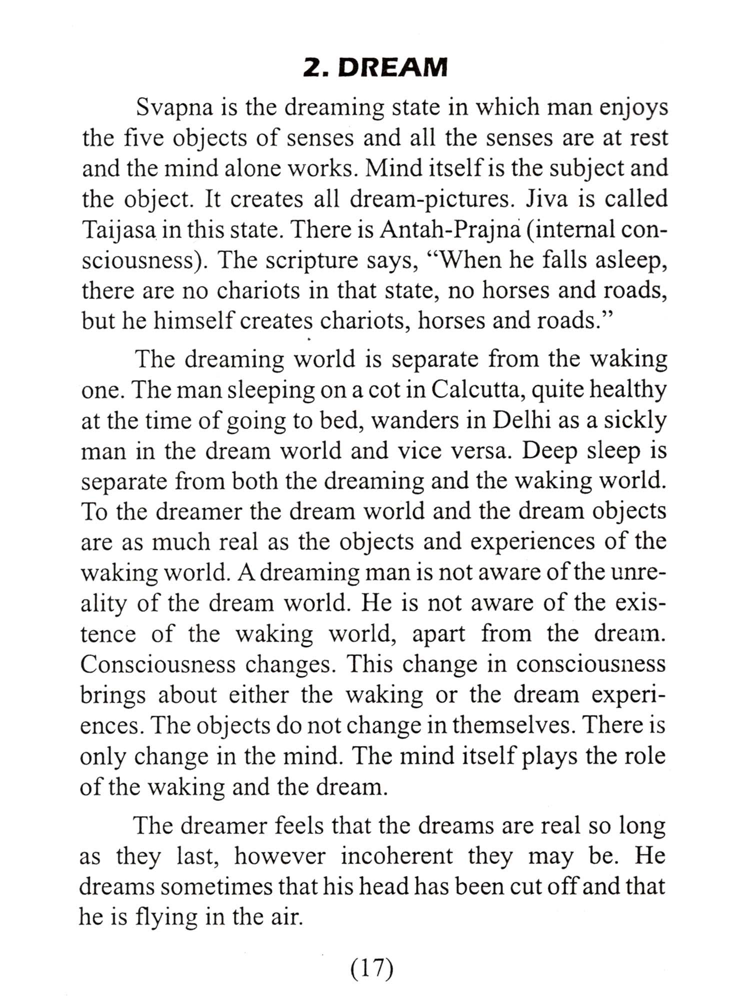 The analysis of dreams and their cause by psycho-analysts are defective. They maintain that the cause of dream creation lies in the suppressed desires of the dreamer. Can they create dreams as they like by sup-pressing desires? No, they cannot do that. They say that desires stimulate or help the dream creation. But they do not know what supplies the material out of which they are made and what turns the desires into actual expression, enabling the dreamer see his own suppressed de-sires materialised and appearing to him as real. The desires only supply the impulse. The mind creates the dream out of the materials supplied by the experiences of the waking state. The dream creatures spring up from the bed of Samskaras or impressions in the sub-conscious mind. Indigestion also causes dream. The Taijasa is the dreamer. It is the waking personality that creates the dream personality. The dream personality exists as the object of the waking personality and is real only as such. The waking and dreaming states do not exist independently side by side as real units. Why do we dream? Various answers have been given to this question. Dreams are nothing but a reflection of our waking experience in a new form.