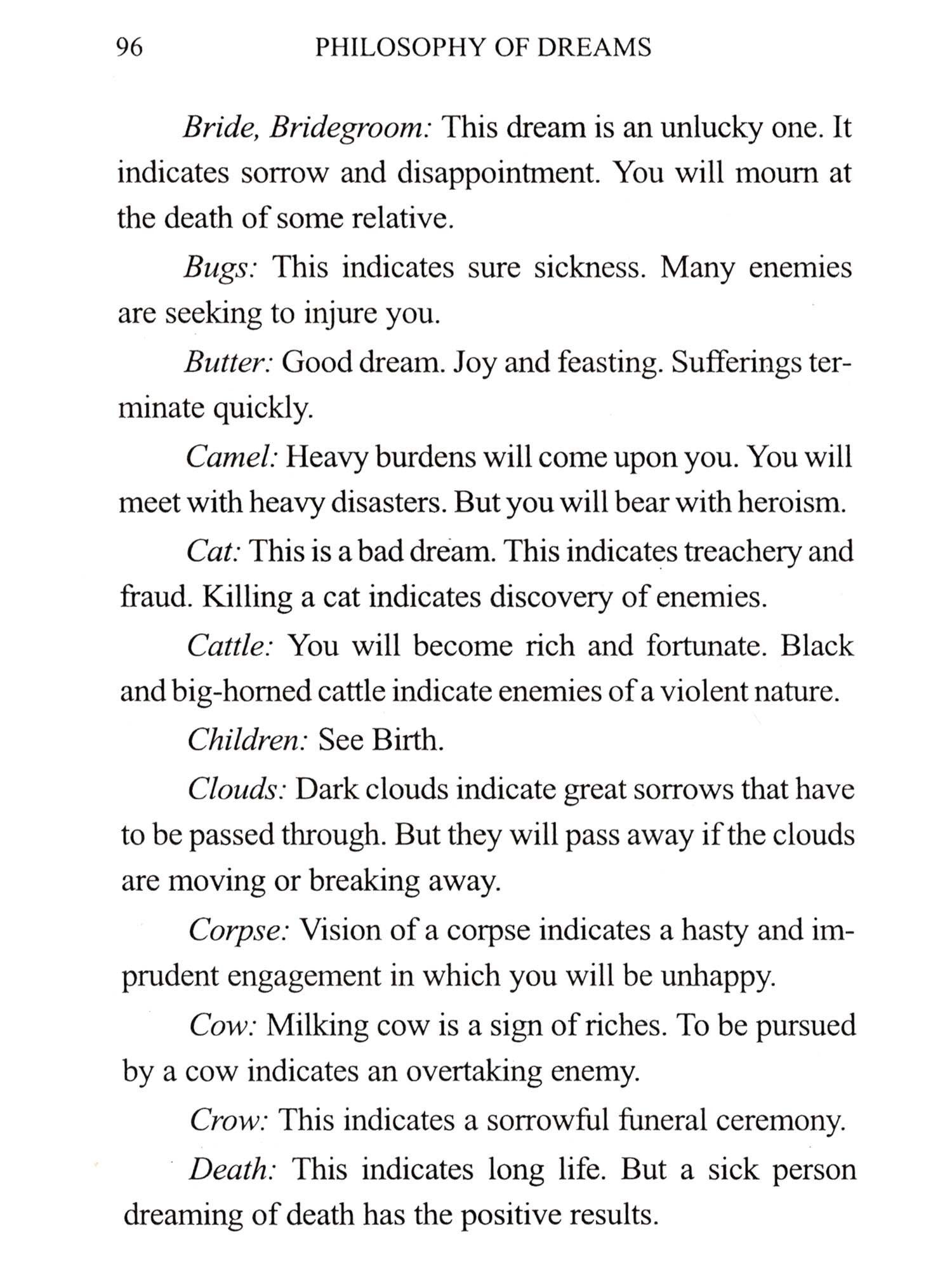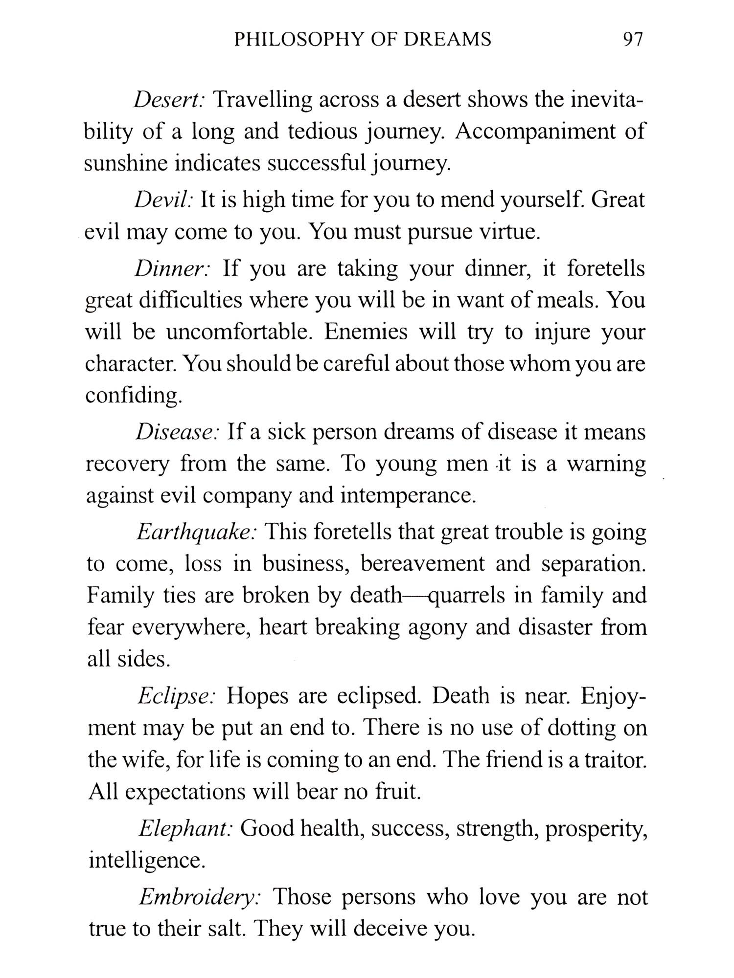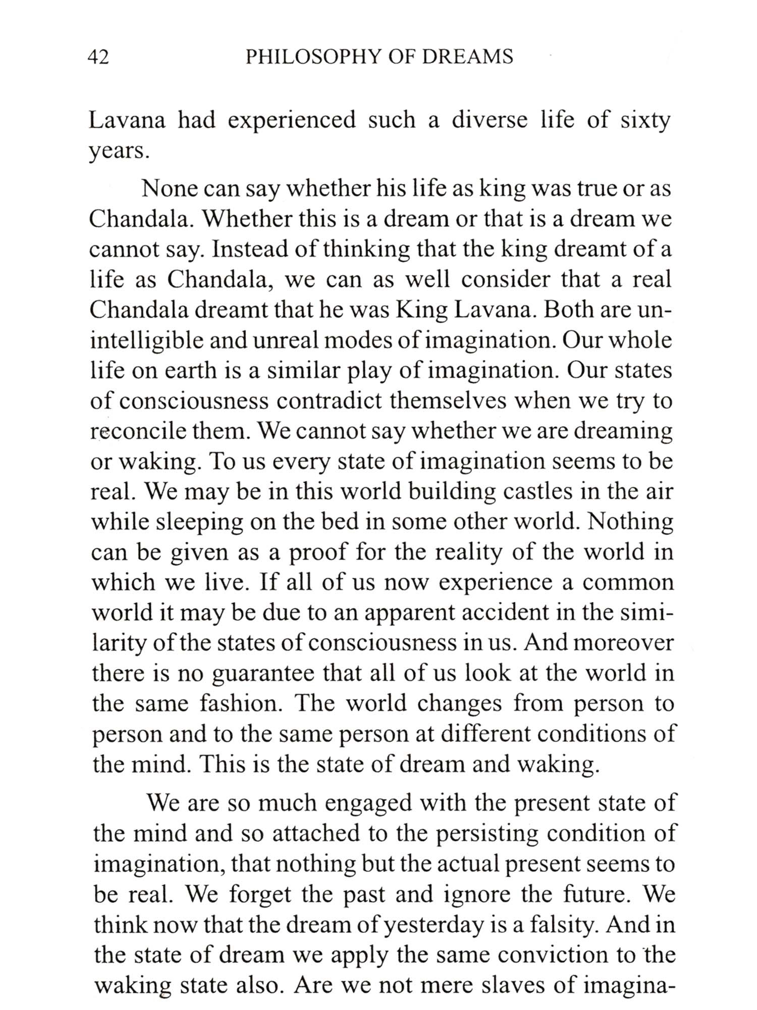 The analysis of dreams and their cause by psycho-analysts are defective. They maintain that the cause of dream creation lies in the suppressed desires of the dreamer. Can they create dreams as they like by sup-pressing desires? No, they cannot do that. They say that desires stimulate or help the dream creation. But they do not know what supplies the material out of which they are made and what turns the desires into actual expression, enabling the dreamer see his own suppressed de-sires materialised and appearing to him as real. The desires only supply the impulse. The mind creates the dream out of the materials supplied by the experiences of the waking state. The dream creatures spring up from the bed of Samskaras or impressions in the sub-conscious mind. Indigestion also causes dream. The Taijasa is the dreamer. It is the waking personality that creates the dream personality. The dream personality exists as the object of the waking personality and is real only as such. The waking and dreaming states do not exist independently side by side as real units. Why do we dream? Various answers have been given to this question. Dreams are nothing but a reflection of our waking experience in a new form.