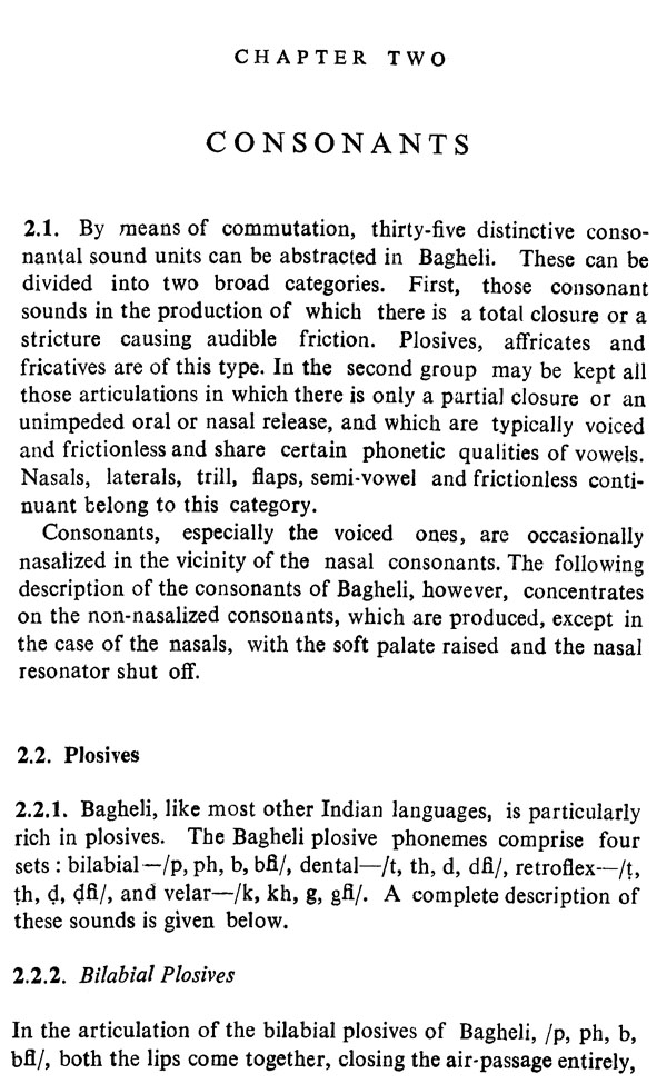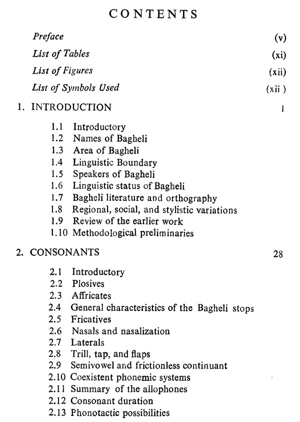 A detailed introduction to Bagheli, with special reference to its names, area, speakers, linguistic boundary and status, is presented in Chapter I, and a brief account is given of its regional, social and stylistic variations. At the end of the chapter, the earlier work done on Bagheli is briefly reviewed, and the methodological procedure adopted for the present study is out-lined. Chapter II discusses the consonants of Bagheli along with the phonotactic possibilities of the dialect. In Chapter III, the pure vowels, diphthongs, nasalized vowels and the 'coloured' allophones of the vowels are analysed. The last chapter, i.e. Chapter IV, considers (for the first time) the intonation of Bagheli in a systematic way.