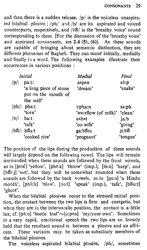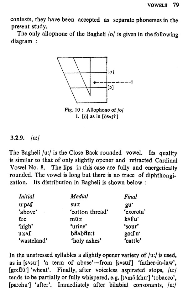 Dr. R.S. Pathak's book The Phonetics of Bagheli makes a fascinating reading. It presents a detailed phonetic and phonological analysis of a dialect of Eastern Hindi. The marvel of this book lies in the extremely delicate shades of innumerable phonetic elements as correlates, revealing a mas-terly penetration, termed as siitymeloikti in classical Sanskrit and barikabini in Urdu, which is evinced in the Phonotactics of Bagheli (p. 63), for example. The brilliant insight has been particularly actualized by the Nasalization Table (pp. 49-50). Certain other interesting discussions in the books are those on the systematic variations in Bagheli and Awadhi, the use of the `y' and 'w' on-glides in Bagheli, and so on. The chapter on the intonation of Bagheli is by far the most exhaustive and objective.