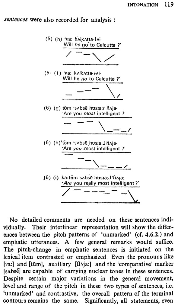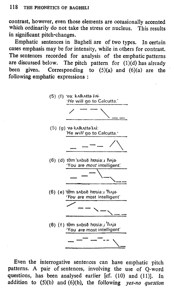 The entire treatment of the intonation contours of Bagheli is based on extraction with a pitch meter. In the present study, the analysis has been buttressed by theoretical discussions where desirable. The general approach has been allophonic with a view to throwing light on certain hitherto unnoticed phonetic features of the dialect. During the course of the present work, I have been helped and encouraged by various persons, to whom I am deeply grateful. In particular, I would like to express my gratitude to Mr. R.A.W. Bladon and Professor A.E. Sharp, both of the Department of Linguistics, University College of North Wales, Bangor (UK), for their guidance and encouragement. I am deeply indebted to Dr. R.K. Bansal, Professor and Head of the Department of Phonetics & Spoken English, Central Institute of English & Foreign Languages, Hyderabad, and Dr. Bh. Krishnamurti, Professor and Head of the Department of Linguistics, Osmania University, Hyderabad, for making certain valuable suggestions for improvement of the present work. For all its shortcomings, however, I alone am responsible.