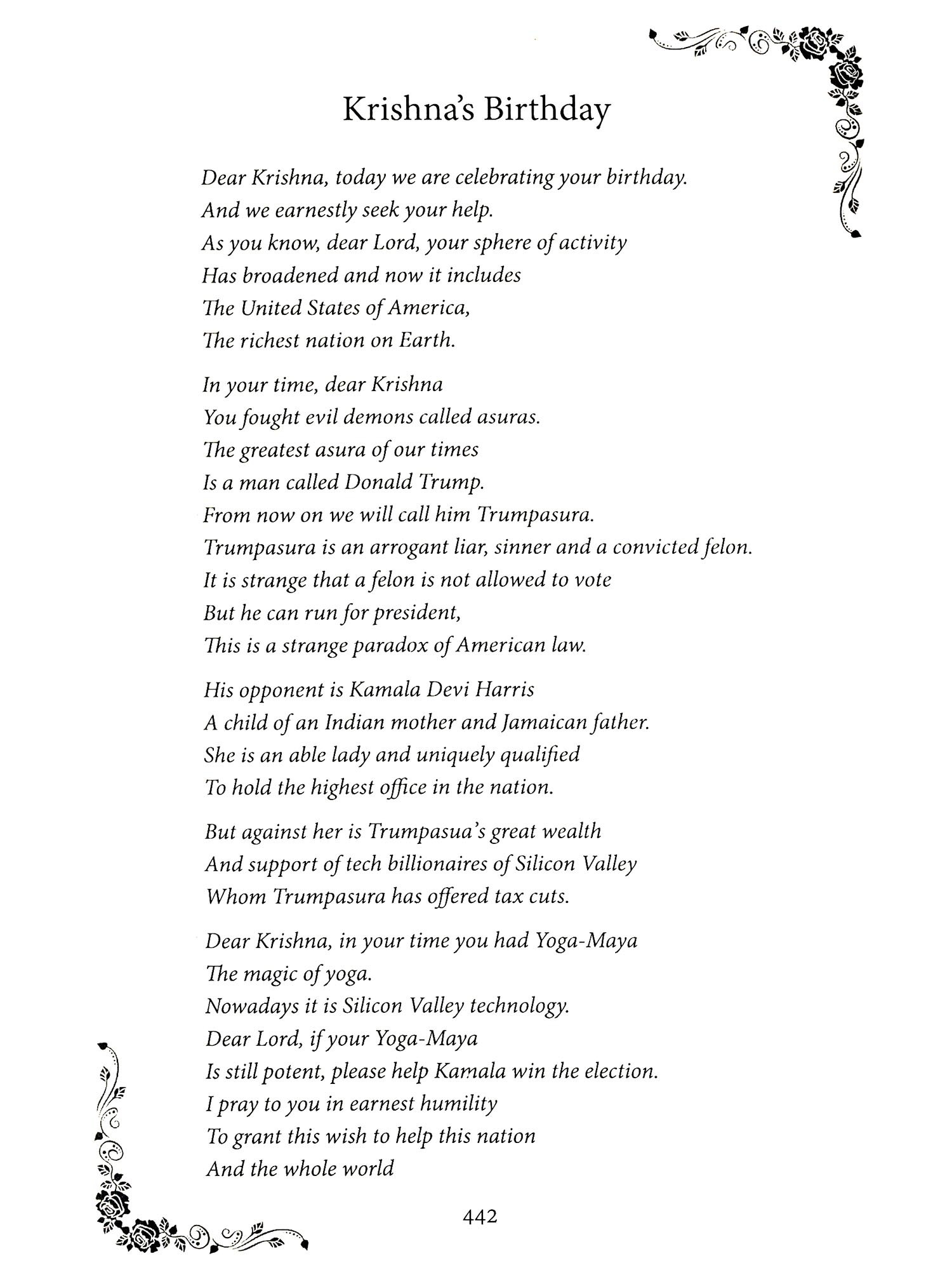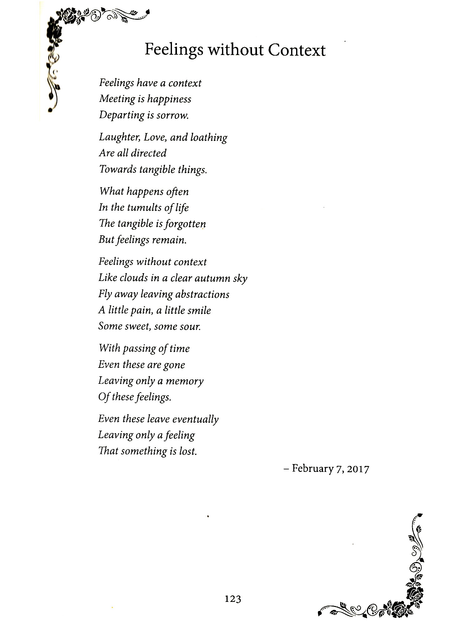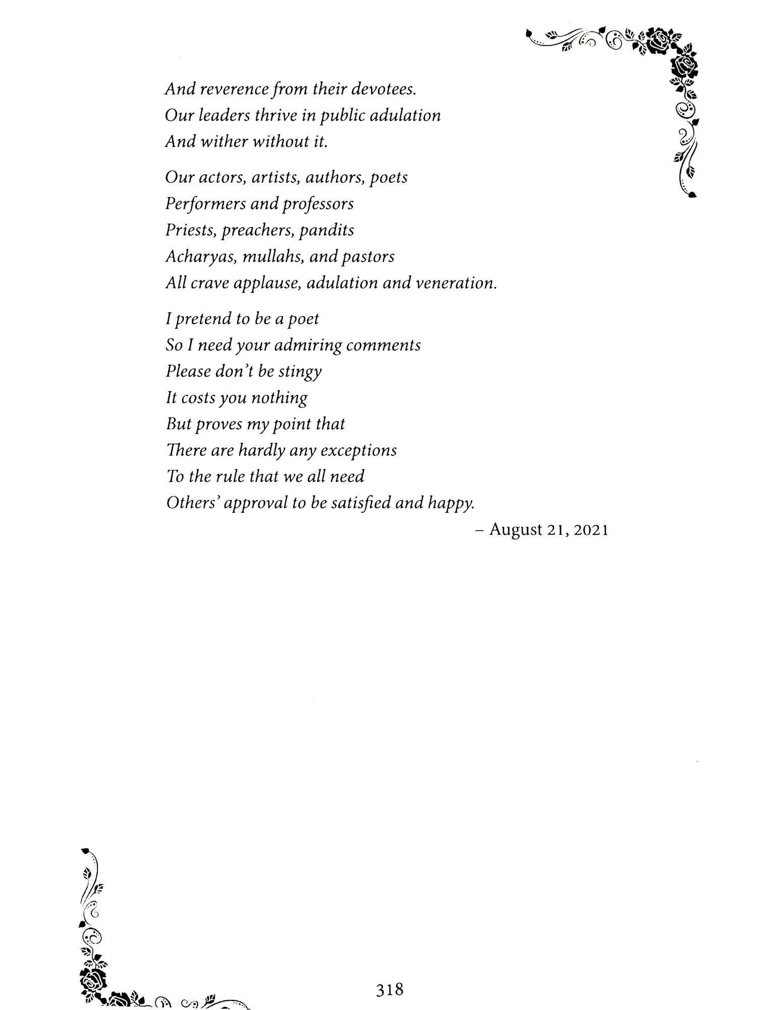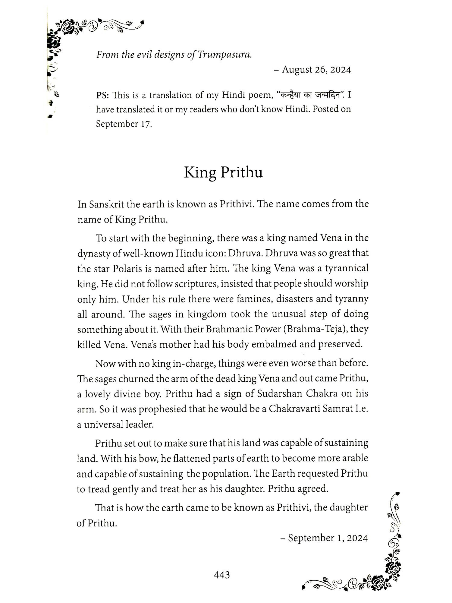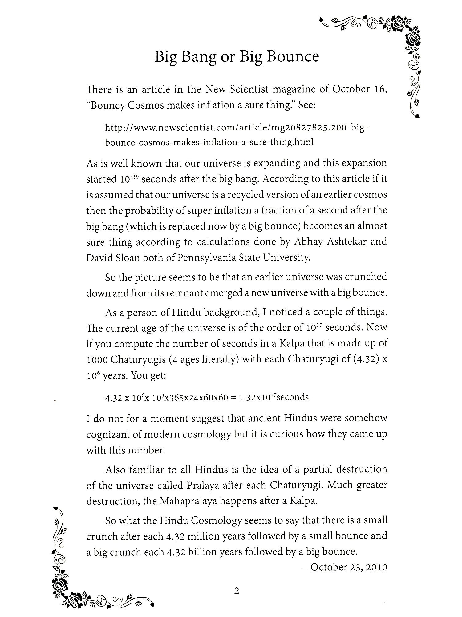 SEVERAL years after I had started my Hindi blog, I realized that I wanted to share my ideas with a wider audience. I wanted to reach my non-Hindi speaking friends both Indian and American. I started my English blog: laxmisponderings.blogspot.com. The first post was published on May 1, 2011 and is about the Hindu View of Creation. It included the way Hindus consider time, tremendously different from the Judeo-Christian view that God created the world around 6000 years ago. In the Hindu view, the creation is ongoing and the present cycle started some 14 billion years ago. I actually wrote my first English poem in the year 2000 to celebrate my wife's birthday. It is written in the style of Dr. Seuss, a childrens' writer. Next poem I wrote was to celebrate my retirement in 2009. Once the trend started, it continued and continues to this day. The blog came several years after I started writing poems in English. So the proper title of this collection should be: Poems and Ponderings. This is the title you are holding in your hands.