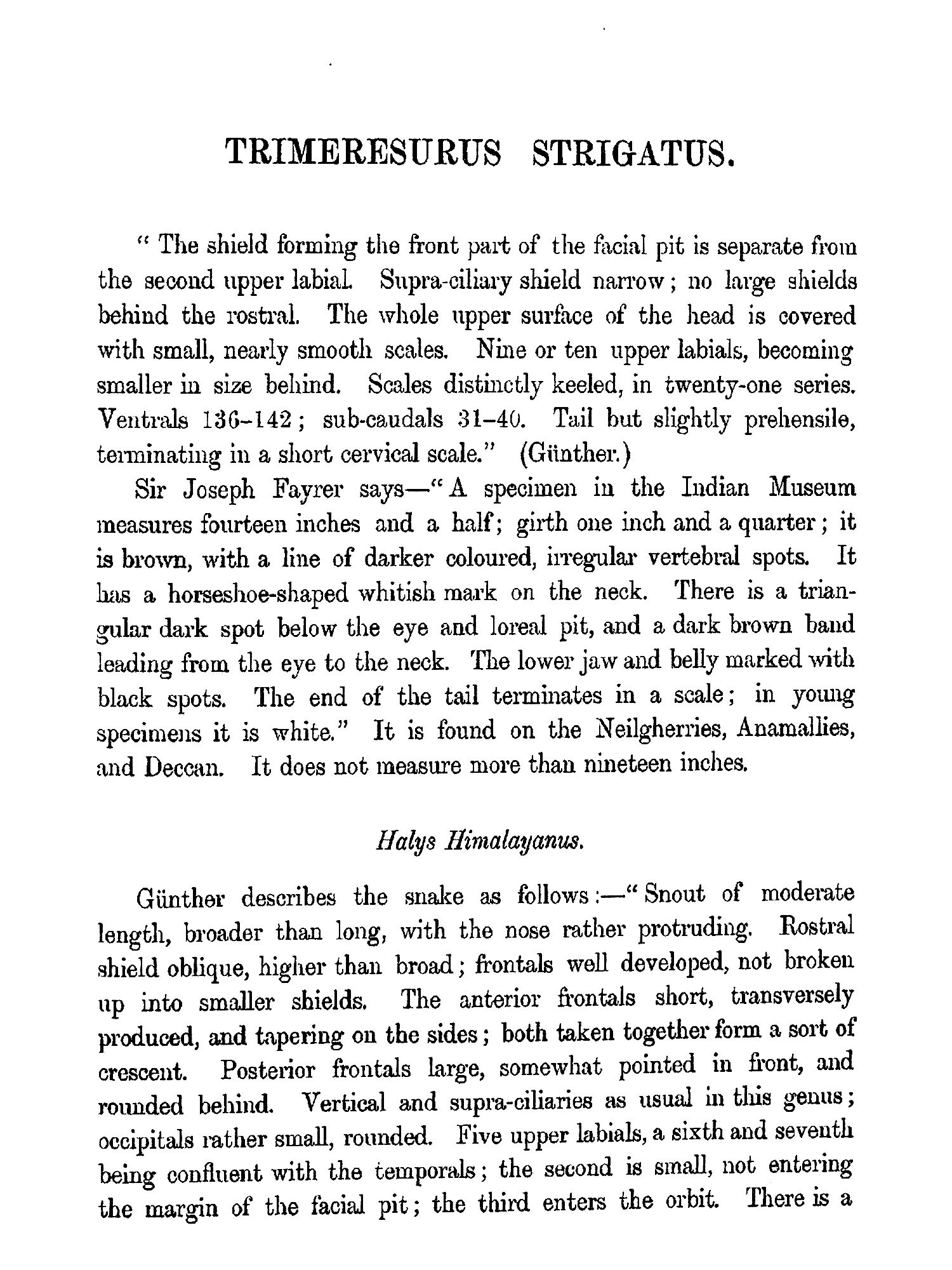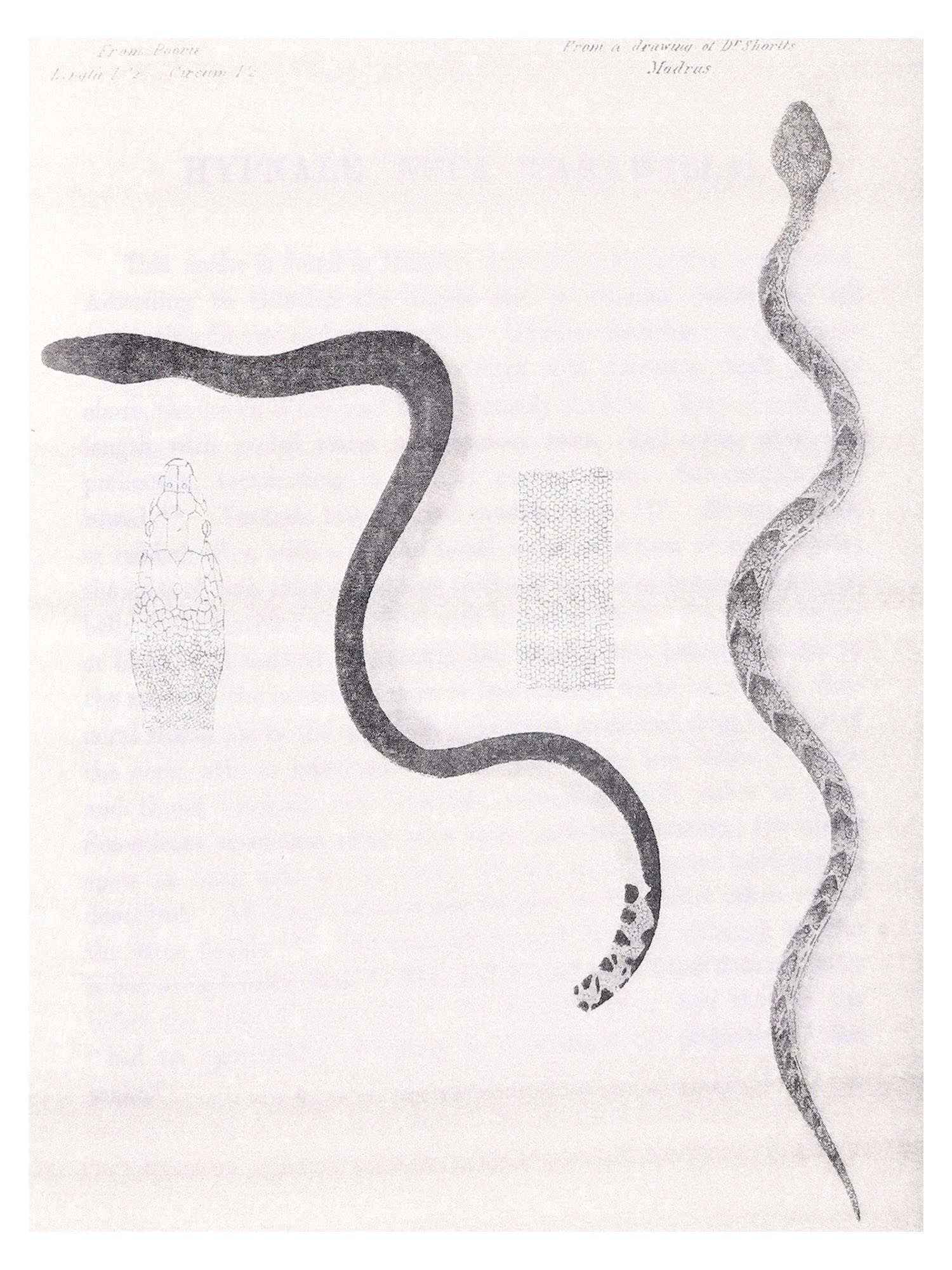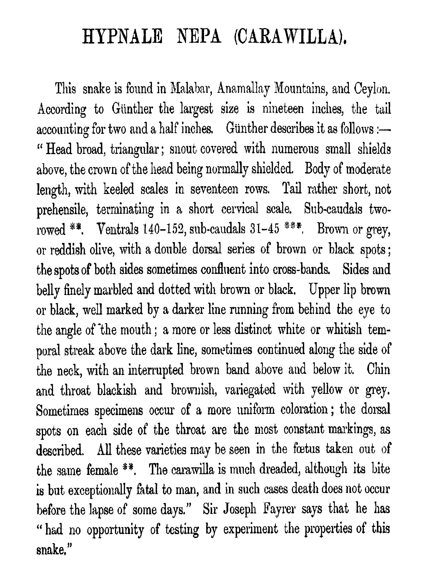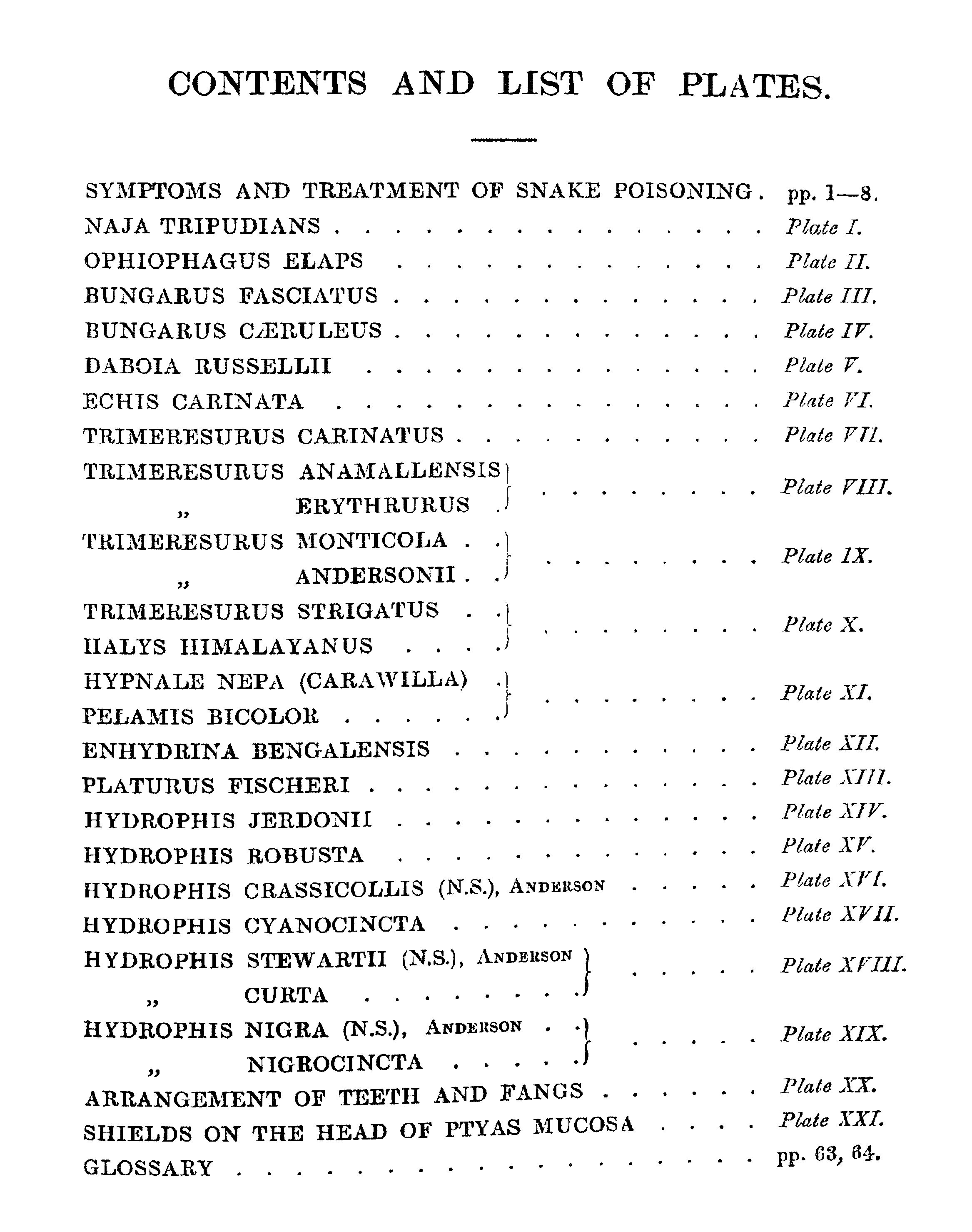 THE object contemplated in publishing this small work (which may be viewed as a supplement to Sir Joseph Fayrer's magnificent "Thanato-phidia of India") has been to place in the hands of the busy officials of India a handy-book, by means of which they may easily recognise any of the poisonous reptiles of the Peninsula. Sir Joseph Fayrer, K.C.S.I., when applied to, generously sanctioned the use of the beautiful plates figured in his Thanatophobia. The scientific descriptions of Günther, Fayrer, and Anderson have been preserved; but as all technical and other difficult terms have been fully explained in the Glossary, the text may be regarded as capable of being made intelligible to the mind of the ordinary reader. Any further attempt at popularising the work would have ended in redundancy, and rendered brevity and portability impossible. There is scarcely a term employed in the descriptions, which cannot at once be understood by a reference to the Glossary. The conciseness thus accomplished has enabled me generally to place the descriptions side by side with the Plates. This is a great advantage to men so fully employed as are the civil, medical, and police authorities of India. It is believed that this work will meet a real want. It will enable the hard-worked civil surgeon to identify, without much trouble, poisonous snakes, a matter of great import to him in the practice of his profession, and in his capacity as it may be the sole medical jurisprudent in his district. It will also enable the English speaking and reading officials of all grades and departments to distinguish poisonous from non-poisonous snakes.