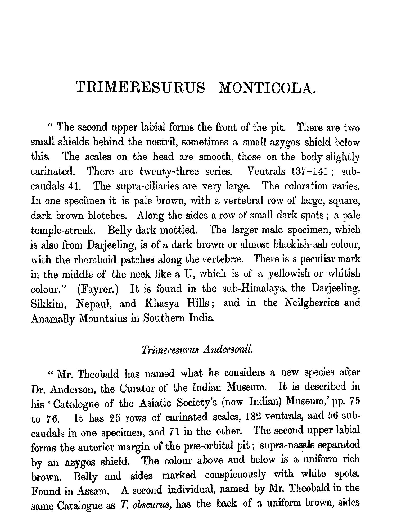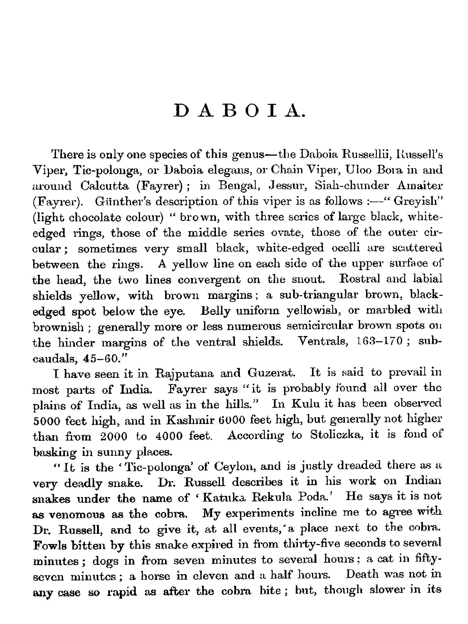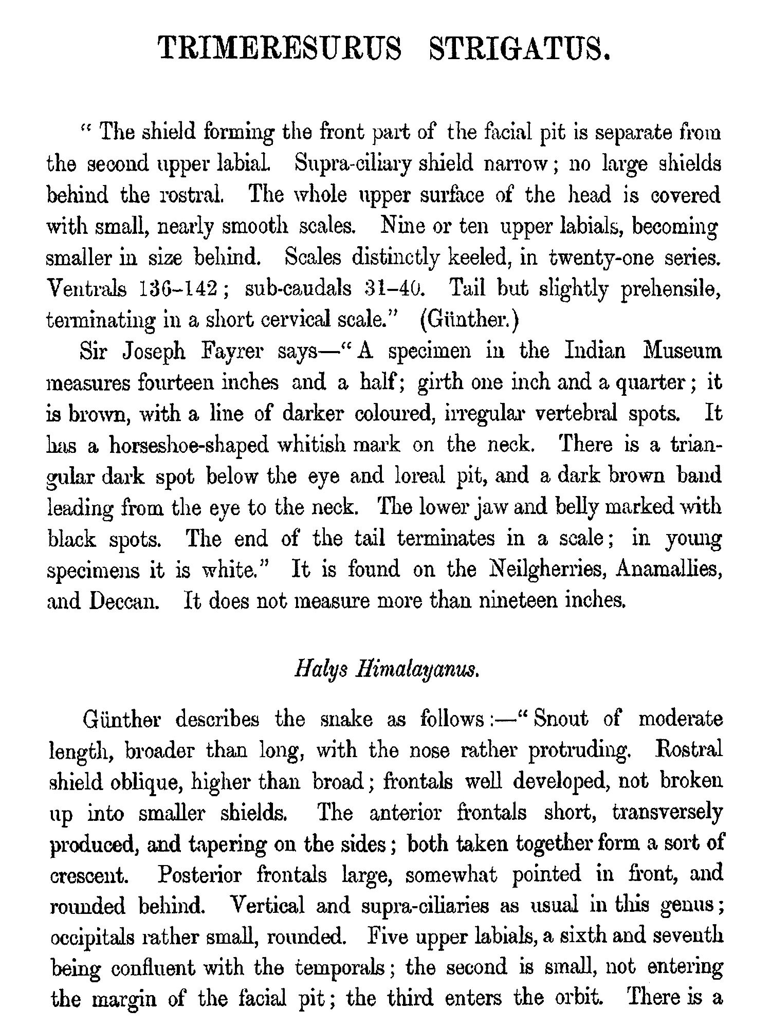 THE object contemplated in publishing this small work (which may be viewed as a supplement to Sir Joseph Fayrer's magnificent "Thanato-phidia of India") has been to place in the hands of the busy officials of India a handy-book, by means of which they may easily recognise any of the poisonous reptiles of the Peninsula. Sir Joseph Fayrer, K.C.S.I., when applied to, generously sanctioned the use of the beautiful plates figured in his Thanatophobia. The scientific descriptions of Günther, Fayrer, and Anderson have been preserved; but as all technical and other difficult terms have been fully explained in the Glossary, the text may be regarded as capable of being made intelligible to the mind of the ordinary reader. Any further attempt at popularising the work would have ended in redundancy, and rendered brevity and portability impossible. There is scarcely a term employed in the descriptions, which cannot at once be understood by a reference to the Glossary. The conciseness thus accomplished has enabled me generally to place the descriptions side by side with the Plates. This is a great advantage to men so fully employed as are the civil, medical, and police authorities of India. It is believed that this work will meet a real want. It will enable the hard-worked civil surgeon to identify, without much trouble, poisonous snakes, a matter of great import to him in the practice of his profession, and in his capacity as it may be the sole medical jurisprudent in his district. It will also enable the English speaking and reading officials of all grades and departments to distinguish poisonous from non-poisonous snakes.