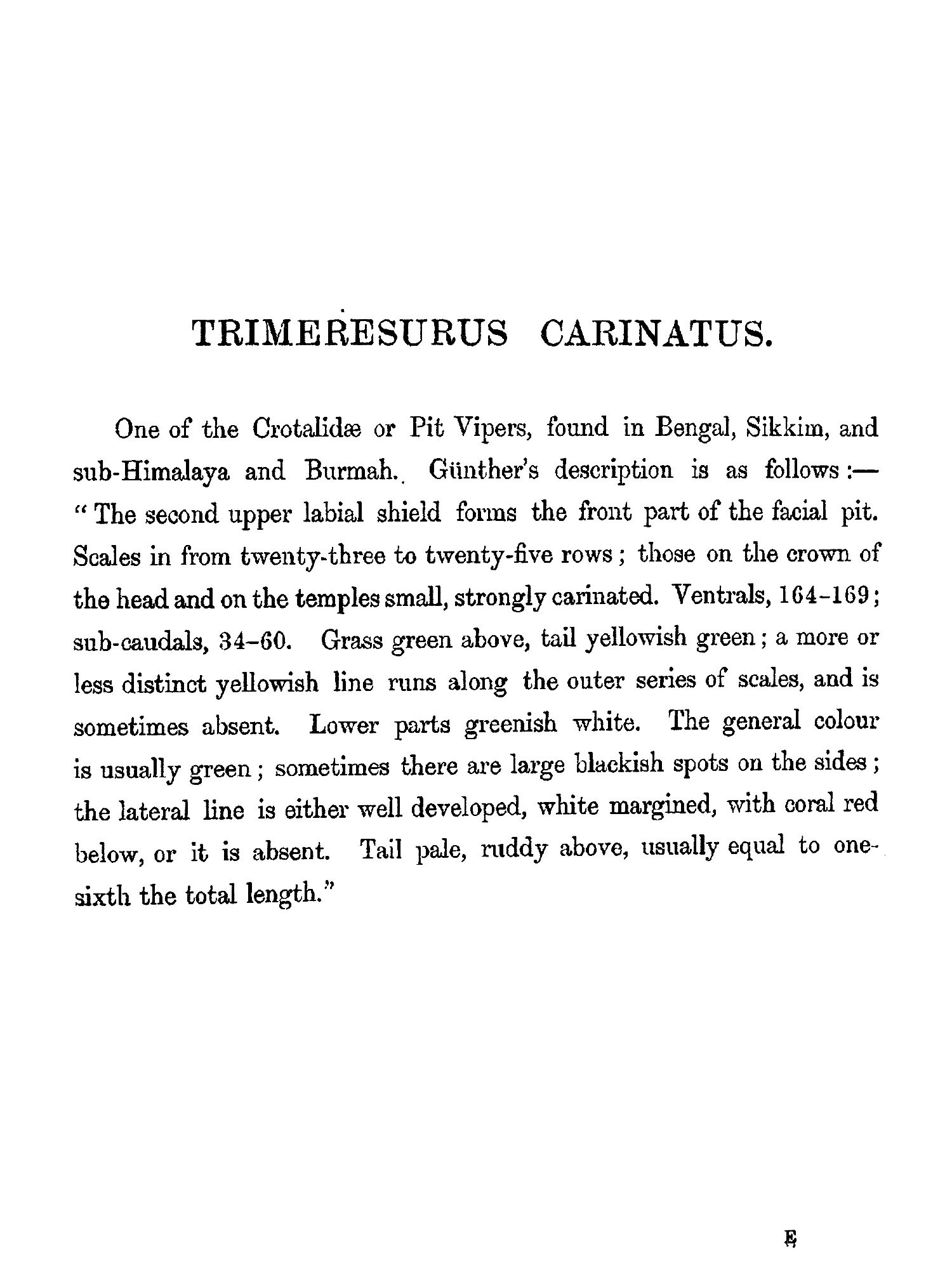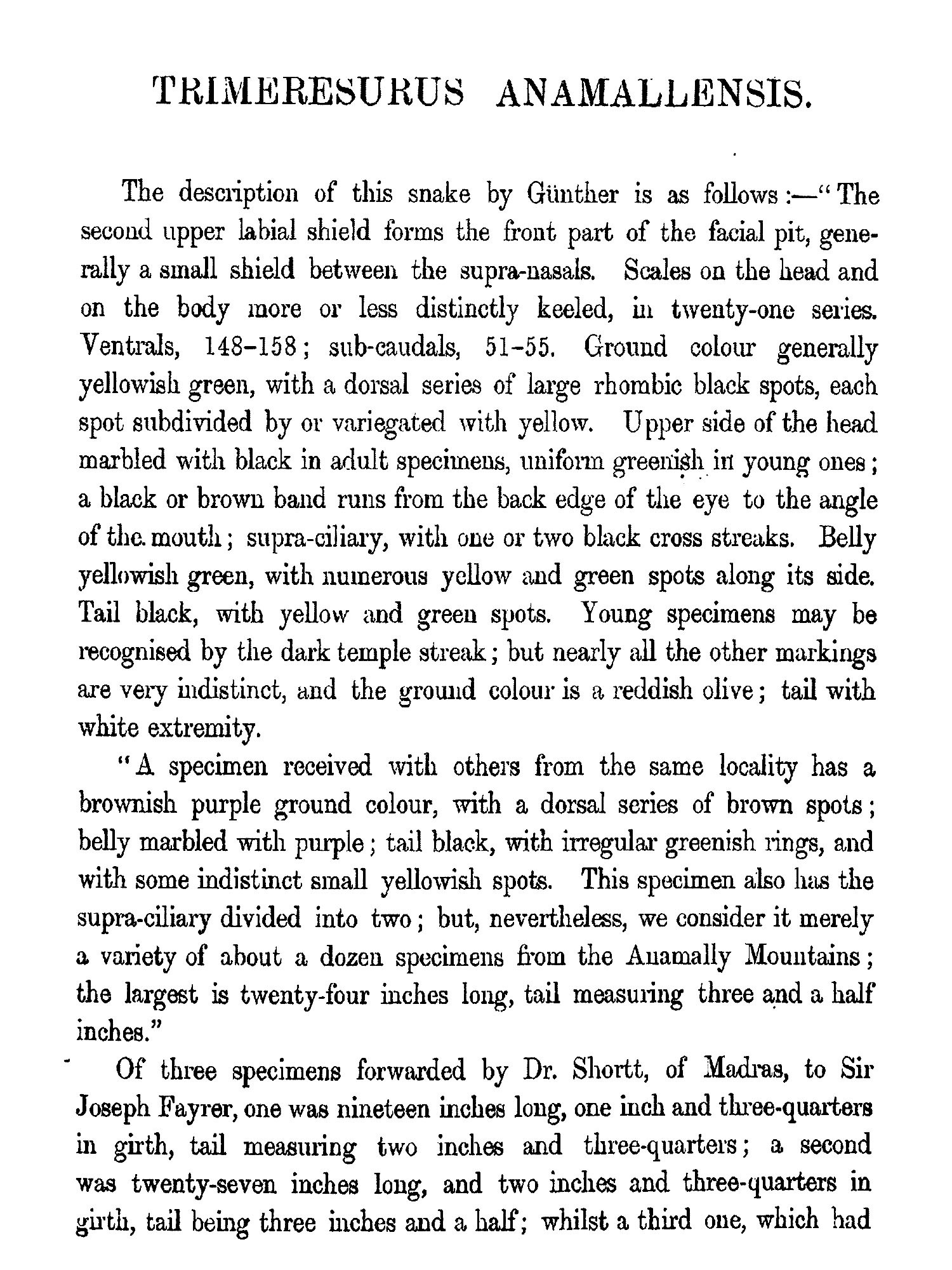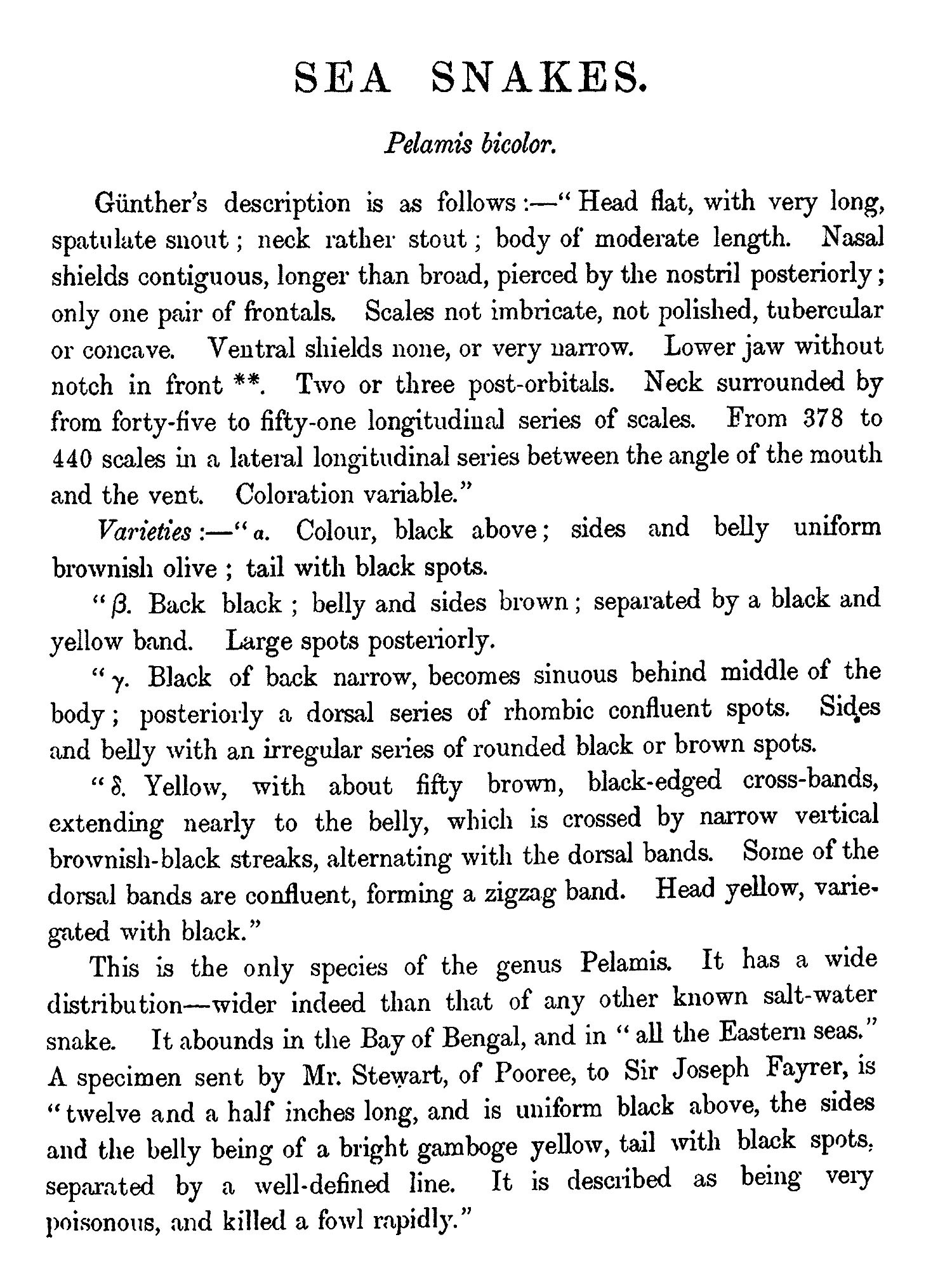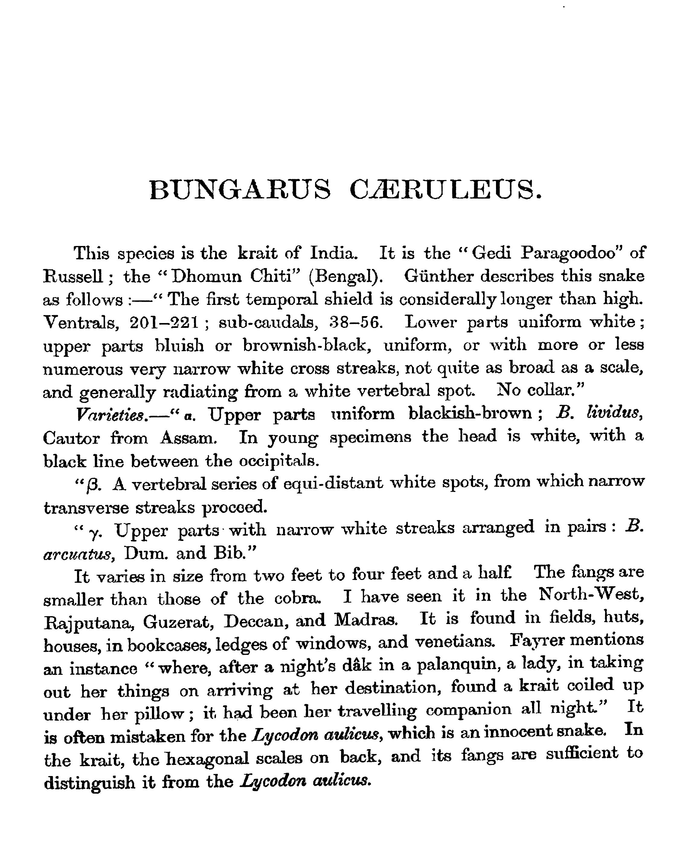 THE object contemplated in publishing this small work (which may be viewed as a supplement to Sir Joseph Fayrer's magnificent "Thanato-phidia of India") has been to place in the hands of the busy officials of India a handy-book, by means of which they may easily recognise any of the poisonous reptiles of the Peninsula. Sir Joseph Fayrer, K.C.S.I., when applied to, generously sanctioned the use of the beautiful plates figured in his Thanatophobia. The scientific descriptions of Günther, Fayrer, and Anderson have been preserved; but as all technical and other difficult terms have been fully explained in the Glossary, the text may be regarded as capable of being made intelligible to the mind of the ordinary reader. Any further attempt at popularising the work would have ended in redundancy, and rendered brevity and portability impossible. There is scarcely a term employed in the descriptions, which cannot at once be understood by a reference to the Glossary. The conciseness thus accomplished has enabled me generally to place the descriptions side by side with the Plates. This is a great advantage to men so fully employed as are the civil, medical, and police authorities of India. It is believed that this work will meet a real want. It will enable the hard-worked civil surgeon to identify, without much trouble, poisonous snakes, a matter of great import to him in the practice of his profession, and in his capacity as it may be the sole medical jurisprudent in his district. It will also enable the English speaking and reading officials of all grades and departments to distinguish poisonous from non-poisonous snakes.