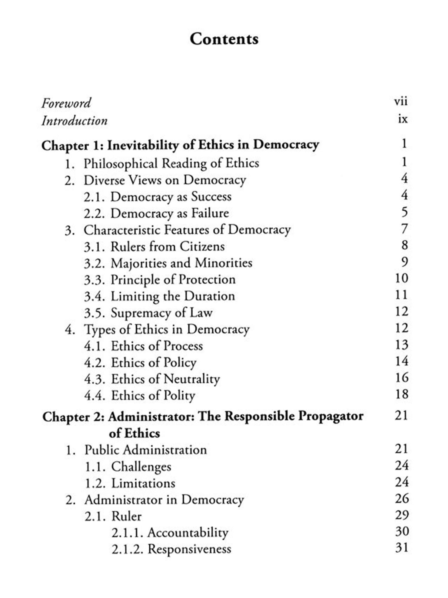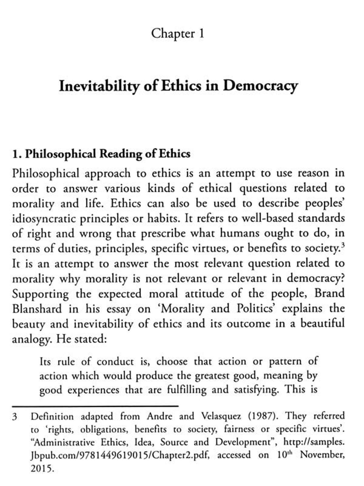 The first chapter, 'Inevitability of Ethics in Democracy', deals with the role of ethics in democracy. Unquestionably ethics plays a vital role every day at all the spheres including society, church, family, workplaces etc. Democracy is a form of government mostly accepted in the world. It is a way of life in which the members of society live, participate and cooperate each other. The merit of the democratic government is that it expresses at a collective level the ideal of the people's self-government. In a democrat form of government ethics takes the role of a commander to manifest its value and importance. Being a distinguishing factor, the good application of ethics decides the future of citizens and government in a democratic nation. Democracy is an ideal-seeking system that is committed to the common good, the good life, or that state of being where that which is good. This is the ultimate aspiration of democracy. Nonetheless, time and again it has been stated that, short of unremitting anarchy, democracy is the messiest form of government. That is to say, as Richard Stillman so artfully portrays in his article, ""The Peculiar 'Stateless' Origins of American Public Administration...."" there is nothing tidy, neat, orderly, or confidently predictable about the system of government we so ardently embrace.