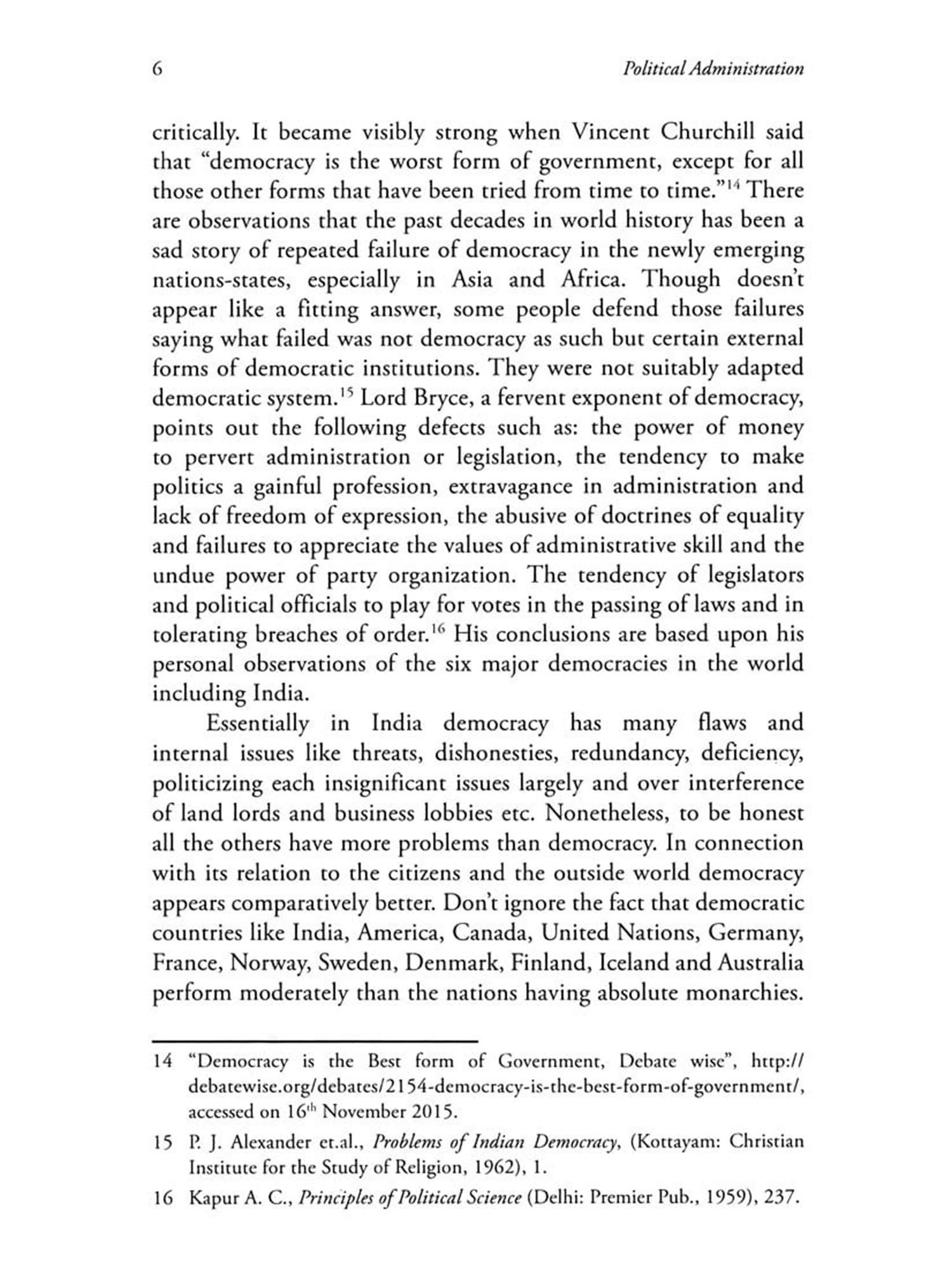 By integrating the democratic vision of Woodrow Wilson in his book, the author shows that democracy is a moral imperative promoting justice, equality and human rights. Wilson's politics-administration model is presented as one of the most predominant systems for democratic accountability in India. A democratic government has an obligation to treat everyone equally and to provide the greatest good to most of its citizens. However, Dr. Kachappilly observes that this caring aspect is an undiscovered fact in Indian democracy for decades. When elected office holders and appointed public administrators work together in collaboration, a democratic system could flourish and yield positive results. I appreciate Dr. Kachappilly on the occasion of the release of this book and wish him all the success in his academic journey.