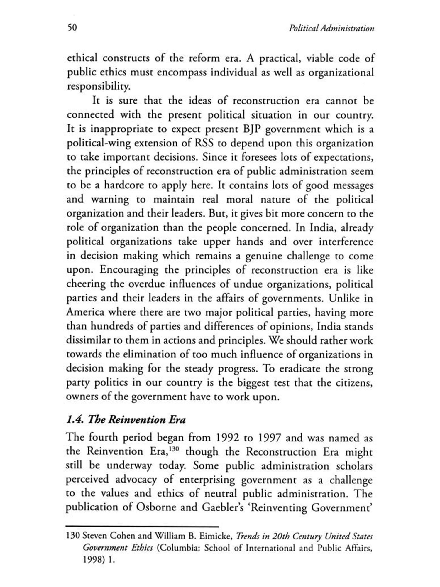 As an overview to the topics of public administration, ethics, and democracy, the chapters in this segment are brought together to demonstrate not only how wide in scope the topics can be extended, but also the depths to which they can be explored. The themes presented in each of these chapters regardless of directions from which they are approached, prove to be timeless in their relevance to twenty-first century government administrative systems. In this sense, they serve as opening way to the most persistent and pervasive at times, the most dynamic and dramatic aspects of ethics in public administration precisely in democracy. Linkages between ethics and democracy are, to a significant extent, forged by the calibre and character of how the public service is advanced in the name of democracy. These bonds are emphasized most distinctly by the philosopher-historian, Barry Karl, in his article, 'Public Administration and American History.' The topic of the thesis, ""Relevance of Ethics in Political Administration: An Administrative View of Democracy based on Woodrow Wilson's Politics-Administration Dichotomy', signifies a crucial but yet to manifest character of ethics in the democratic countries including India my mother country. It invites all administrators to be more ethical in their approach. The word administrator in the thesis stands for politicians, ministers, governments and bureaucrats. Critical and comparative methods are used to explore all ideas regarding the topic.